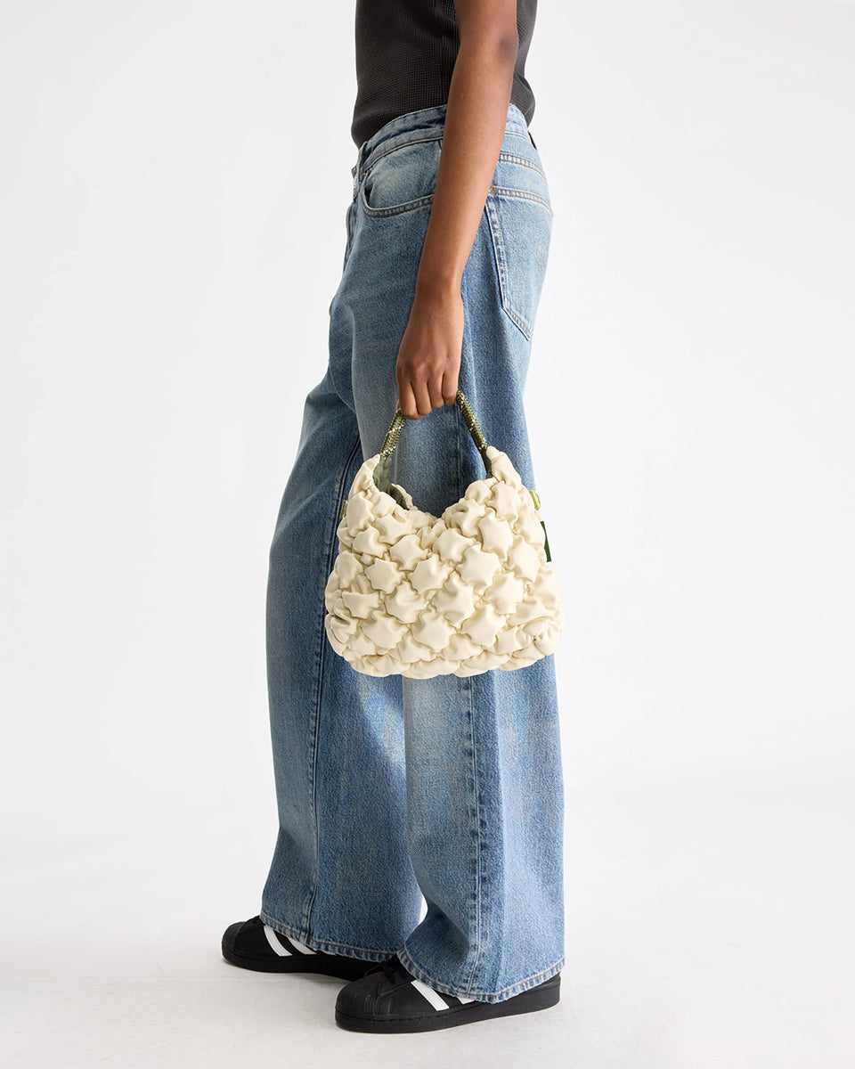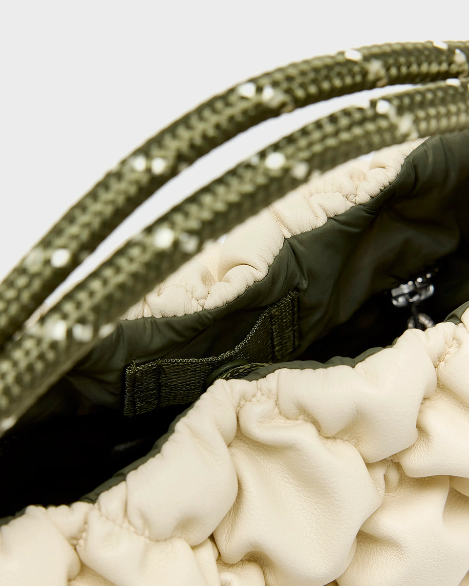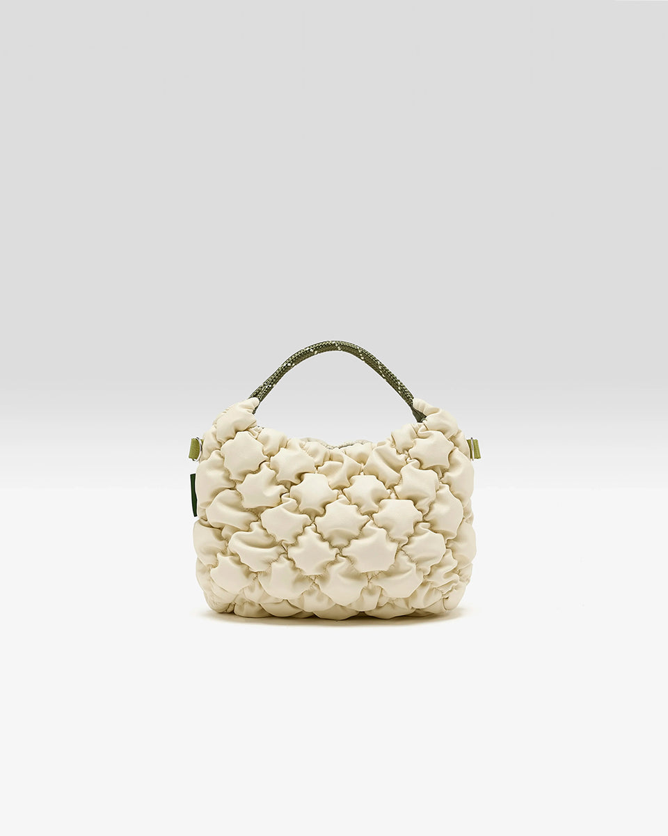 Pikowana torebka na ramię Helcro Cream marki BELLEROSE z kremowej skóry ekologicznej z teksturowanym wykończeniem. Zapinana na zatrzask. Posiada podwójne rączki ze sznurka oraz odpinany, regulowany pasek na ramię. Wewnątrz ma podszewkę w kolorze khaki oraz kieszeń zapinaną na zamek, z naszywką z logo marki.