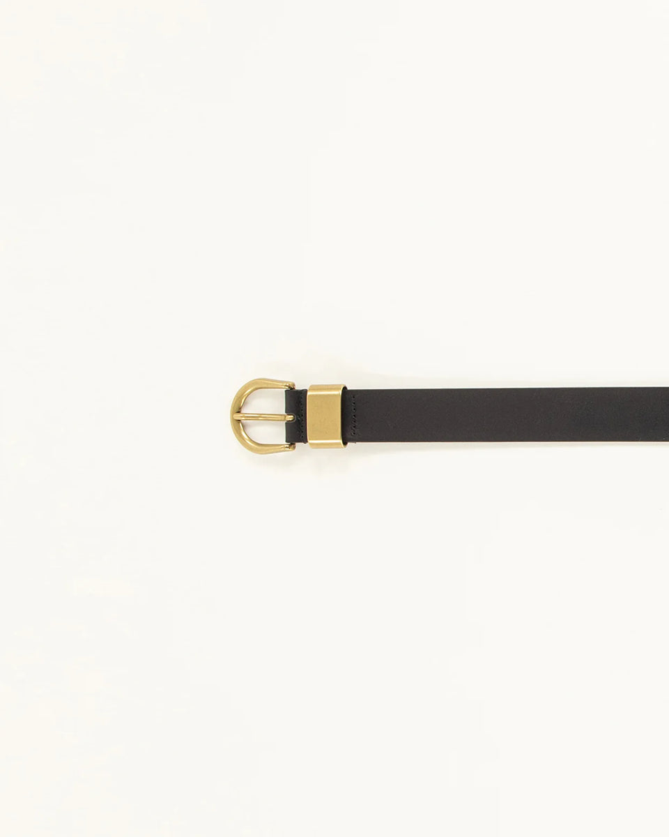 Skórzany pasek Miloa Black marki Sessun wykonany ze skóry krowiej, z grawerowaną klamrą i metalową szlufką.