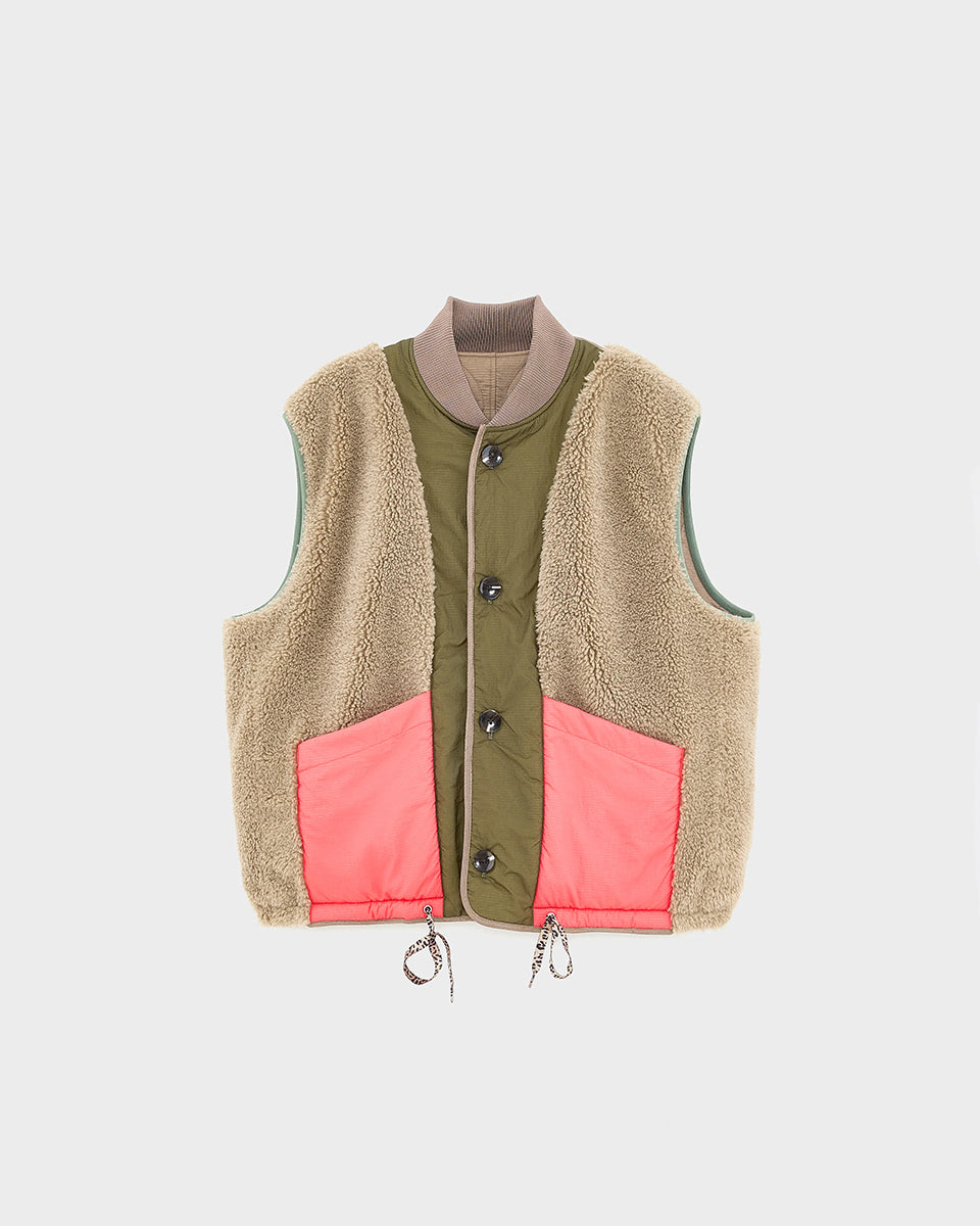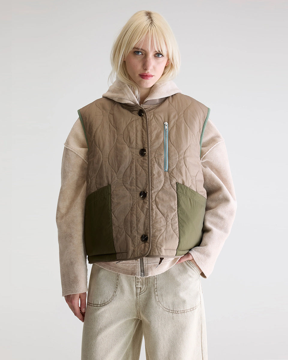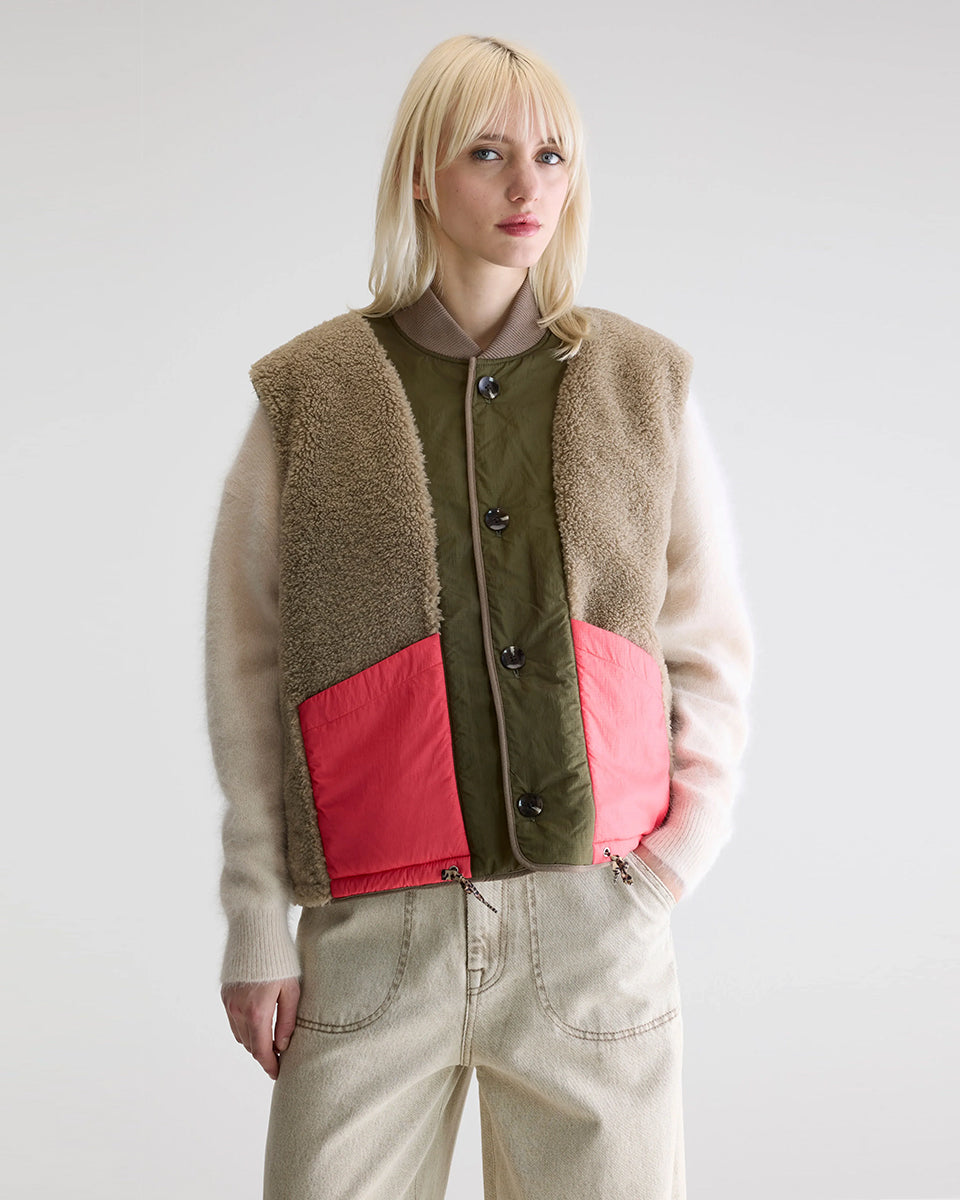 Ciepła, dwustronna kamizelka o pudełkowym fasonie Hamilton Bellerose. Z jednej strony wykonana z pikowanej, śliskiej tkaniny z drugiej ze sztucznego futra. Dekorowana kolorowymi detalami. Zapinana na guziki. Posiada wysoki wysoki kołnierzyk z prążkowanej tkaniny. Połącz ją z t-shirtem, cienkim longsleevem lub swetrem.