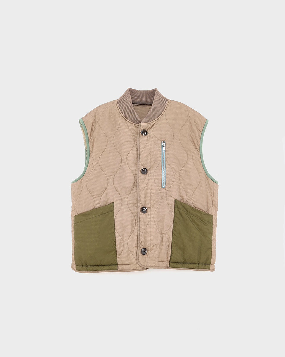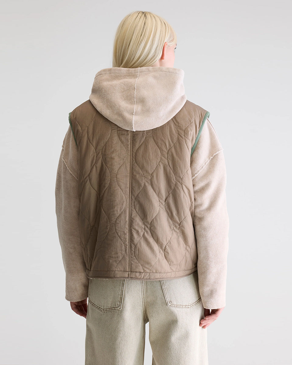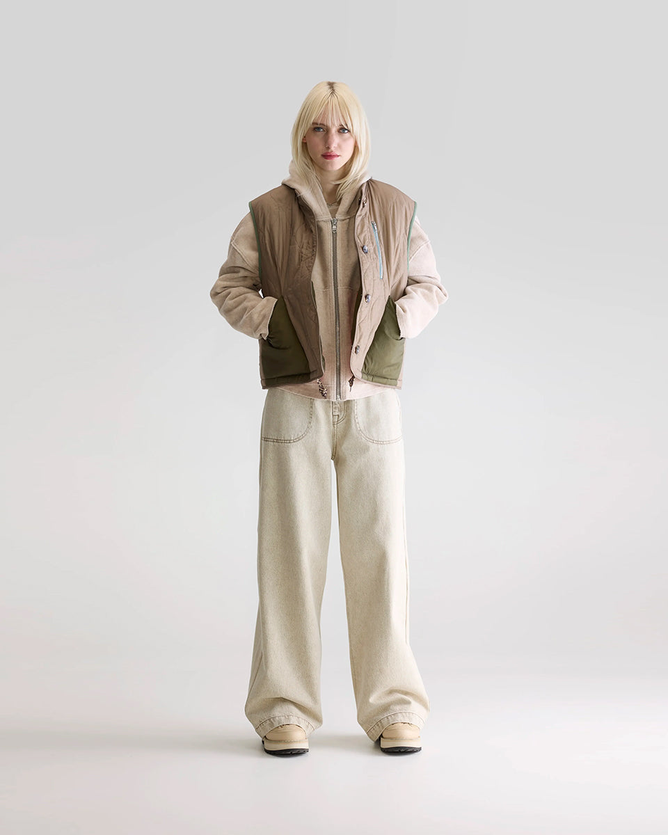 Ciepła, dwustronna kamizelka o pudełkowym fasonie Hamilton Bellerose. Z jednej strony wykonana z pikowanej, śliskiej tkaniny z drugiej ze sztucznego futra. Dekorowana kolorowymi detalami. Zapinana na guziki. Posiada wysoki wysoki kołnierzyk z prążkowanej tkaniny. Połącz ją z t-shirtem, cienkim longsleevem lub swetrem.