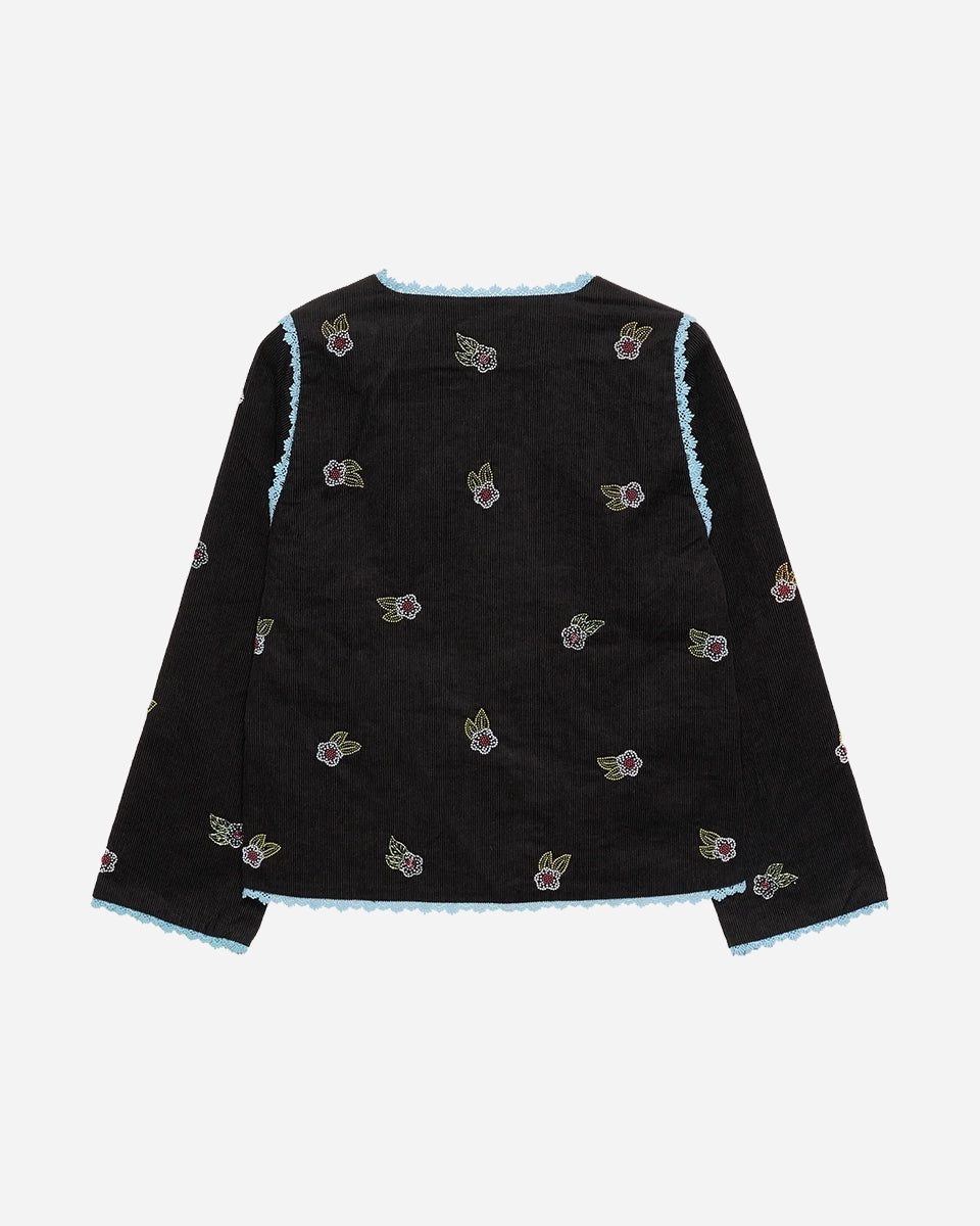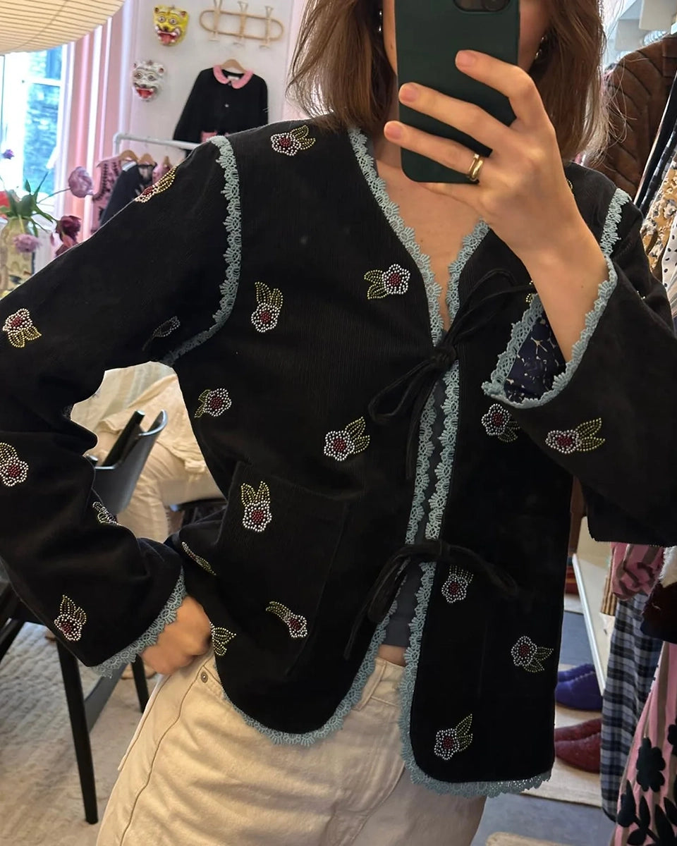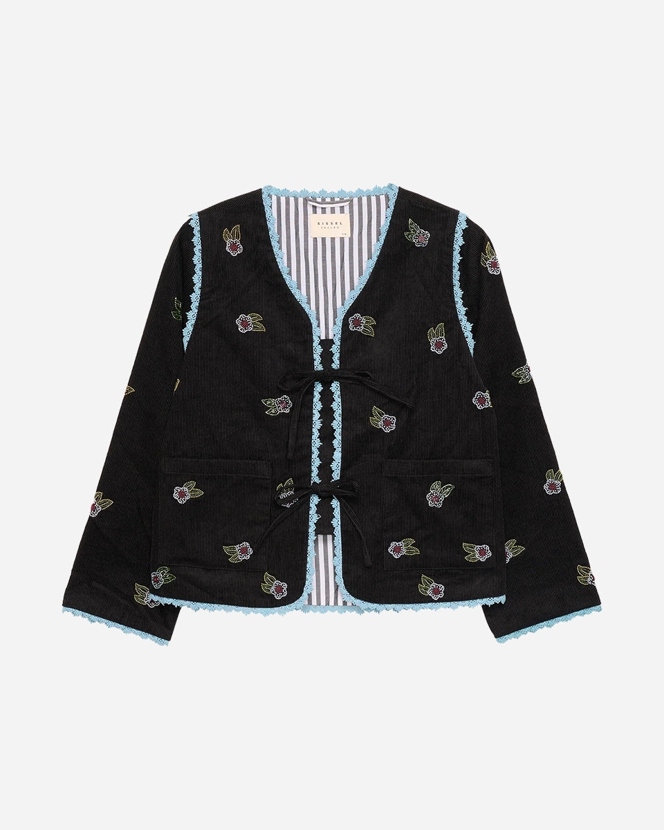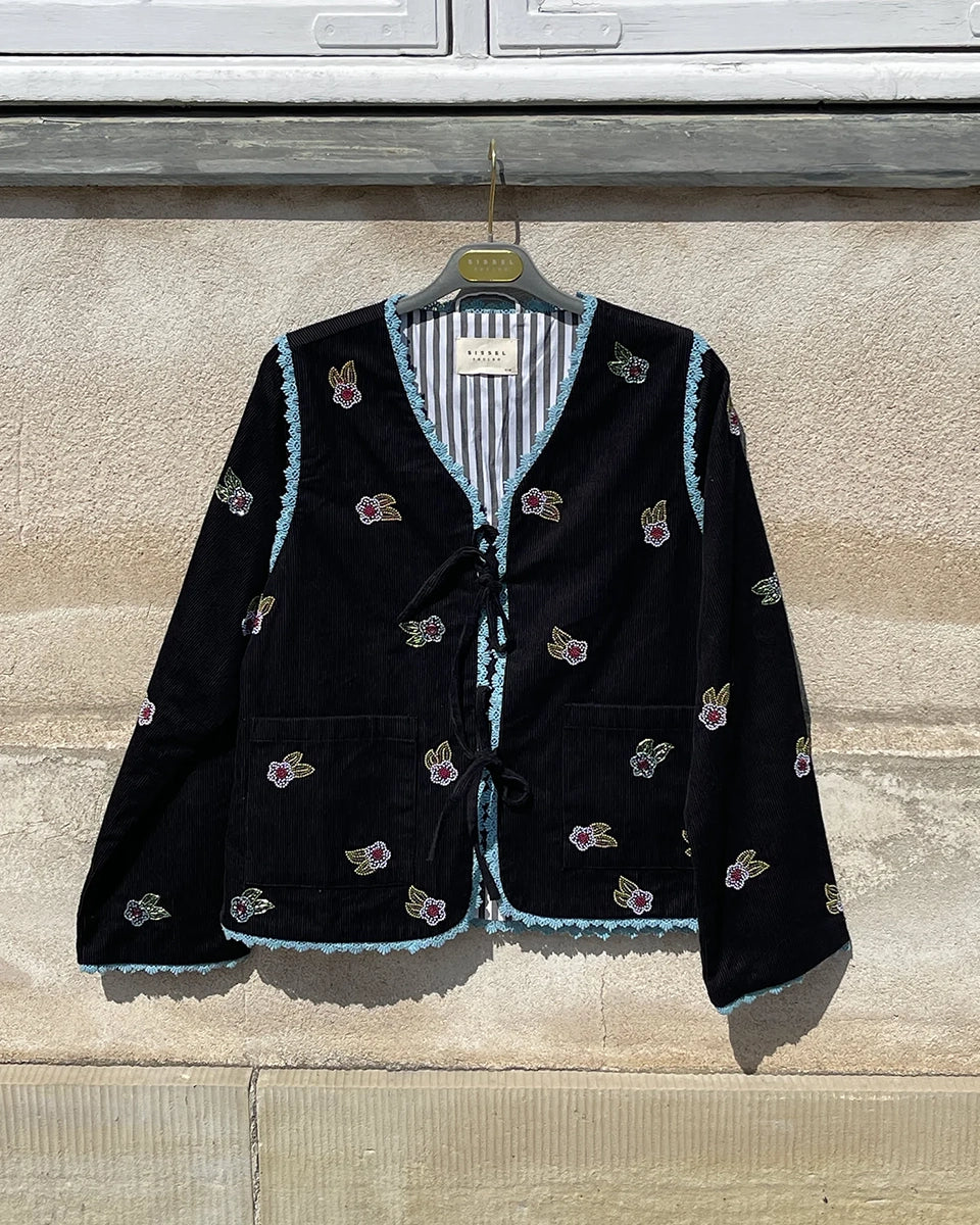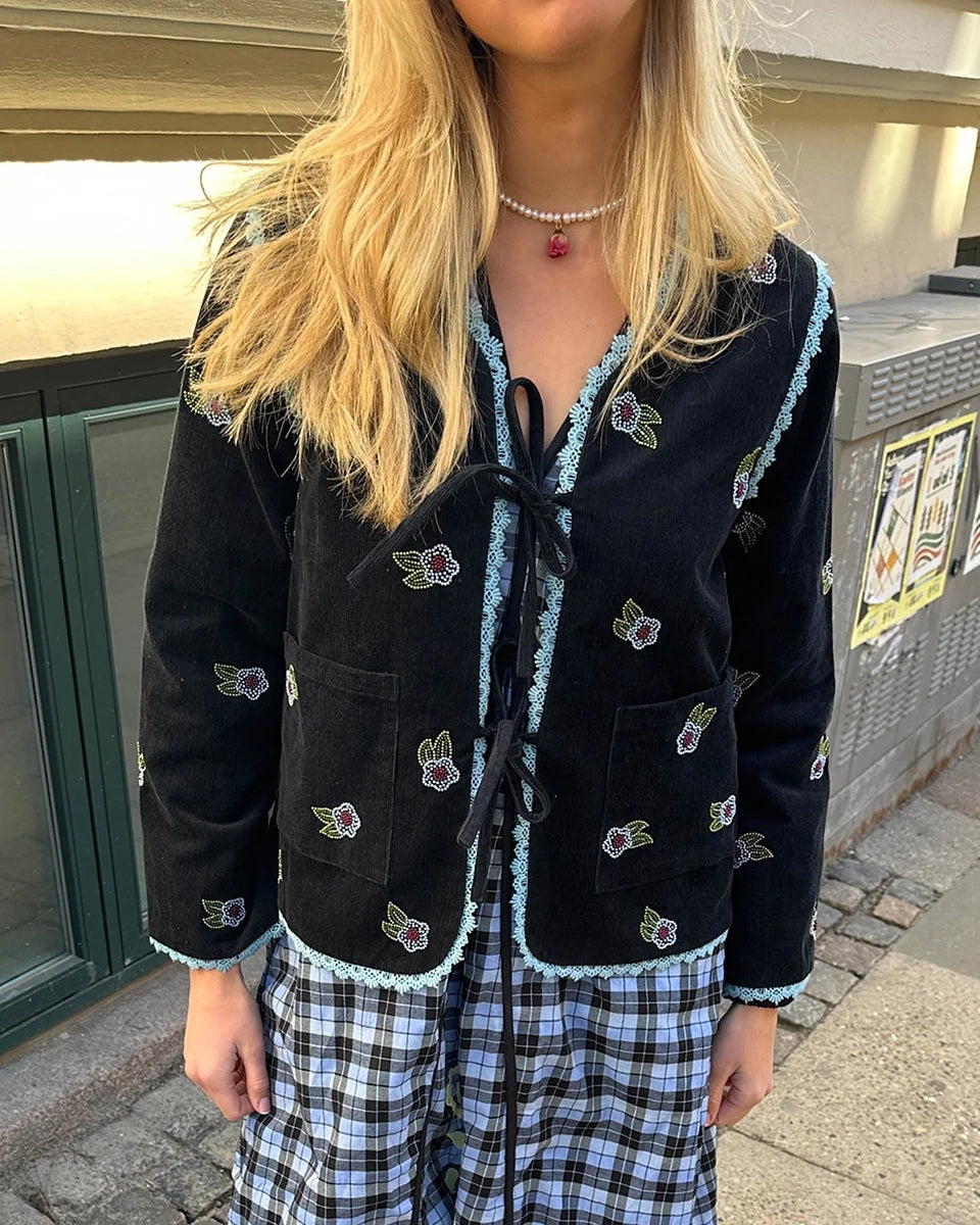 Cienka, krótka, sztruksowa kurtka Tahlia SISSEL EDELBO z trójkątnym dekoltem, wiązana z przodu na kokardki. Wyszywana kolorowymi, drobnymi koralikami w uroczy, kwiatowy wzór. Wykończona drobną, kontrastową koronką.  Z przodu posiada dwie kieszenie.