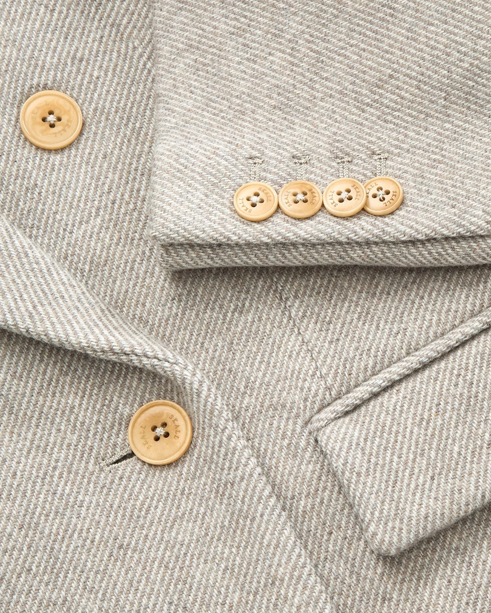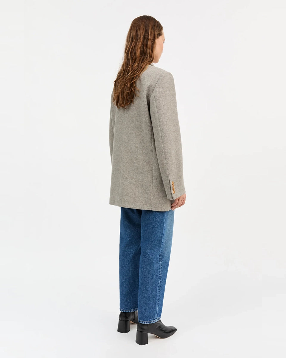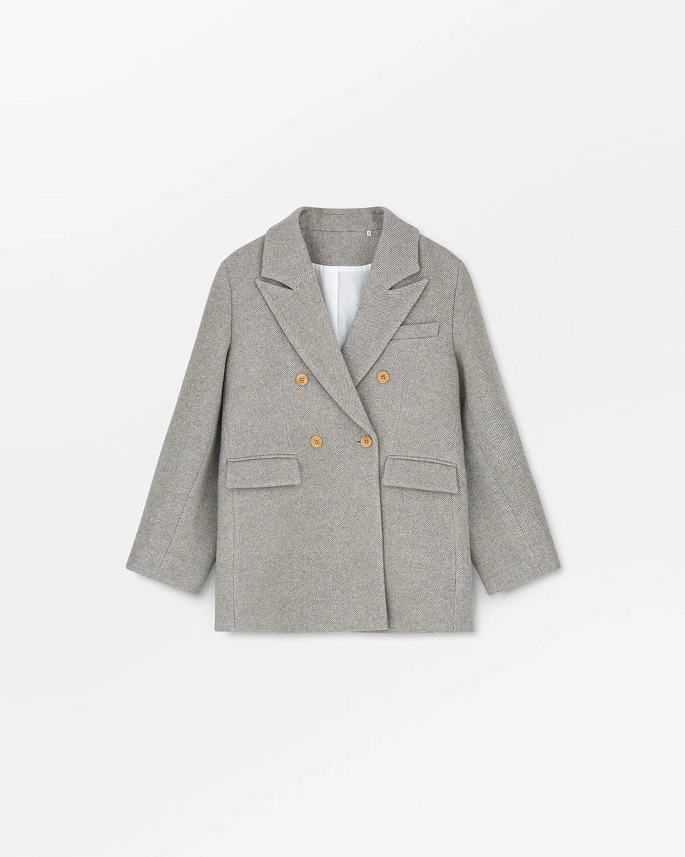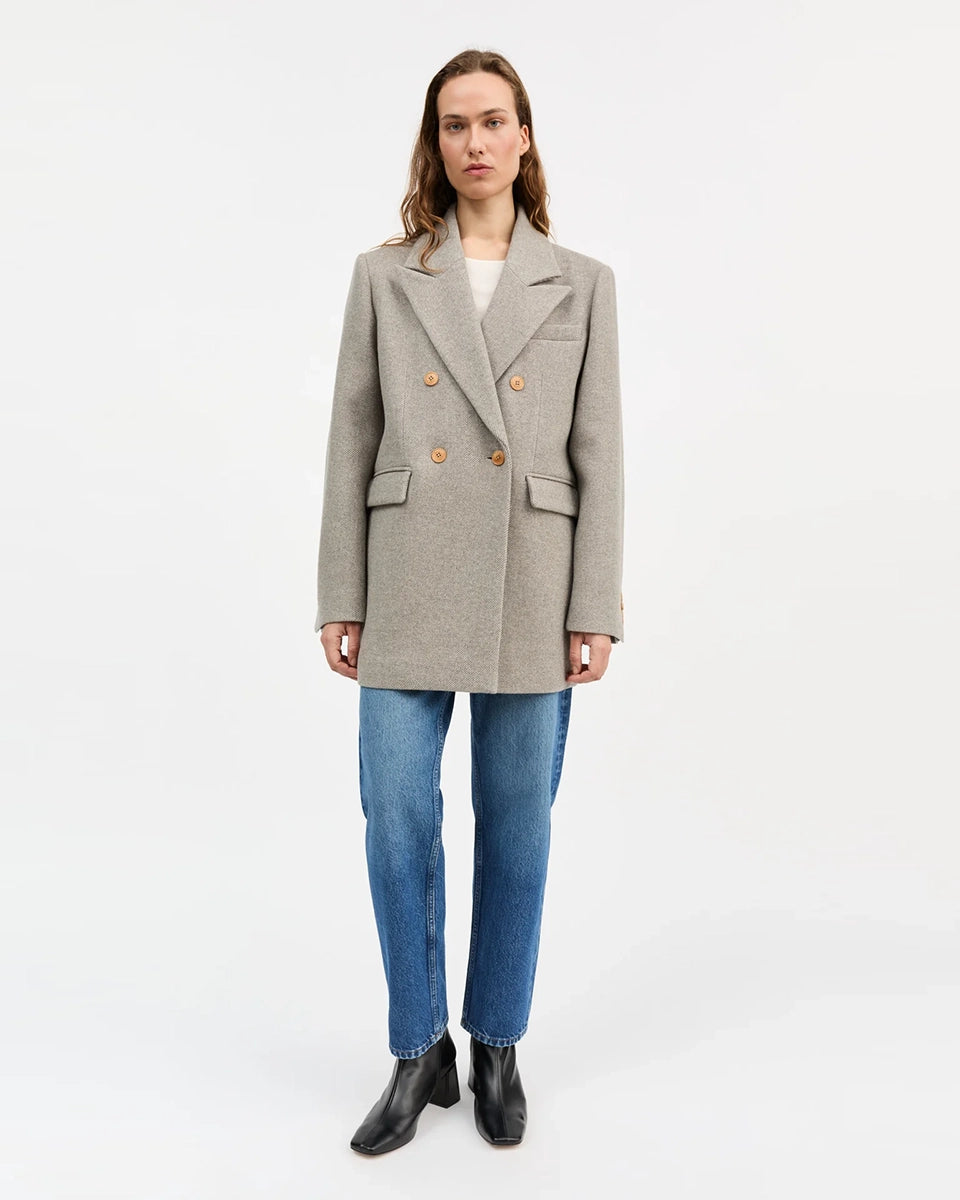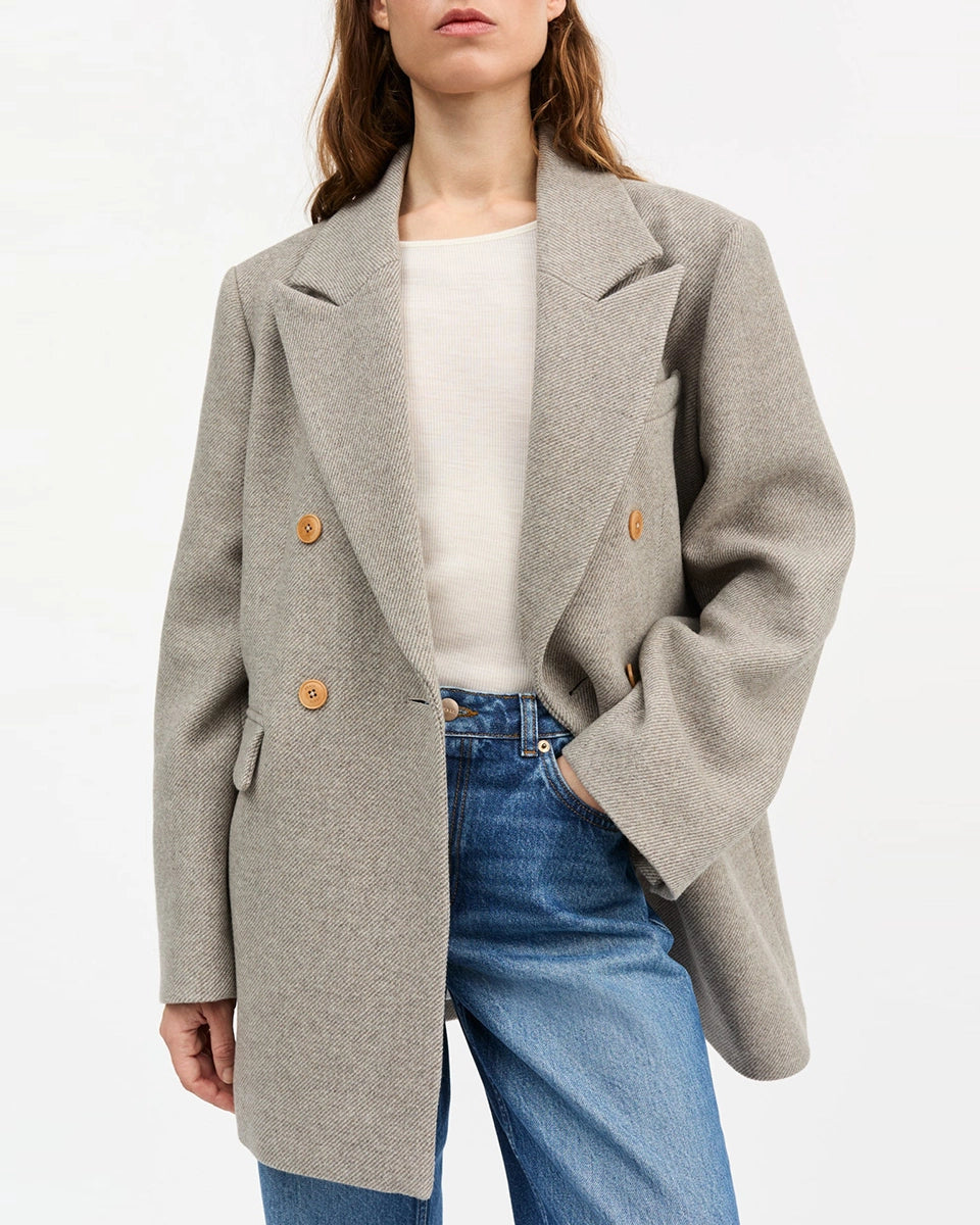 Gruba, długa marynarka z wełny w drobne, skośne prążki Mick SKALL zapinana na dwa rzędy guzików. Posiada prosty krój i długość za biodra. Marynarka ma duży kołnierz, niewielką kieszonkę nad lewą piersią i dwie, przednie kieszenie z klapkami. Przy mankietach zapinana na rząd drobnych guzików. Posiada podszewkę. Idealna z jeansami.