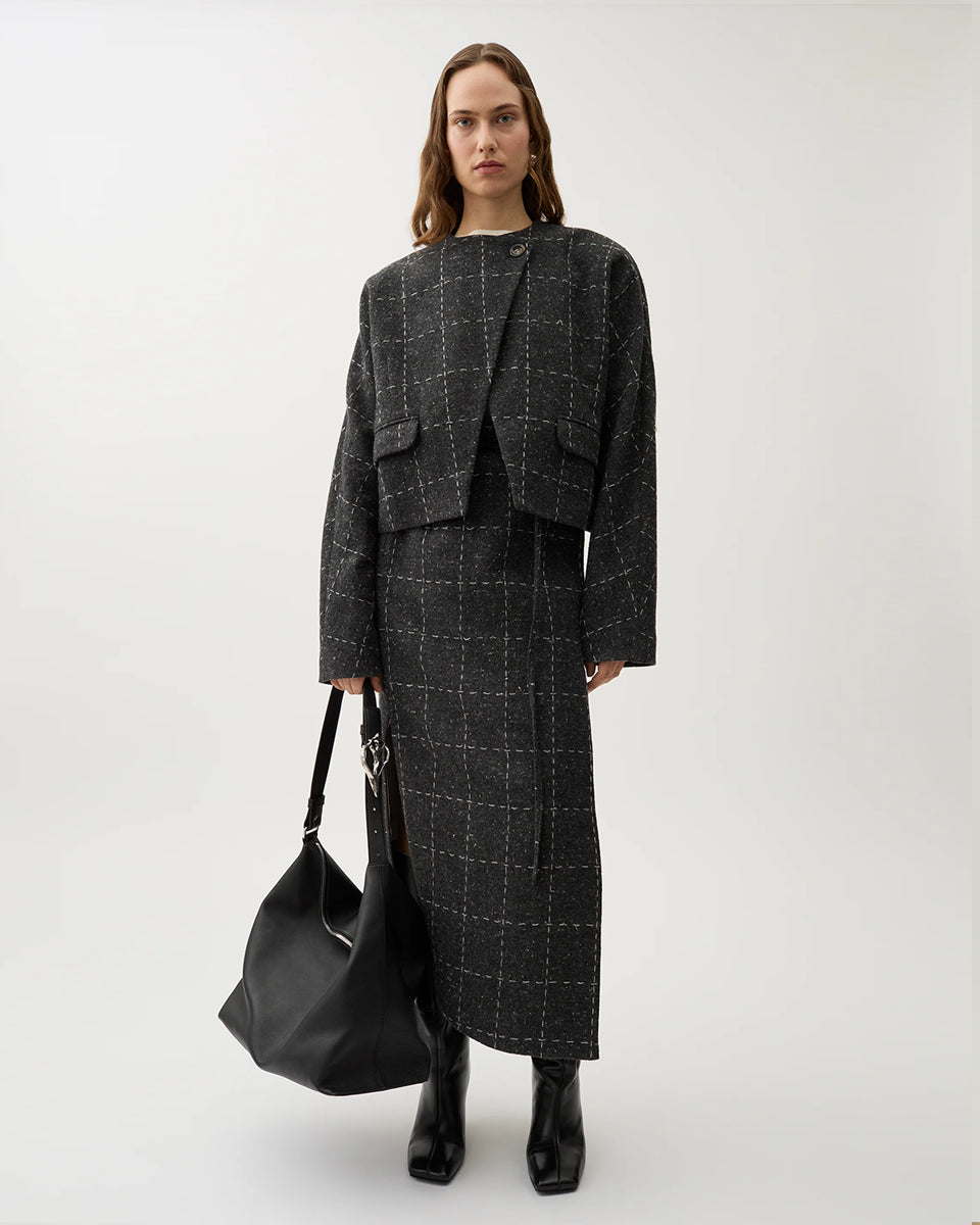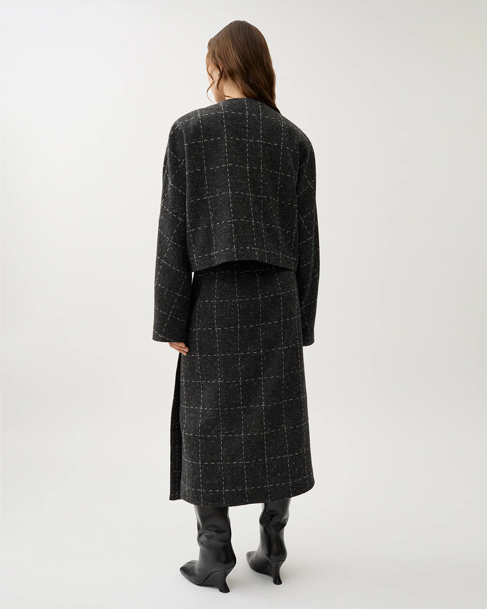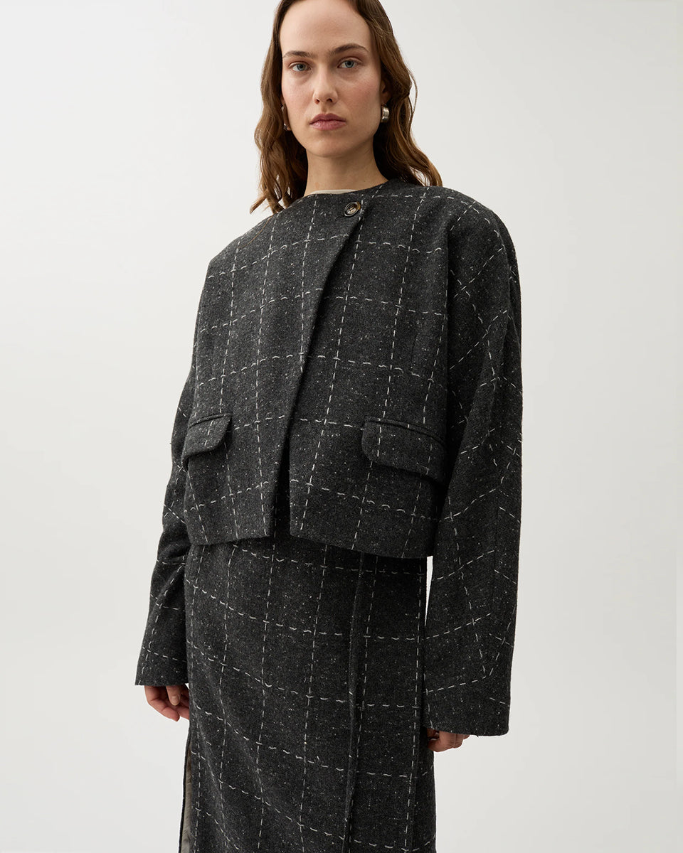 Krótka, luźna marynarka Zola Check Grey Melange w kolorze ciemnoszarym w kratkę z szerokimi rękawami i okrągłym dekoltem. Jest zapinana na jeden guzik pod szyją i posiada kieszenie boczne. Wykonana z mieszanki wełny. Zestaw ją z spódnicą Blanket Check lub ulubionymi jeansami.