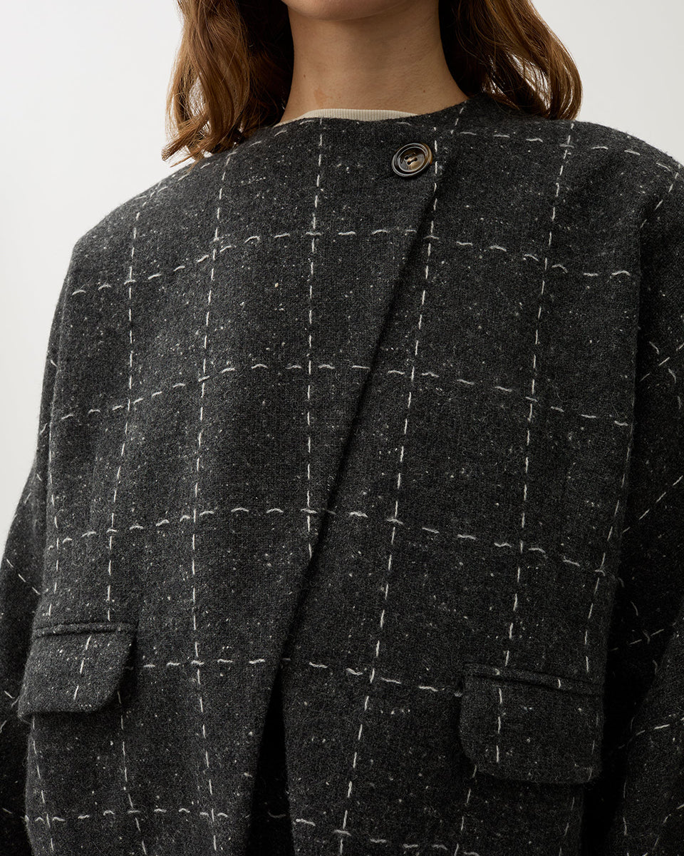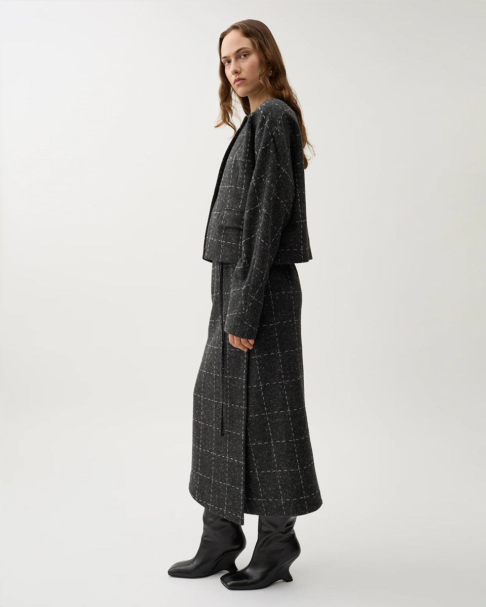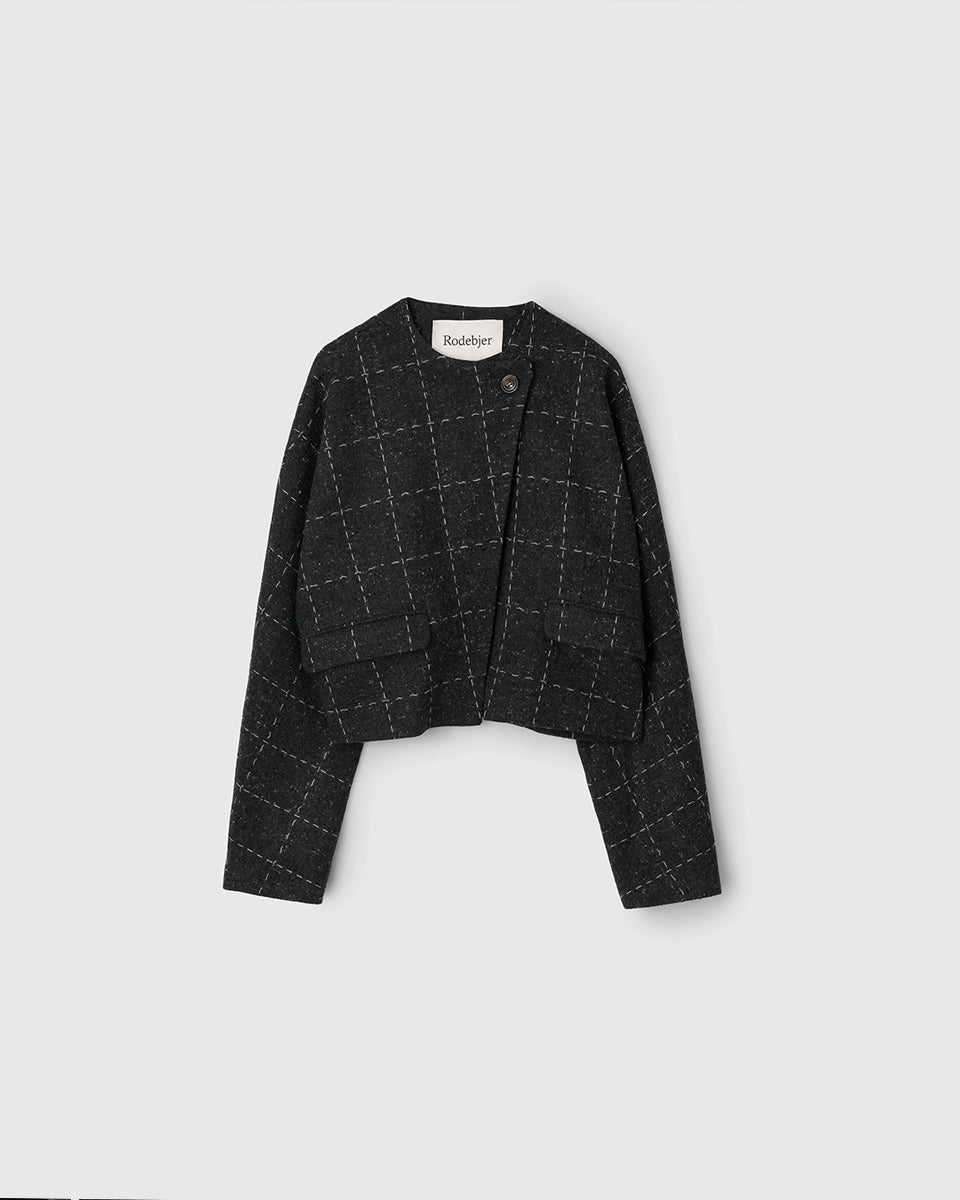 Krótka, luźna marynarka Zola Check Grey Melange w kolorze ciemnoszarym w kratkę z szerokimi rękawami i okrągłym dekoltem. Jest zapinana na jeden guzik pod szyją i posiada kieszenie boczne. Wykonana z mieszanki wełny. Zestaw ją z spódnicą Blanket Check lub ulubionymi jeansami.