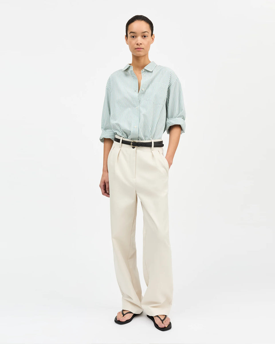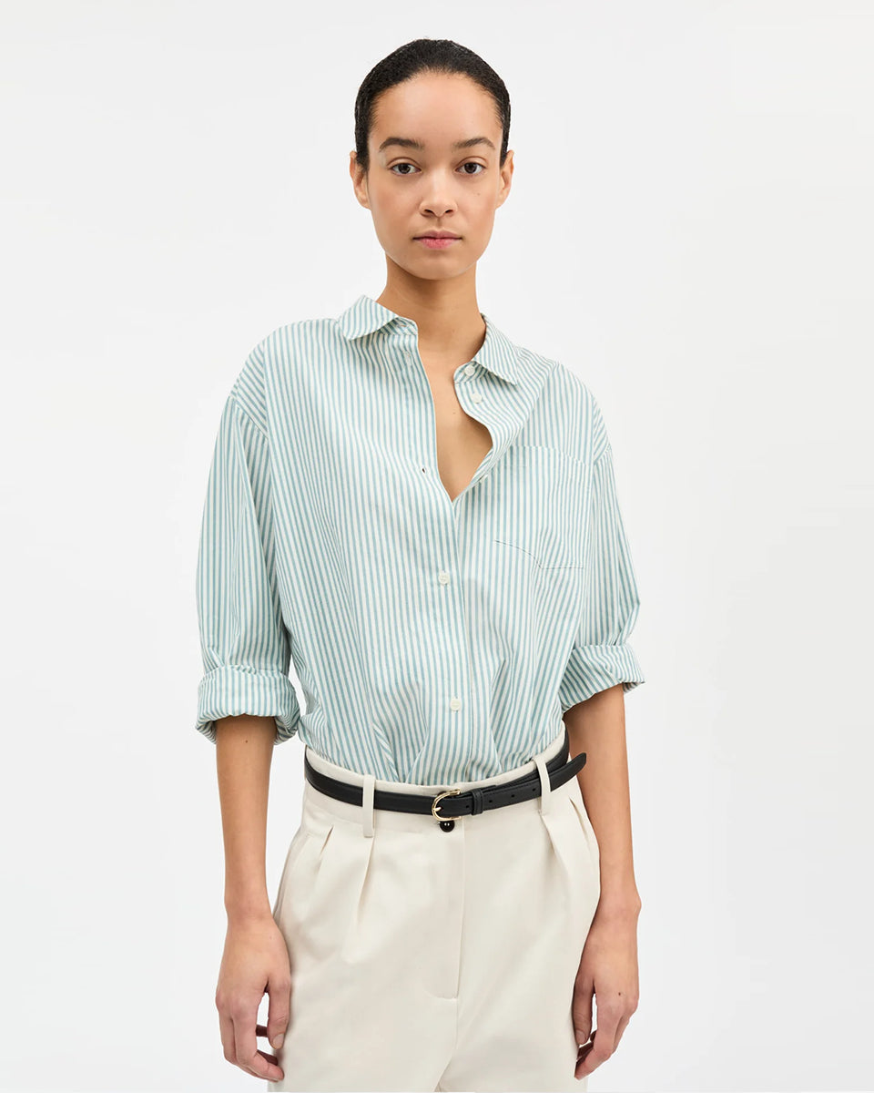 Klasyczna, bawełniana koszula w paski Edgar SKALL inspirowana modą męską. Posiada prosty krój i luźny fason. Koszula ma kołnierzyk, kieszonkę na lewej piersi i długie rękawy zakończone mankietami. Zapinana na kontrastowe guziki. Na plecach ma zakładkę. Wykonana ze sztywnej bawełny organicznej. Idealna na co dzień i do pracy.