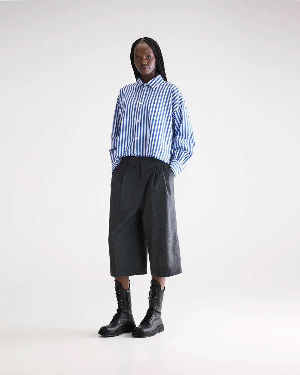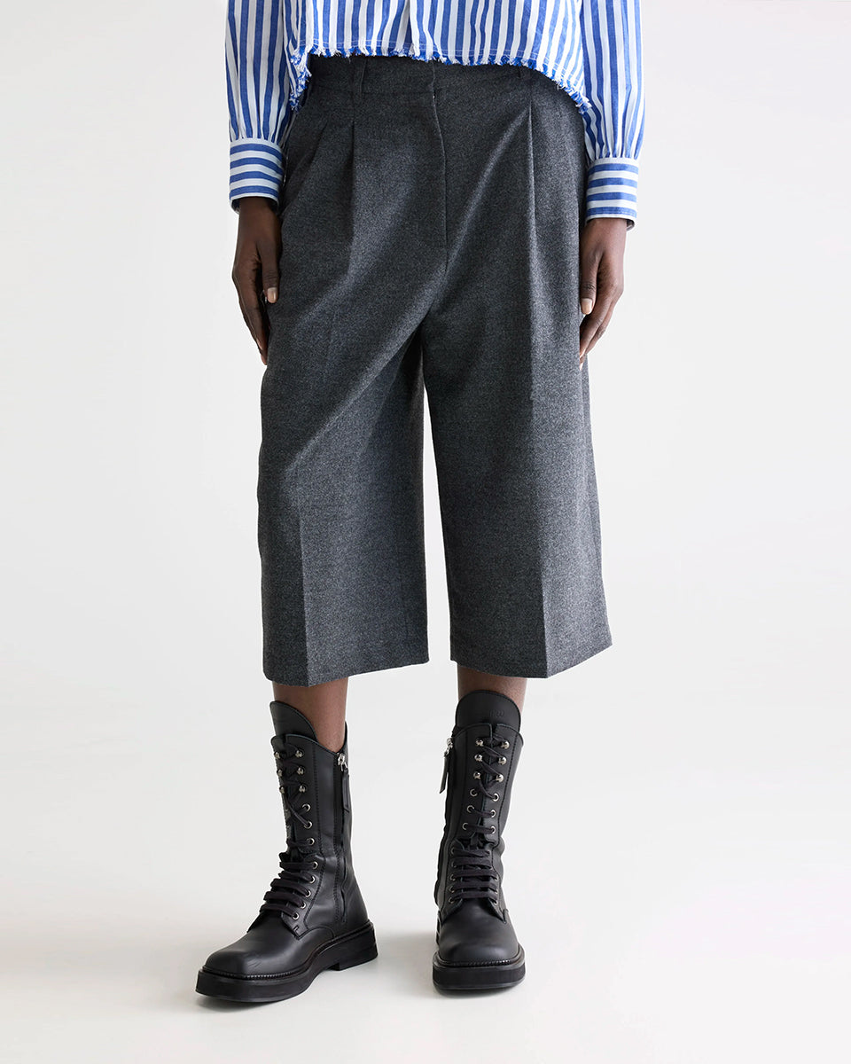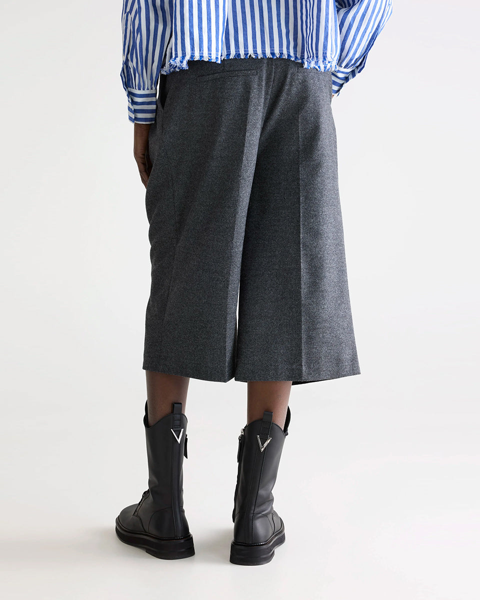 Garniturowe bermudy Dom Bellerose z wysokim stanem i zakładkami. Szorty mają szeroką, prostą nogawkę, dwie boczne i dwie tylne kieszenie. Spodnie mają długość za kolana. Wykonane z tkaniny z wełną.