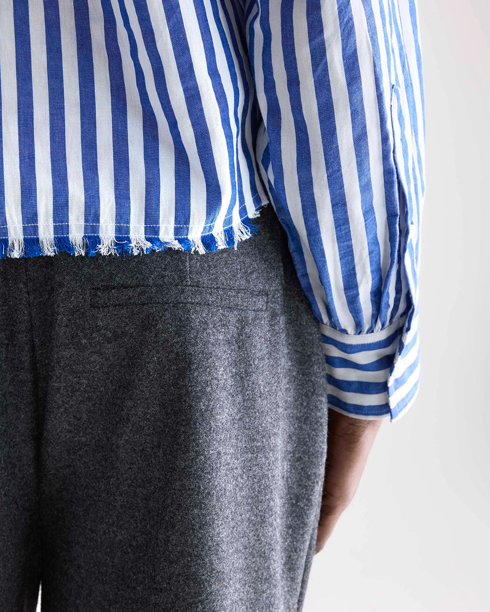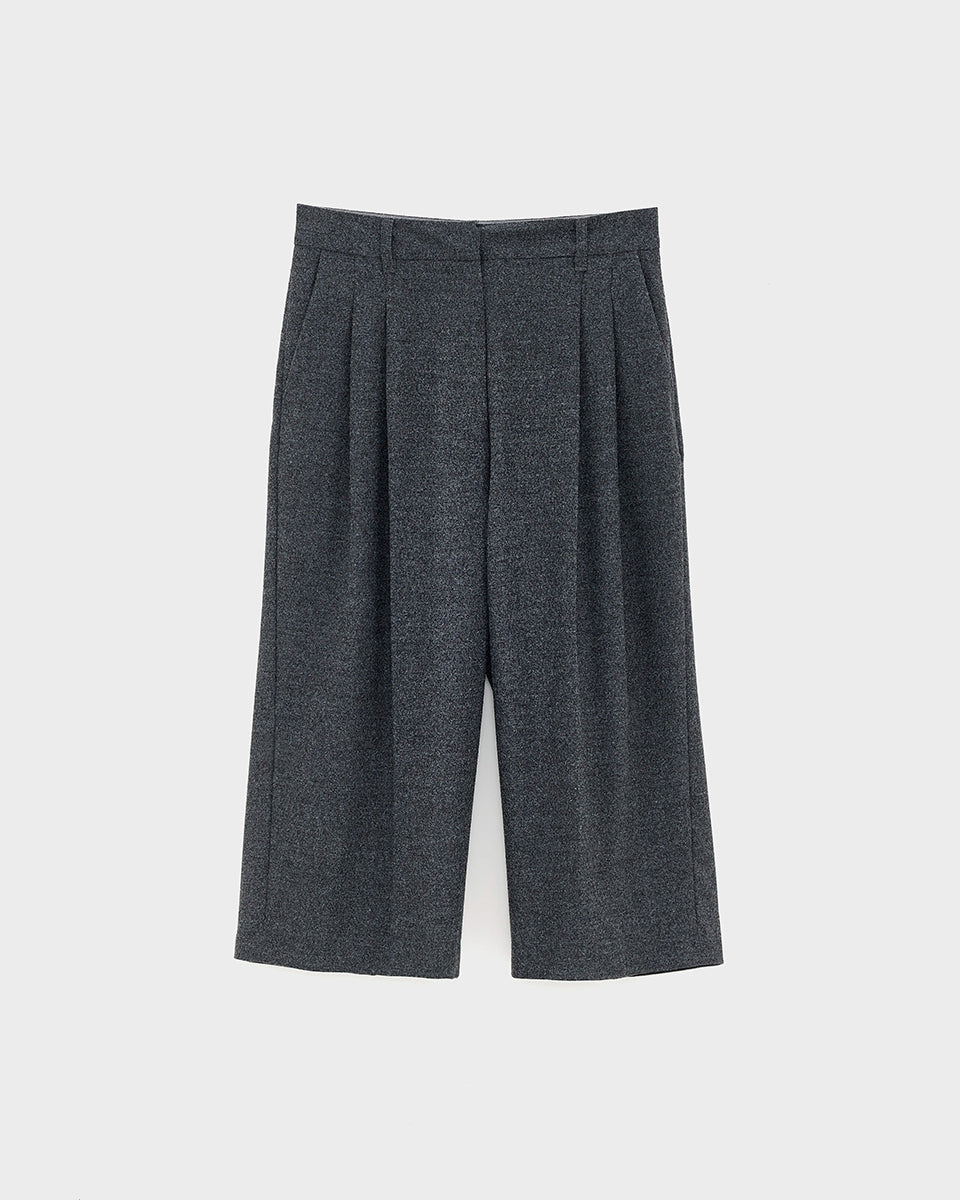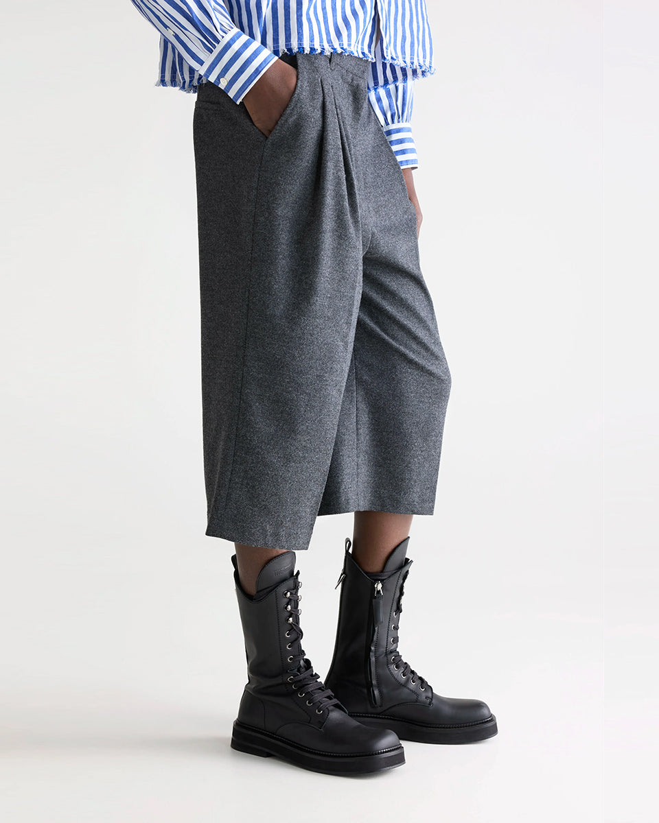 Garniturowe bermudy Dom Bellerose z wysokim stanem i zakładkami. Szorty mają szeroką, prostą nogawkę, dwie boczne i dwie tylne kieszenie. Spodnie mają długość za kolana. Wykonane z tkaniny z wełną.
