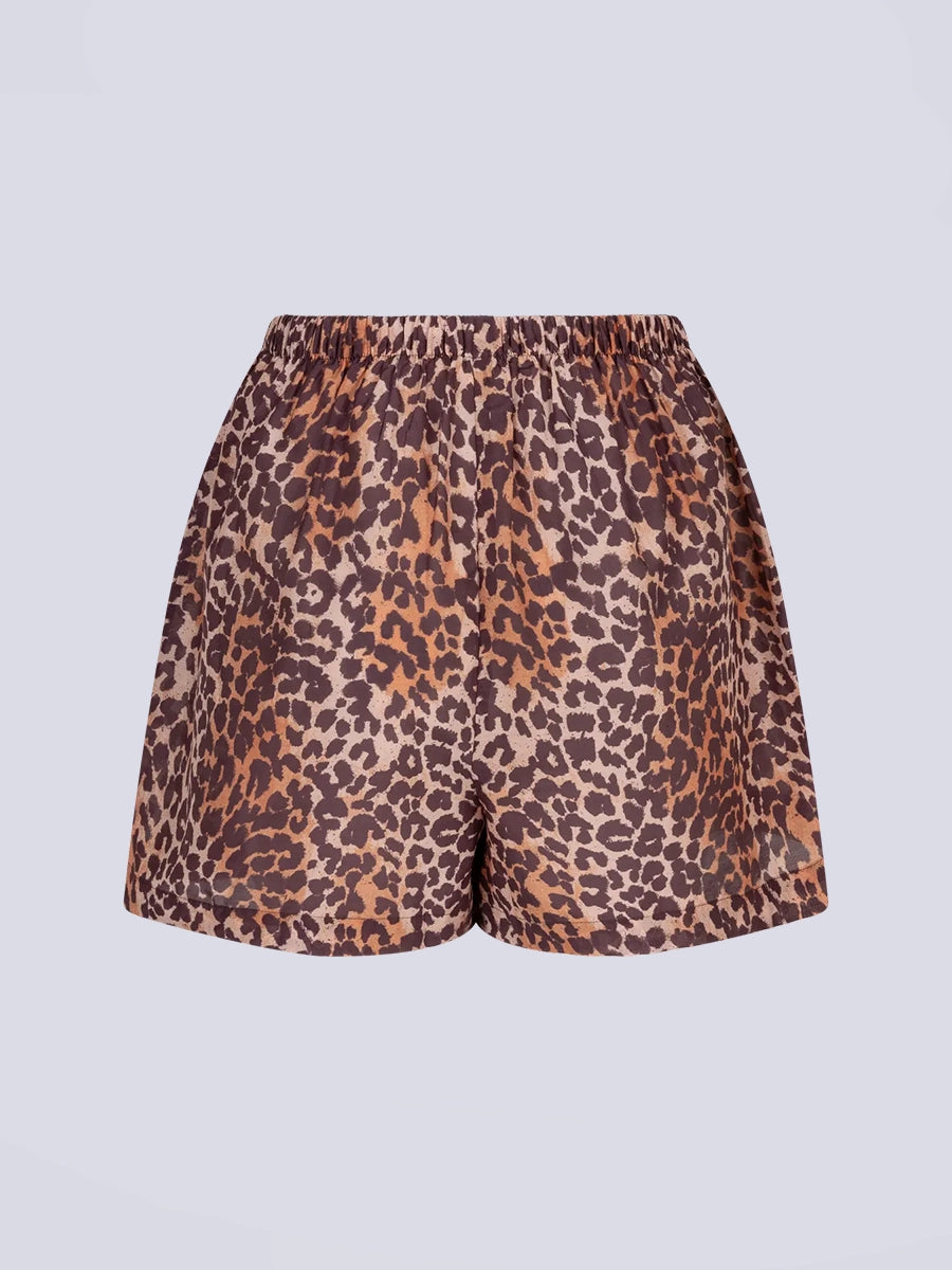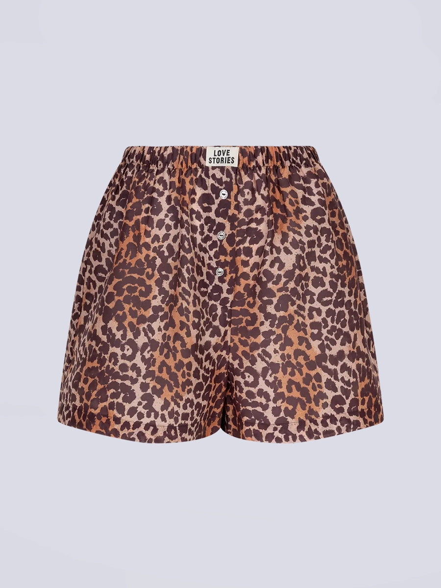 Luźne, cienkie, szorty w panterkę James Love Stories z wysokim stanem i elastyczną talią i atrapą rozporka z guzikami. Wykonane z cienkiej i zwiewnej tkaniny z jedwabiem. W pasie posiadają niewielką naszywkę z logo marki.