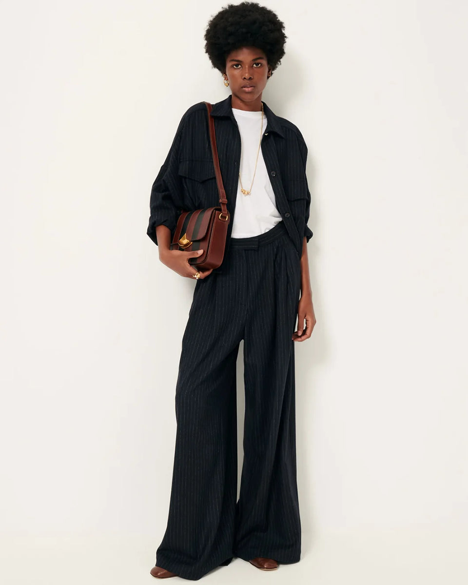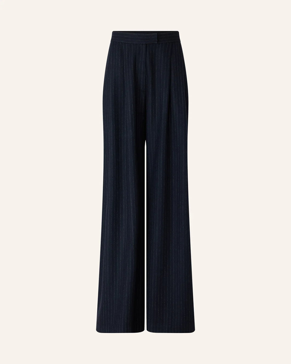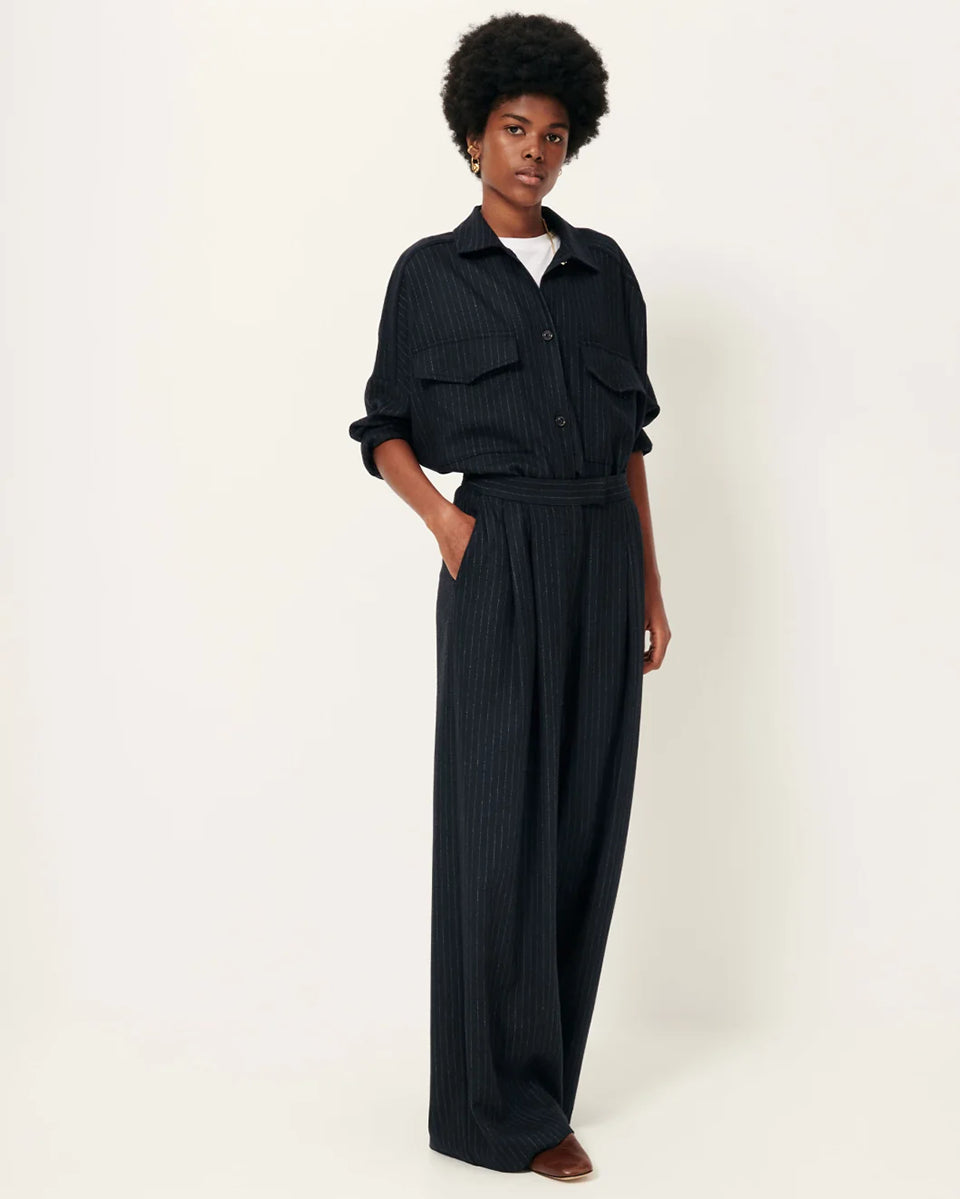 Luźne, materiałowe spodnie Orozco Navysand w paski, z wysokim stanem i przedłużeniem w talii z wewnętrznym zapięciem na haftki. Posiadają kieszenie ukośne i kieszenie z patką z tyłu, jedna zapinana na guzik. Noś je z ulubionym t-shirtem na codzień lub z koszulą, aby stworzyć bardziej elegancki look.