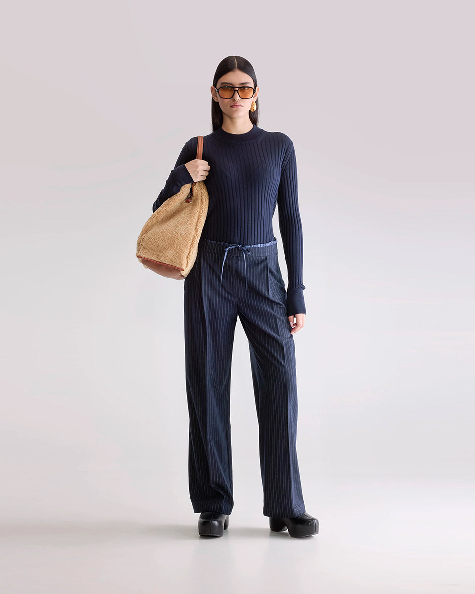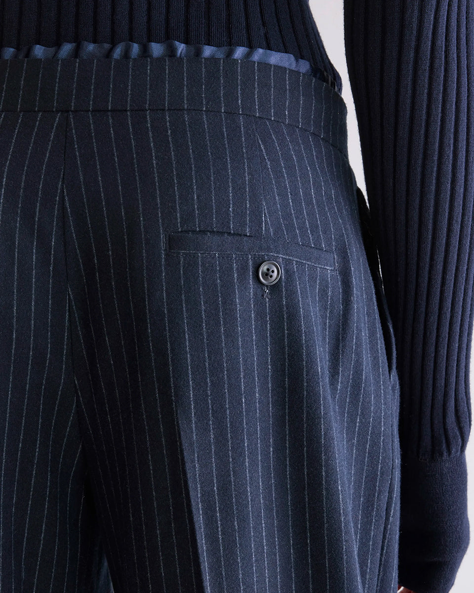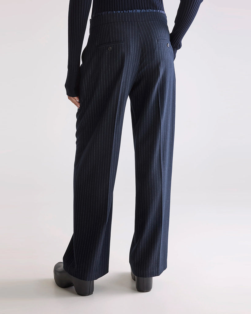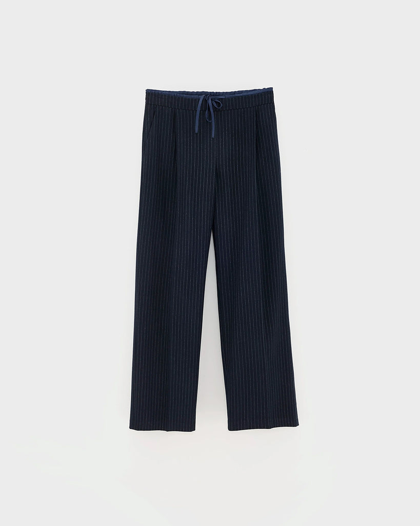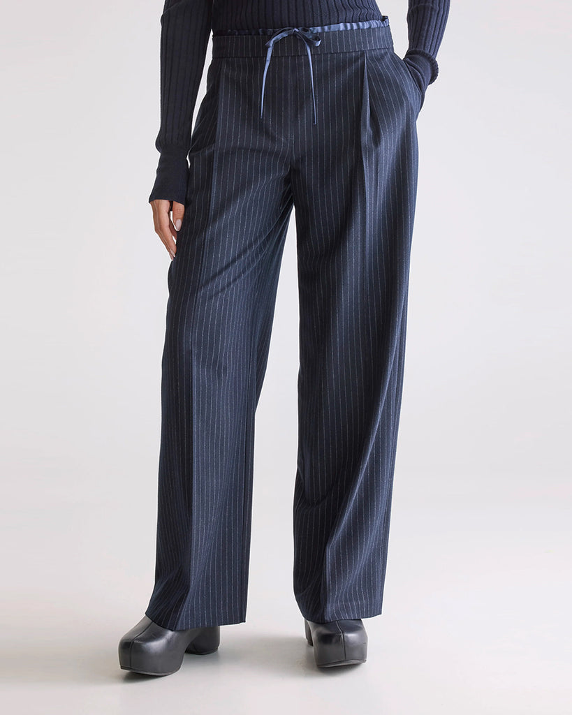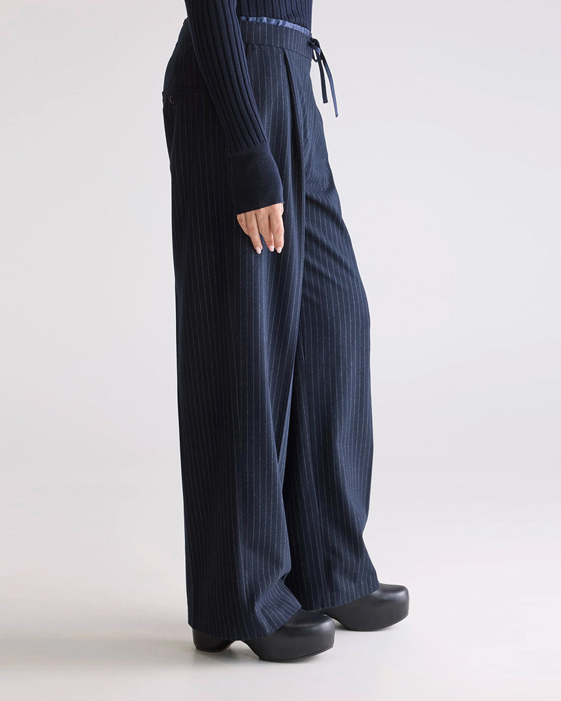 Luźne, materiałowe spodnie w prążki Turin Bellerose ze średnim stanem i elastycznym, wiązanym, warstwowym pasem. Spodnie mają szeroką, prostą nogawkę z zakładkami i kantem. Wykonane z miękkiej tkaniny z wiskozą. Spodnie mają dwie boczne i dwie tylne kieszenie. Połącz je koszulą lub przylegającym longsleevem.