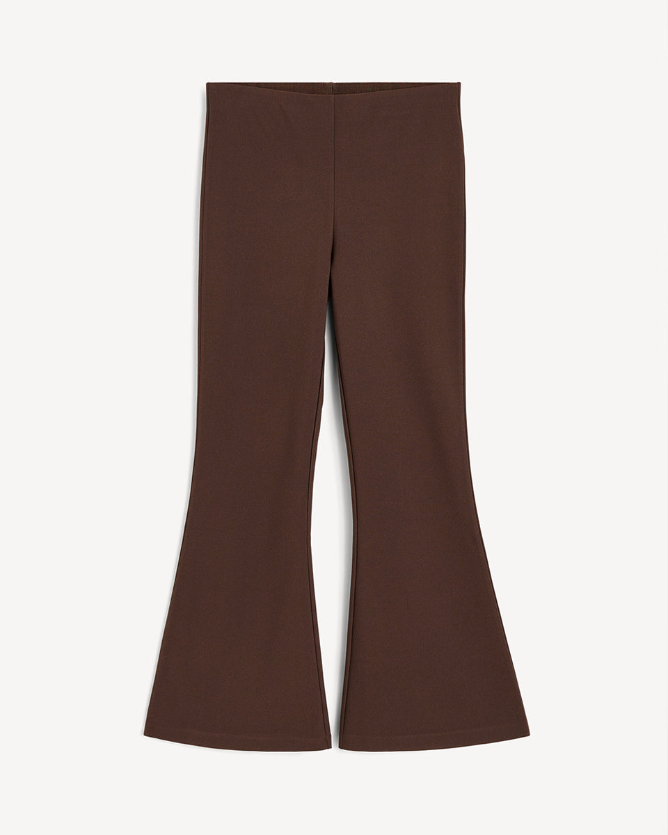 Wygodne, elastyczne spodnie typu dzwony Vilanna Coffee Brown By Malene Birger w czekoladowym kolorze. Mają średni stan i rozszerzaną, skróconą nogawkę. Noś je z oversizową marynarką lub swetrem.
