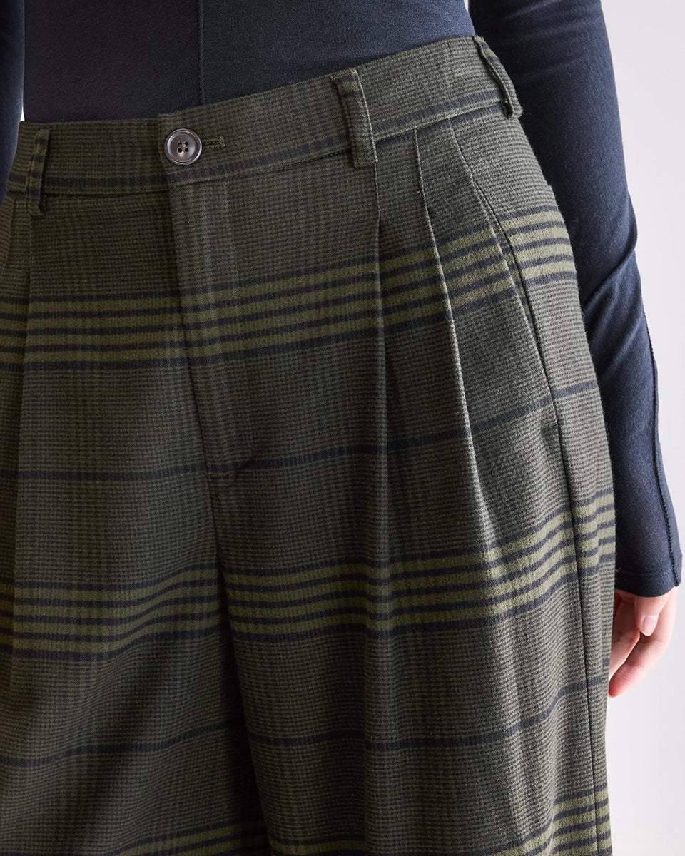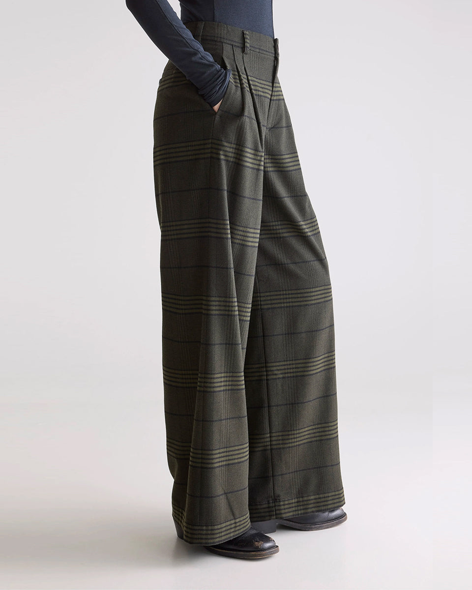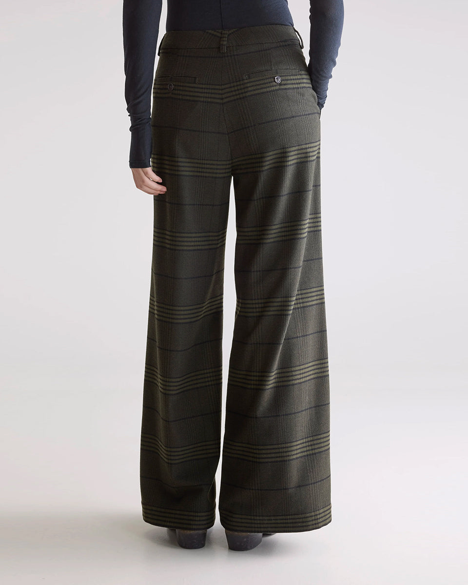 Luźne, materiałowe spodnie Volkert Bellerose z wysokim stanem i zakładkami. Spodnie mają szeroką, prostą nogawkę. Wykonane z miękkiej tkaniny w kraciasty wzór. Spodnie mają dwie boczne i dwie tylne kieszenie. Połącz je z krótkim, pudełkowym swetrem, czy przylegającym, cienkim golfem. Idealne na co dzień i do pracy.