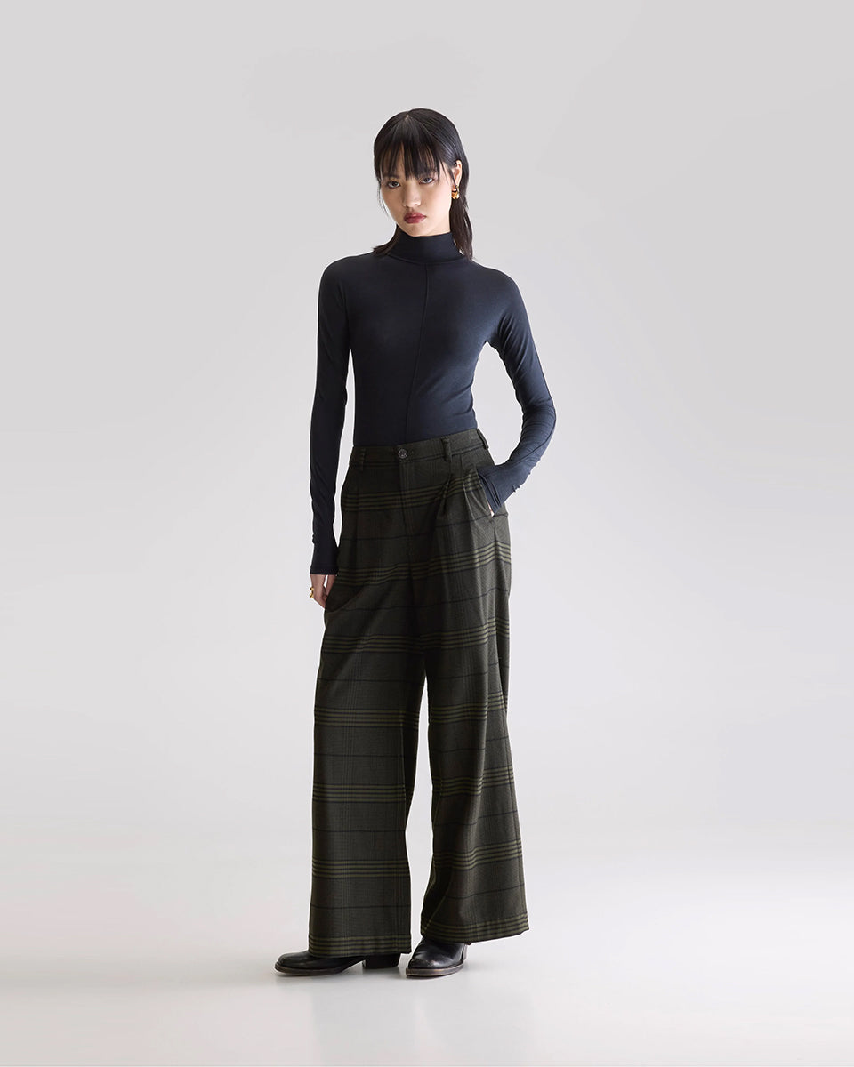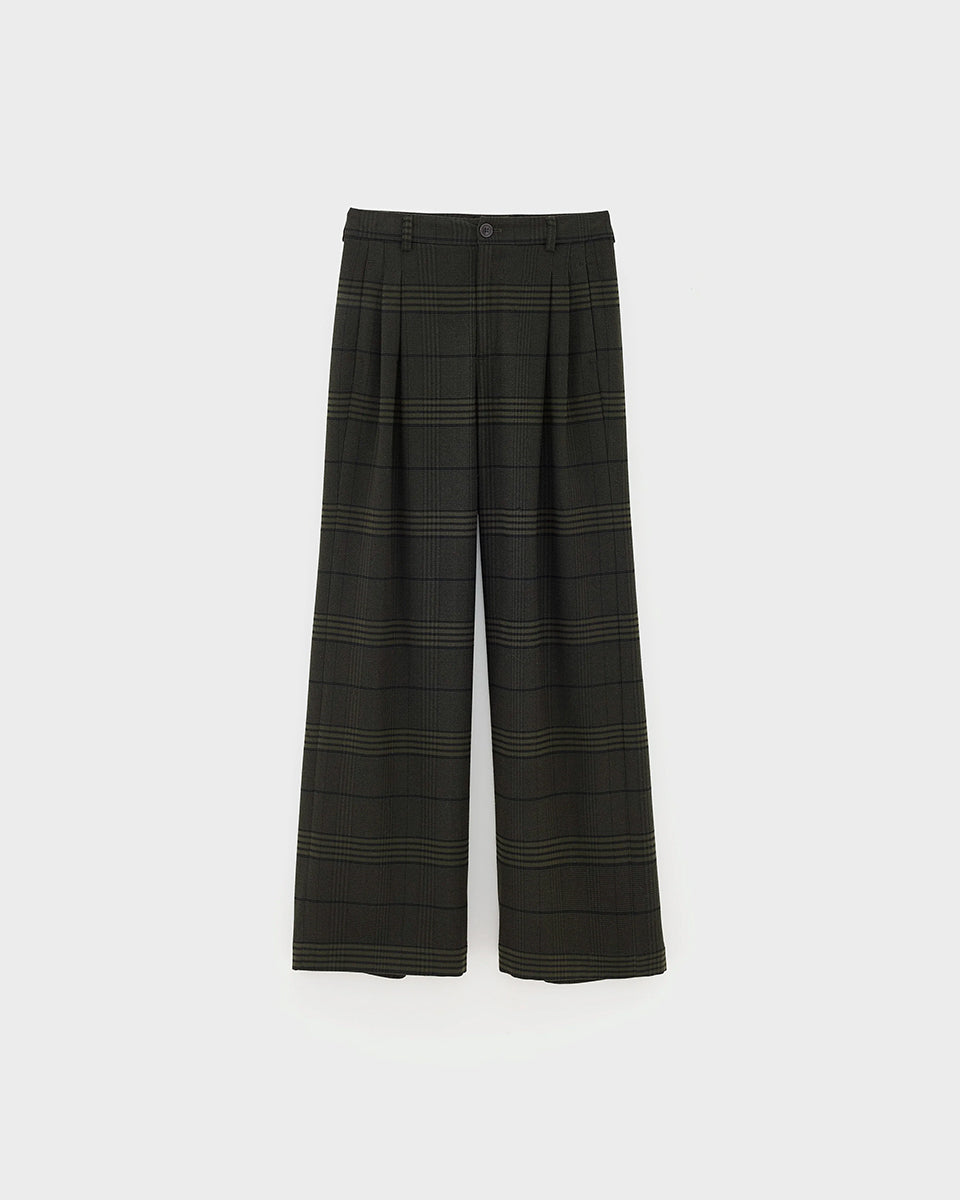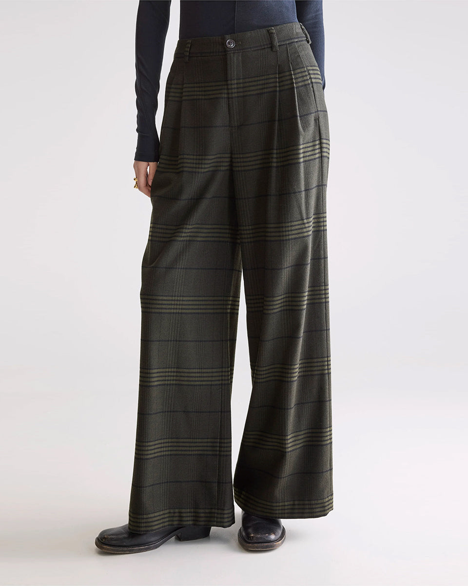 Luźne, materiałowe spodnie Volkert Bellerose z wysokim stanem i zakładkami. Spodnie mają szeroką, prostą nogawkę. Wykonane z miękkiej tkaniny w kraciasty wzór. Spodnie mają dwie boczne i dwie tylne kieszenie. Połącz je z krótkim, pudełkowym swetrem, czy przylegającym, cienkim golfem. Idealne na co dzień i do pracy.
