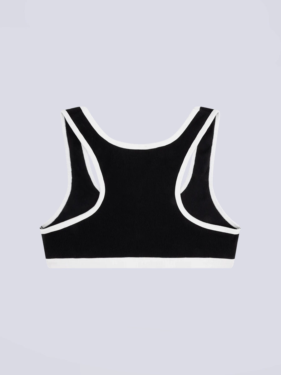 Miękki sportowy stanik top Rika Love Love Stories na grubych ramiączkach. Wykonany z miękkiej tkaniny z prążkowaną fakturą i białą, grubą lamówką. Na gumie pod biustem posiada niewielką naszywkę z logo marki.