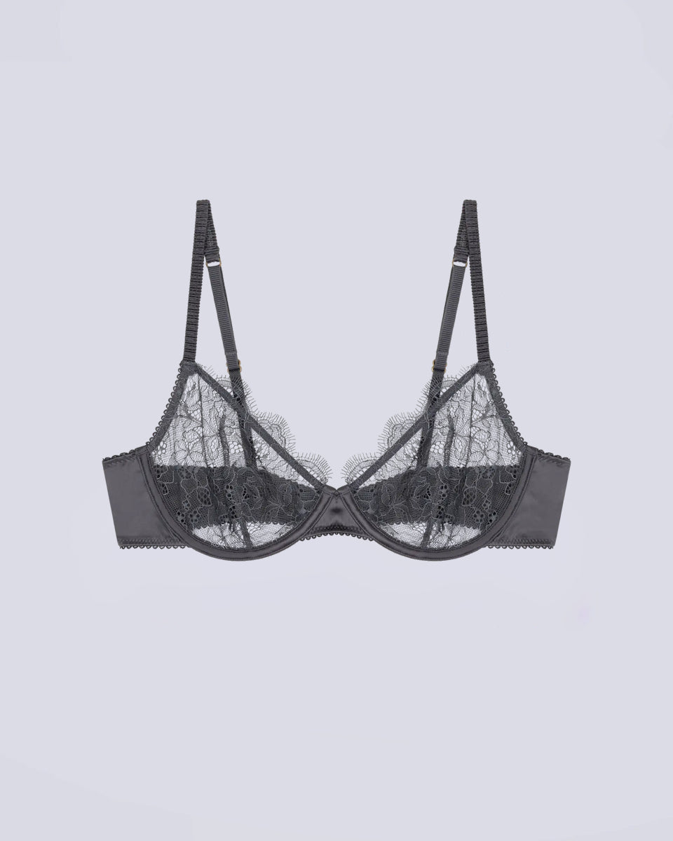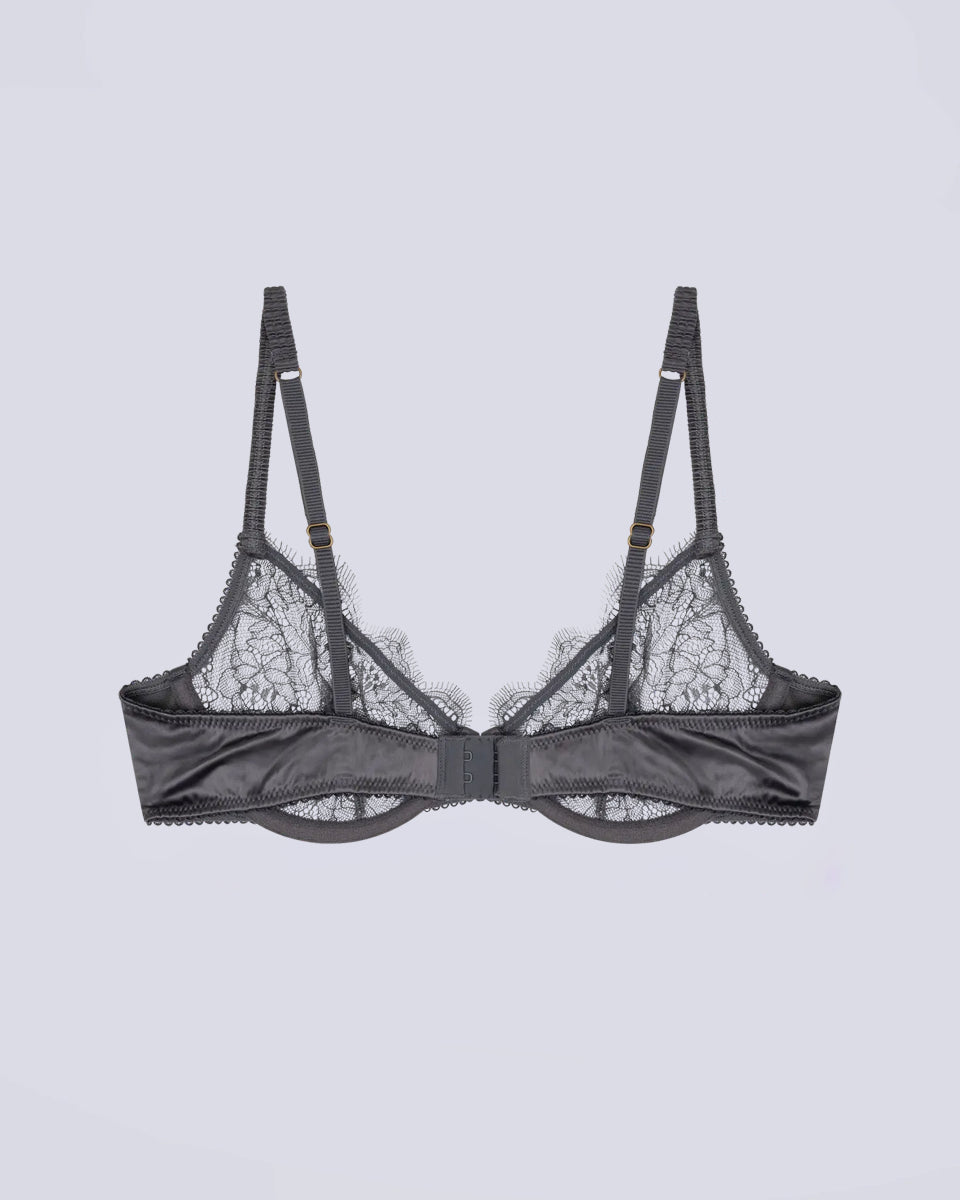 Koronkowy, ciemnoszary stanik Romeo Love Stories z fiszbinami i miękkimi miseczkami. Biustonosz ma regulowane ramiączka i zapinany jest za pomocą haftek.