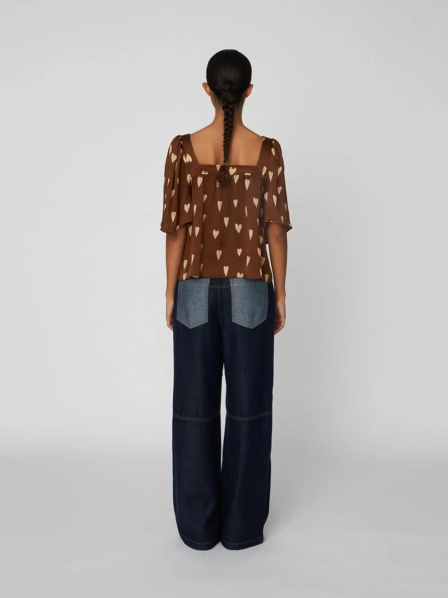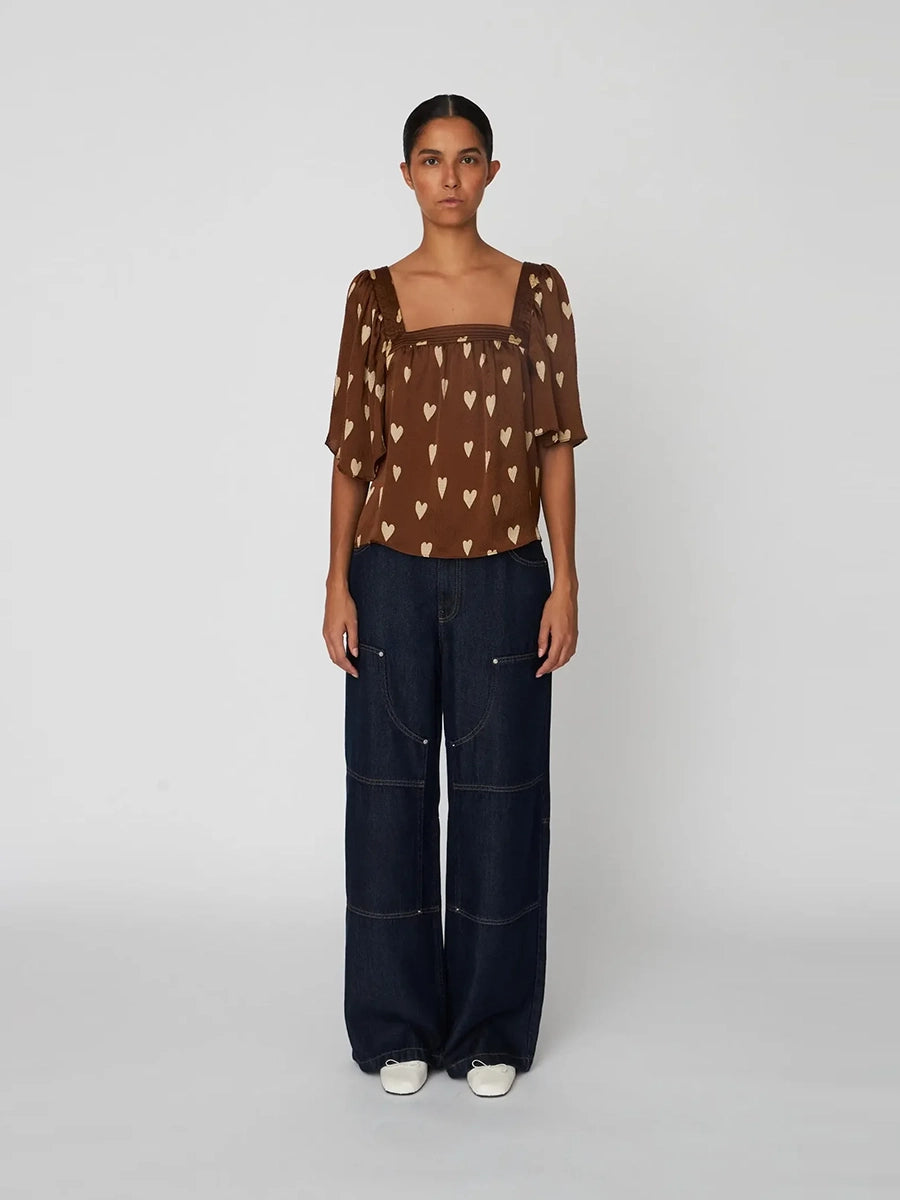 Jedwabna, zwiewna bluzka w uroczy print w serca Heart Printed STELLA NOVA z kwadratowym dekoltem i luźnymi, lekko bufiastymi rękawami o długości do łokcia .