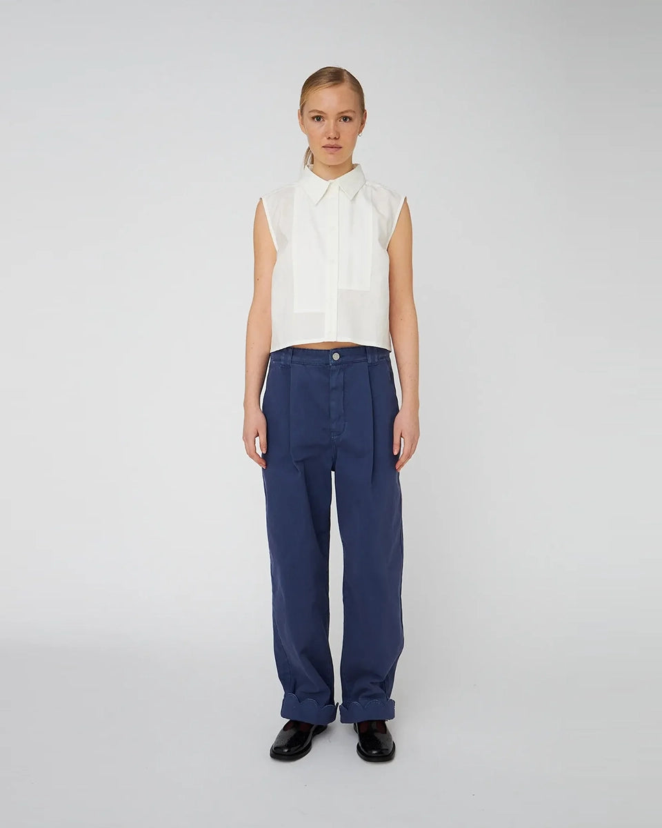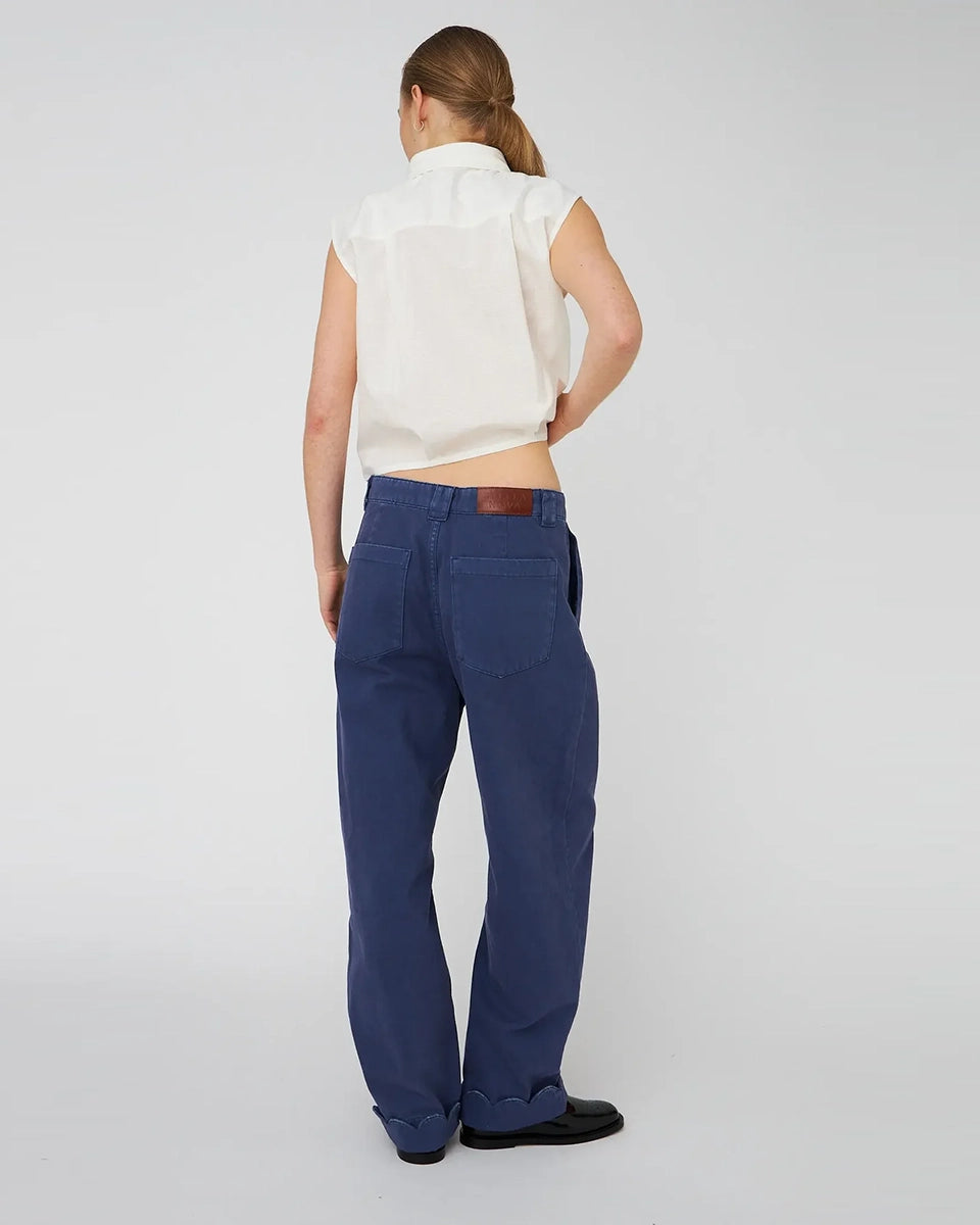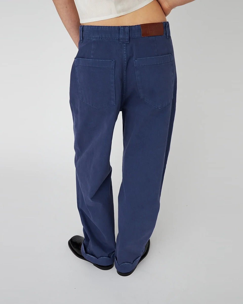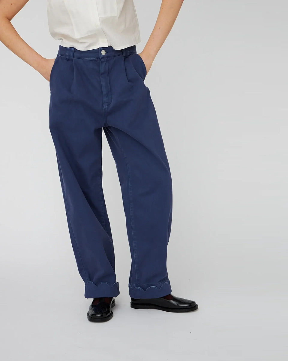 Luźne, granatowe jeansy STELLA NOVA z niskim stanem i szeroką, długą, lekko zwężaną u dołu nogawką z zakładkami. Spodnie mają dwie boczne i dwie tylne kieszenie. U dołu wywijane i wykończone muszelkowo.