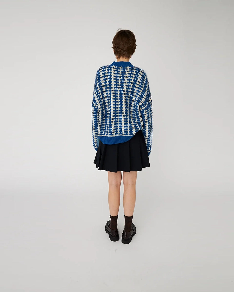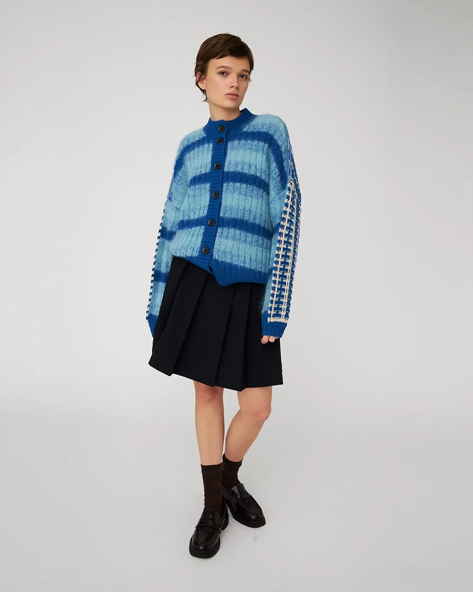 Luźny kardigan w niebieskie paski STELLA NOVA z okrągłym dekoltem i reglanowymi, długimi rękawami. Zapinany na guziki. Wykonany z dzianiny z wełną o dwóch wzorach. Wykończony ściągaczami.
