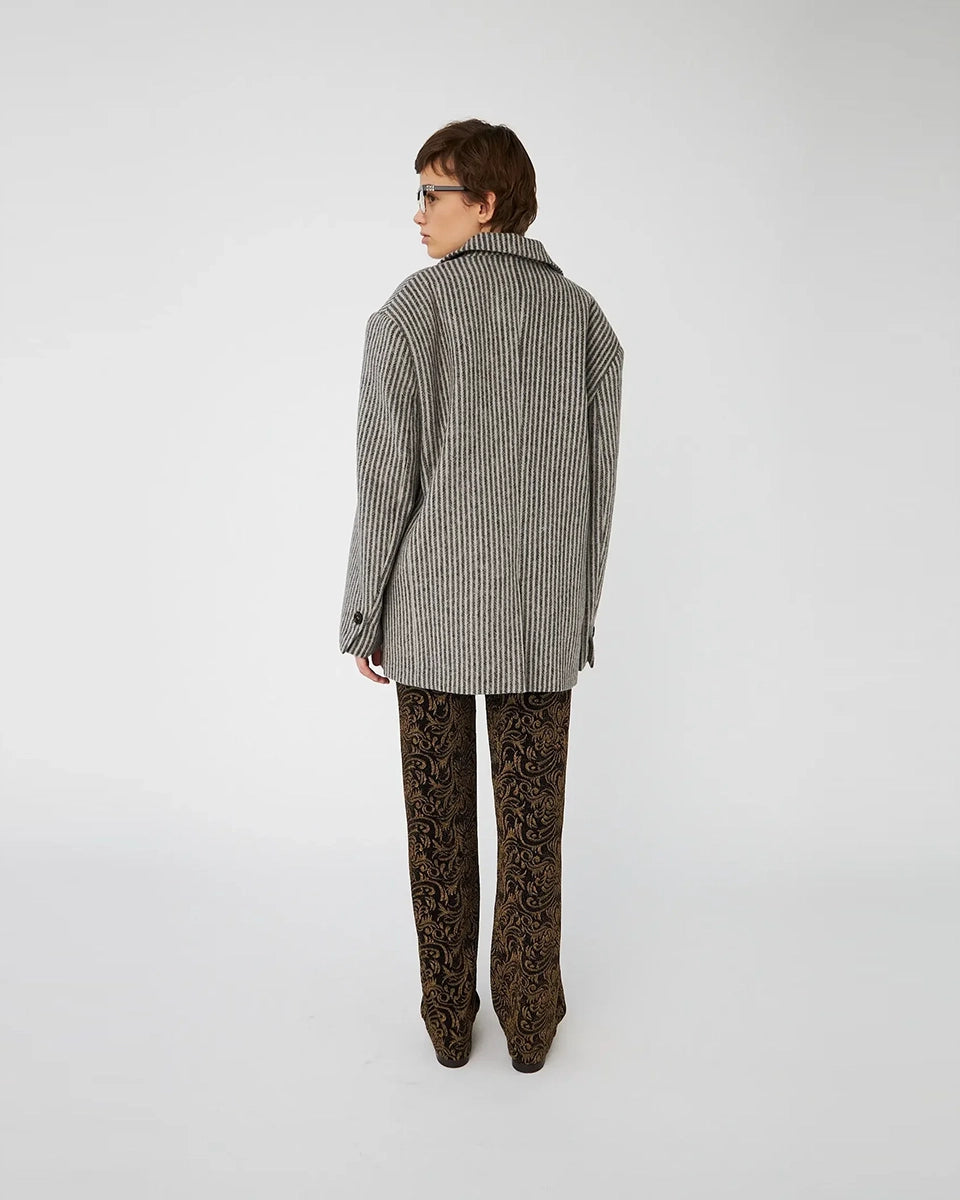 Mocno oversizowa, szara marynarka w cienkie prążki STELLA NOVA z szerokimi ramionami z poduszkami. Marynarka ma prosty krój. Jest zapinana na jeden guzik. Posiada podszewkę oraz dwie, przednie kieszenie. Wykonana z ciepłej tkaniny z wełną.