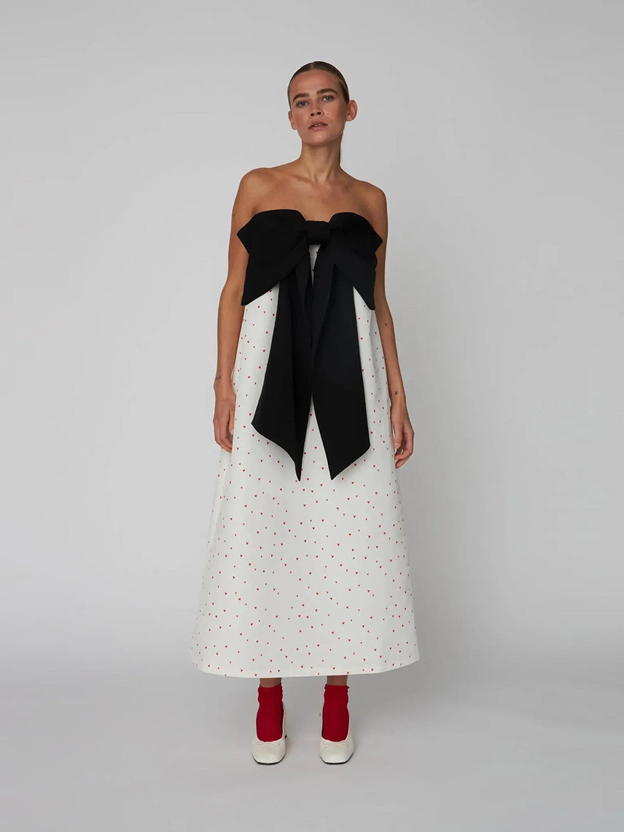Luźna, wieczorowa sukienka maxi na cienkich ramiączkach Heart Printed Bow STELLA NOVA z dużą, efektowną, czarną kokardą na piersiach. Wykonana ze sztywnej tkaniny w print w drobne serduszka. Sukienka ma krój w kształcie litery A i długość przed kostki.