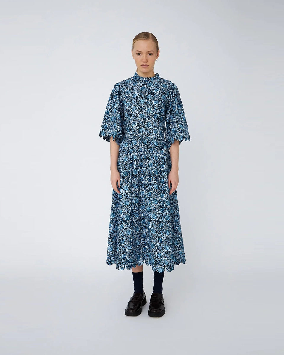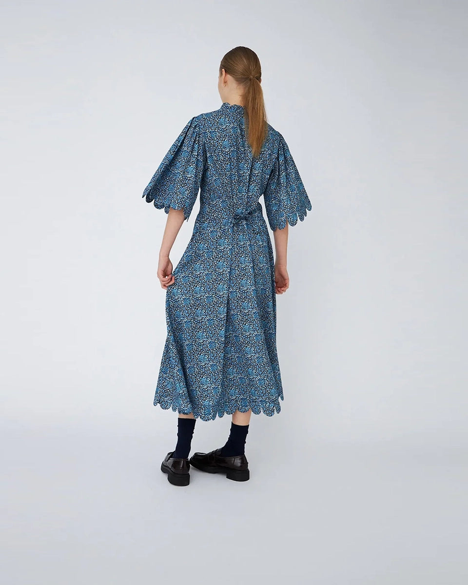 Luźna, bawełniana sukienka midi w kwiatowy print STELLA NOVA z wysokim dekoltem w formie stójki i szerokim, krótkim rękawem o długości do łokcia. W górnej partii zapinana na guziki. Z tyłu wiązana w talii. Wykończona muszelkowo. Sukienka ma długość do połowy łydki. Wykonana z bawełny organicznej.