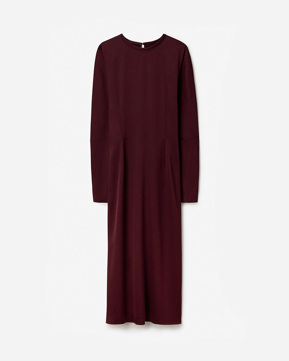 Minimalistyczna, luźna, elegancka sukienka midi Filippa K z okrągłym dekoltem i długimi rękawami rozszerzanymi pod pachami z guzikami przy mankietach. Na plecach posiada długie, wąskie rozcięcie. Z tyłu przy szyi zapinana na jeden guzik. Lekko zwężana w talii. Z tyłu w pasie ma elastyczną gumkę. Sukienka posiada długość do połowy łydki. To elegancka połączona z wygodą.