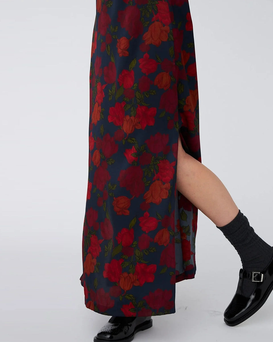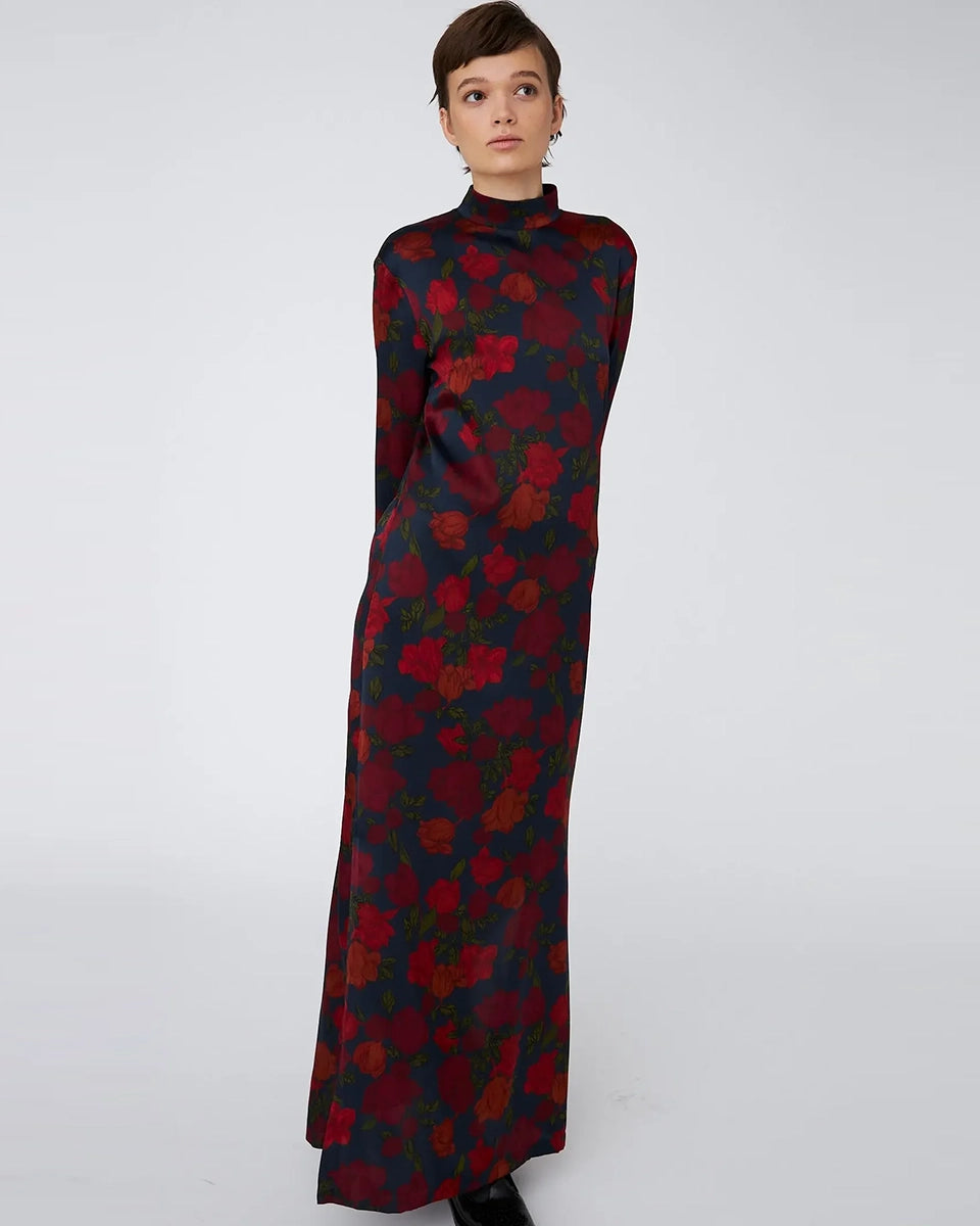 Jedwabna, elegancka sukienka maxi w kwiatowy wzór STELLA NOVA z długim rękawem i dekoltem w formie krótkiego golfu zapinanego z tyłu na szyi za pomocą guzikow. Na plecach posiada głębokie, trójkątne wycięcie. Sukienka ma rozcięcie u dołu.