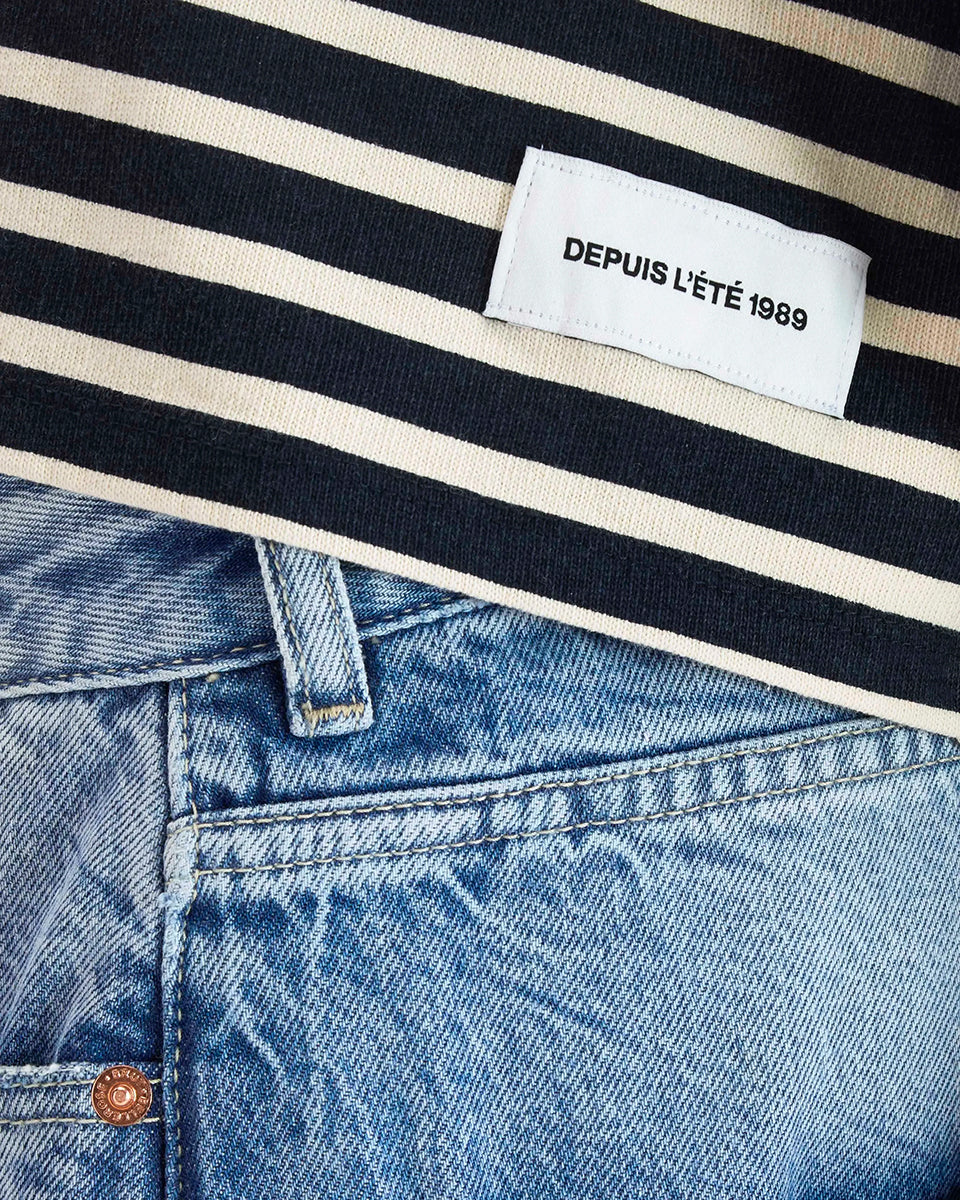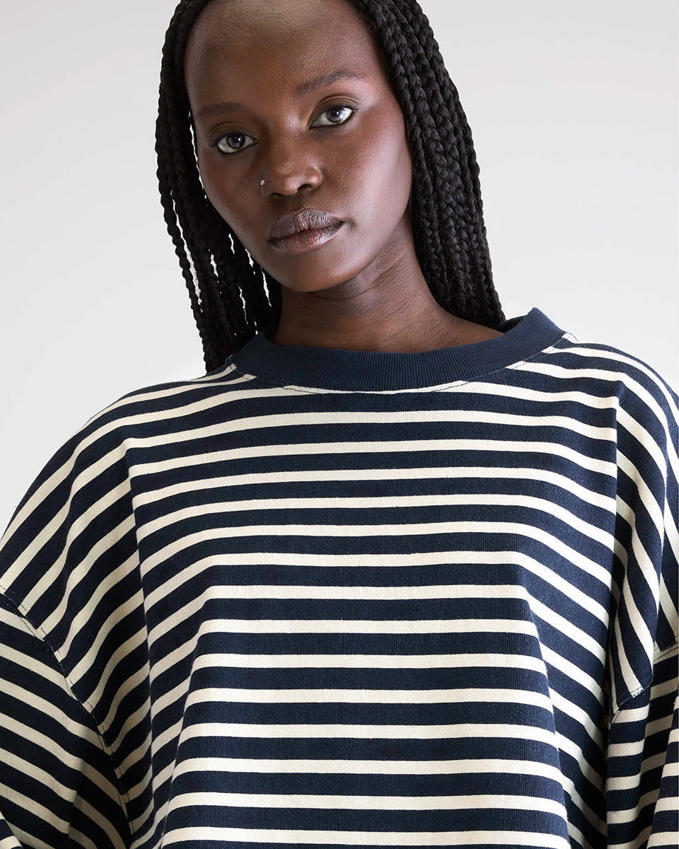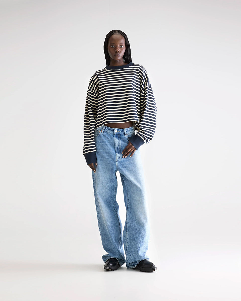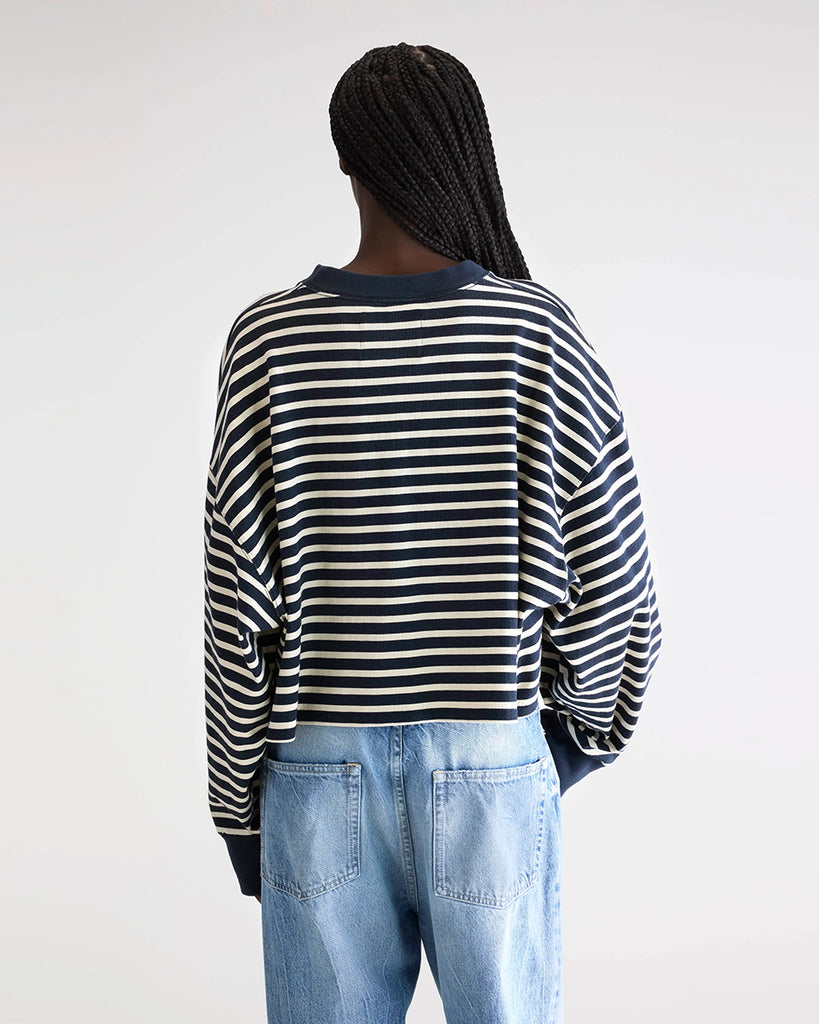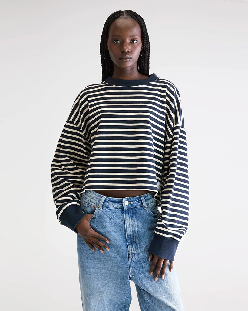 Krótki, luźny longsleeve w paski Franto Bellerose z okrągłym dekoltem, opadającymi ramionami i szerokimi rękawami zakończonymi ściągaczami. Bluzka ma pudełkowy fason. Idealna do spodni z wysokim stanem.