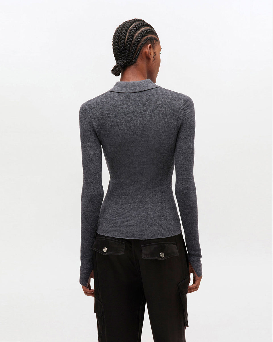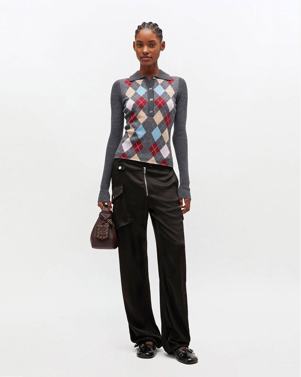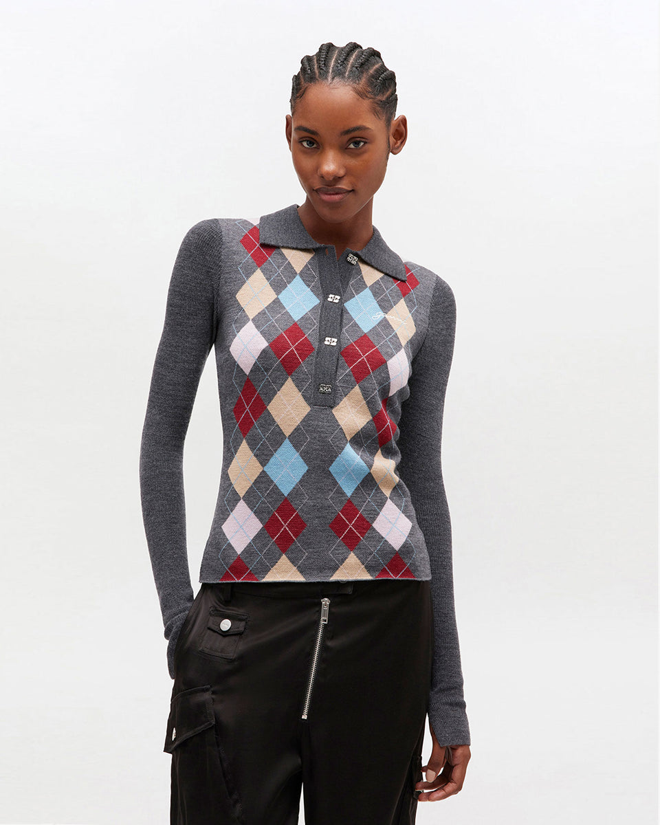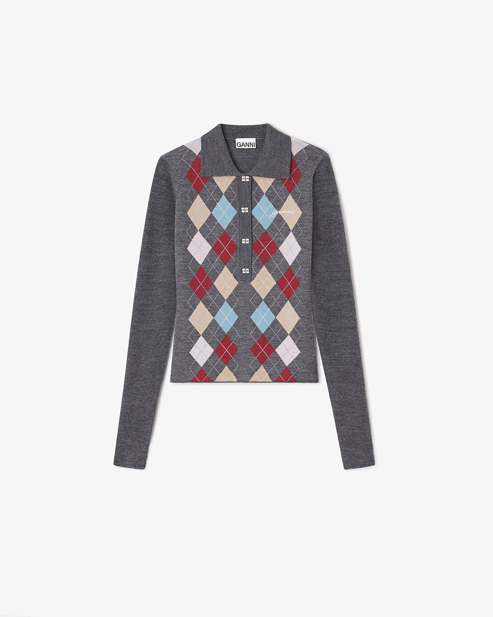 Cienki sweter polo 2601 GANNI z kołnierzykiem. Ma wzór w romby. Zapinany przy dekolcie za pomocą srebrnych, ozdobnych guzików w kształcie logo marki. Sweter ma prosty krój i przylegający do ciała fason oraz długie, wąskie rękawy. Wykonany z miękkiej, ekskluzywnej dzianiny z wełny merynosa.