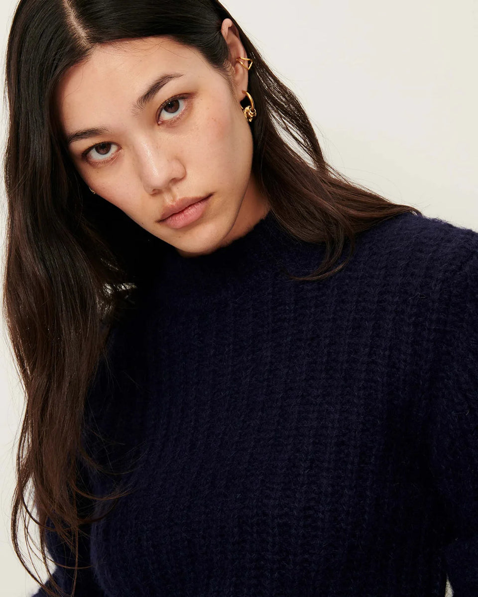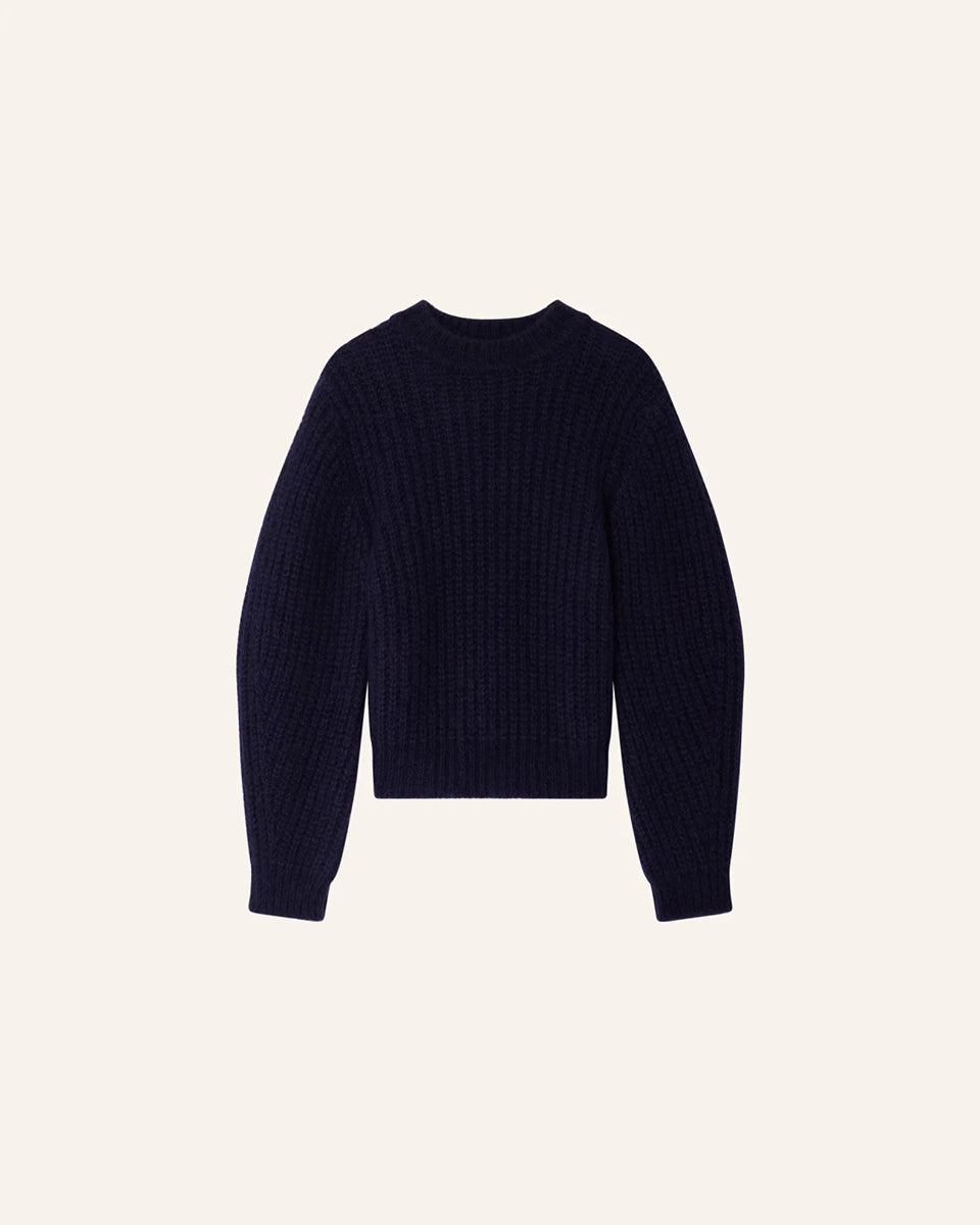 Granatowy, krótki sweter Eole Navy francuskiej marki Sessun z okrągłym dekoltem i długimi bufiastymi rękawami. Wykonany z puszystej dzianiny typu half-cardigan.