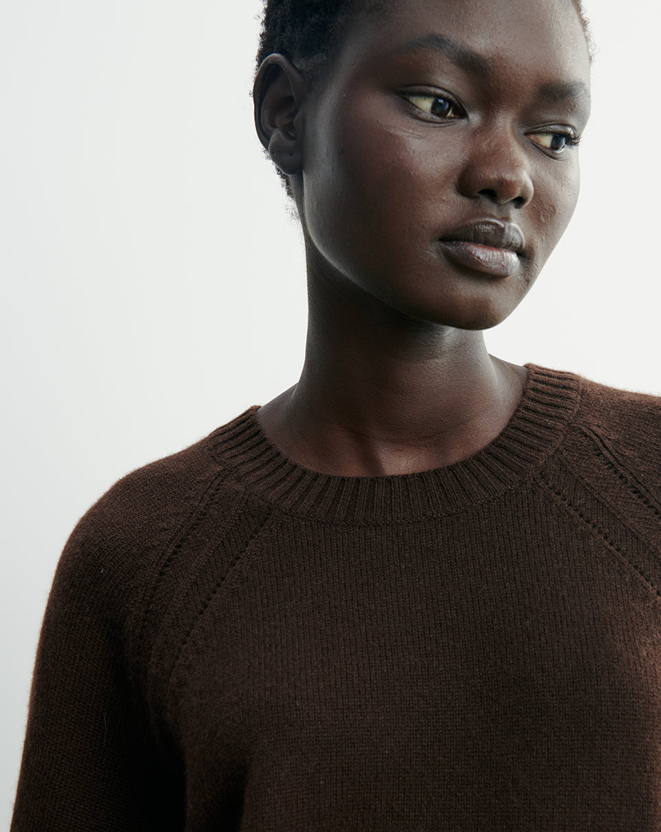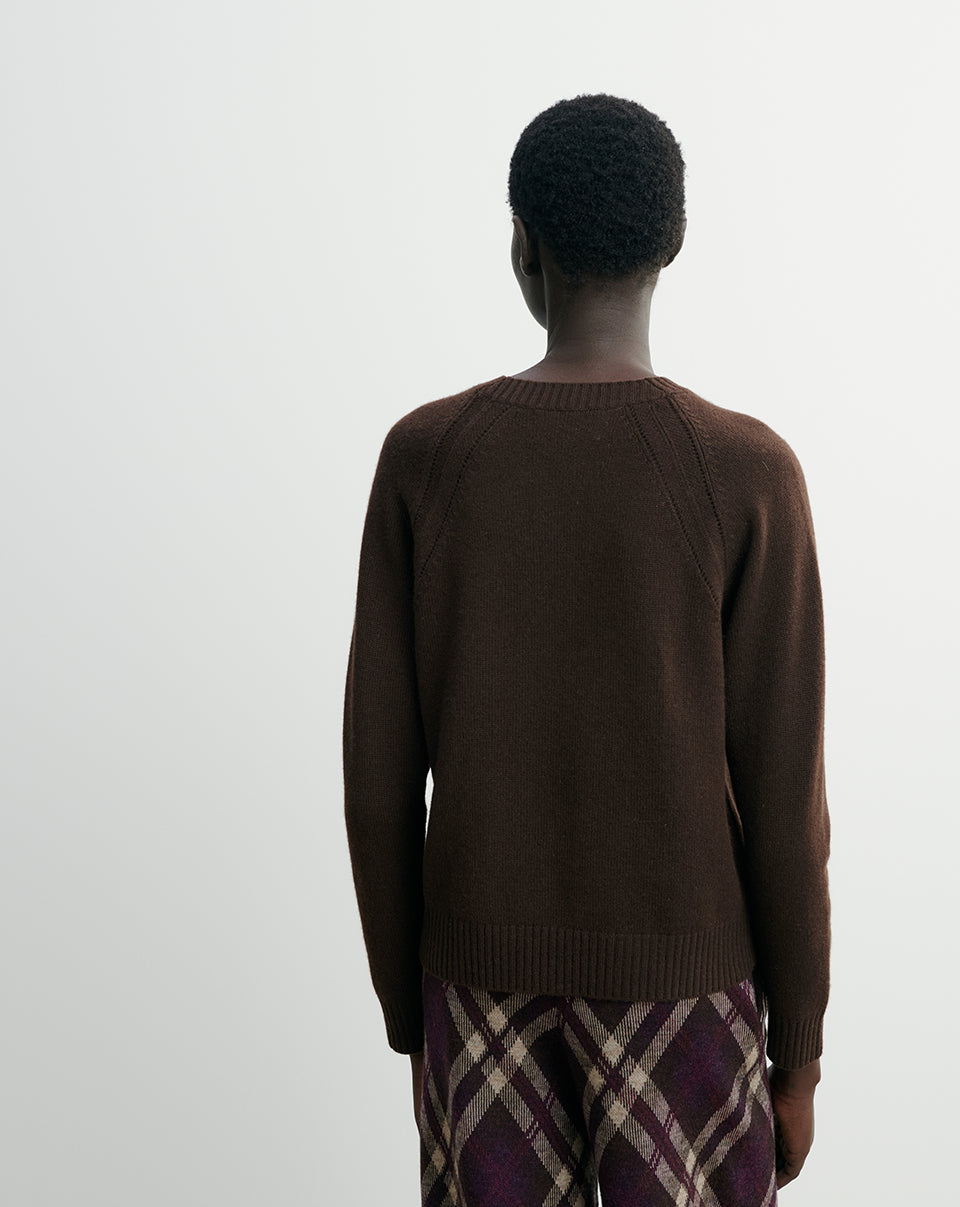 Luźny prosty sweter MO2857 Chocolat w brązowym kolorze z okrągłym dekoltem, raglanowym, długimi rękawami i zdobionym splocie przy ramionach. Sweter ma klasyczną długość. Wykonany w 100% z kaszmiru.