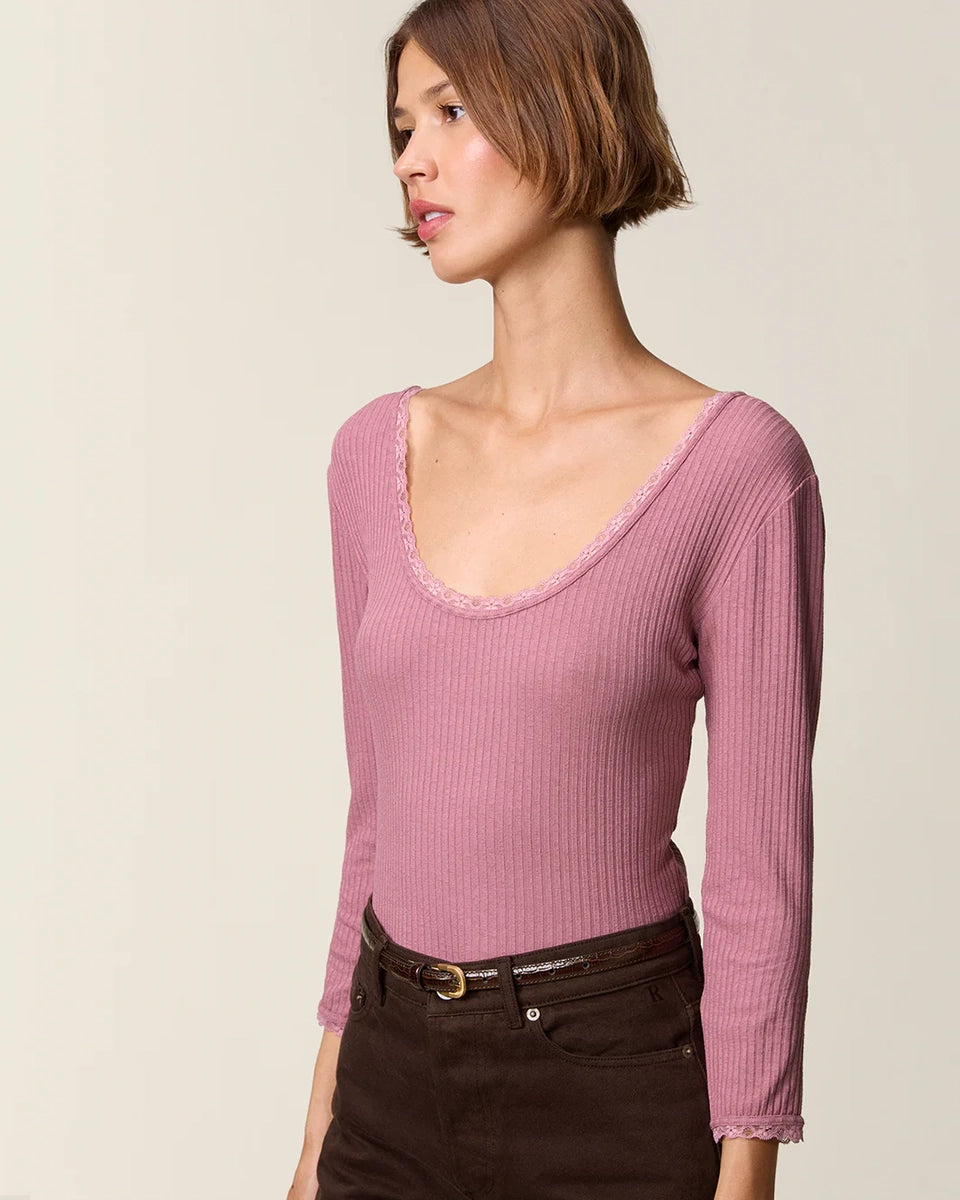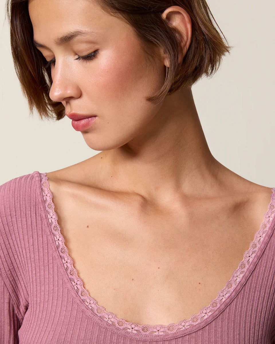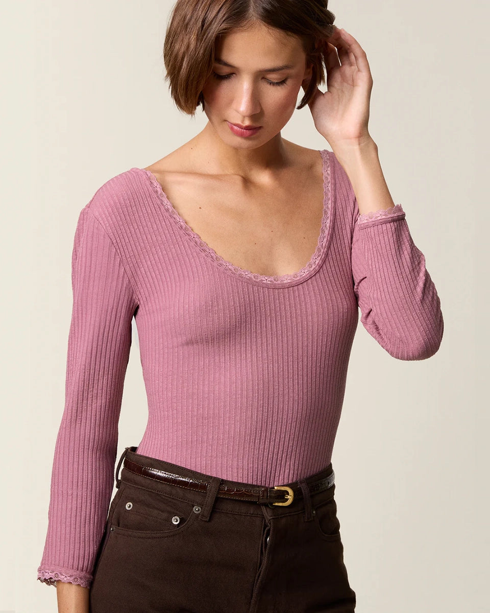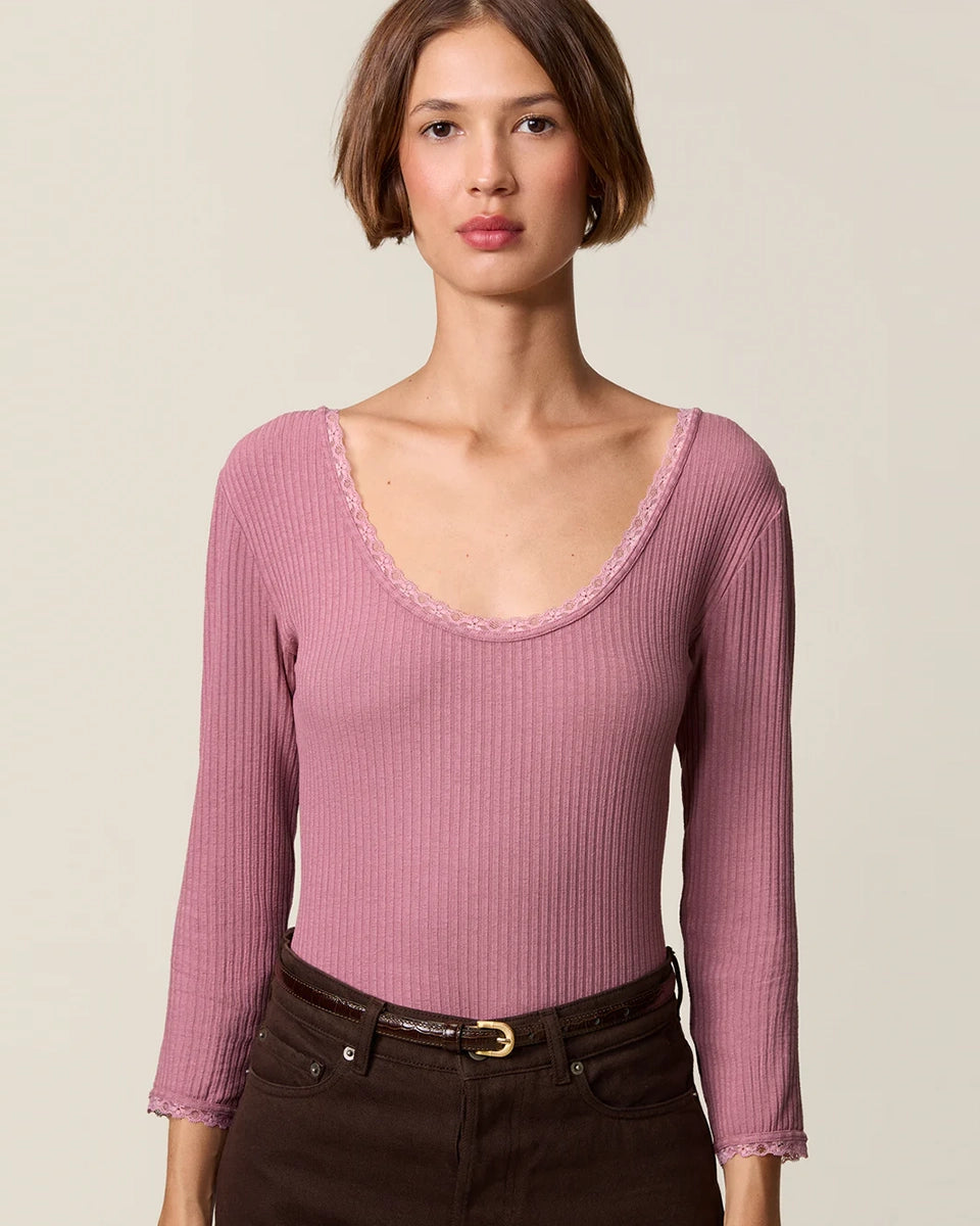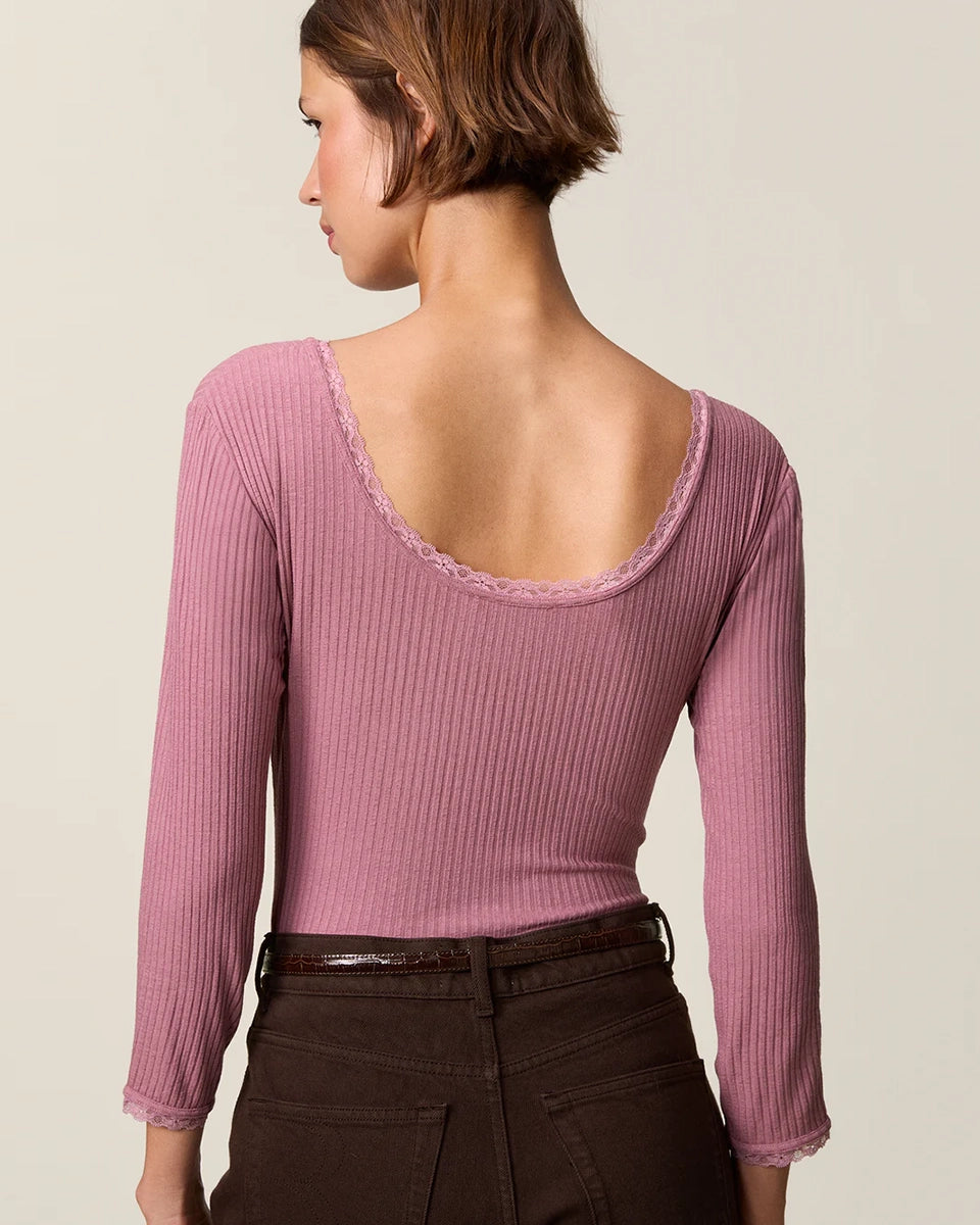 Dopasowana, prosta bluzka Gio Rouje z głębokim, okrągłym dekoltem obszytym uroczą koronką. Posiada wąskie rękawy o długości przed nadgarstki wykończone koronką. Wykonana z cienkiej tkaniny z prążkowaną fakturą. Idealna do spodni z wysokim stanem.