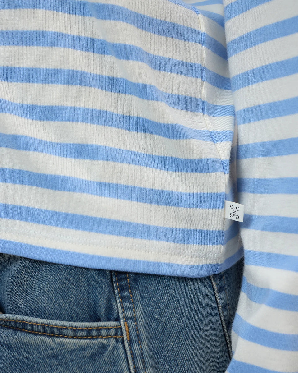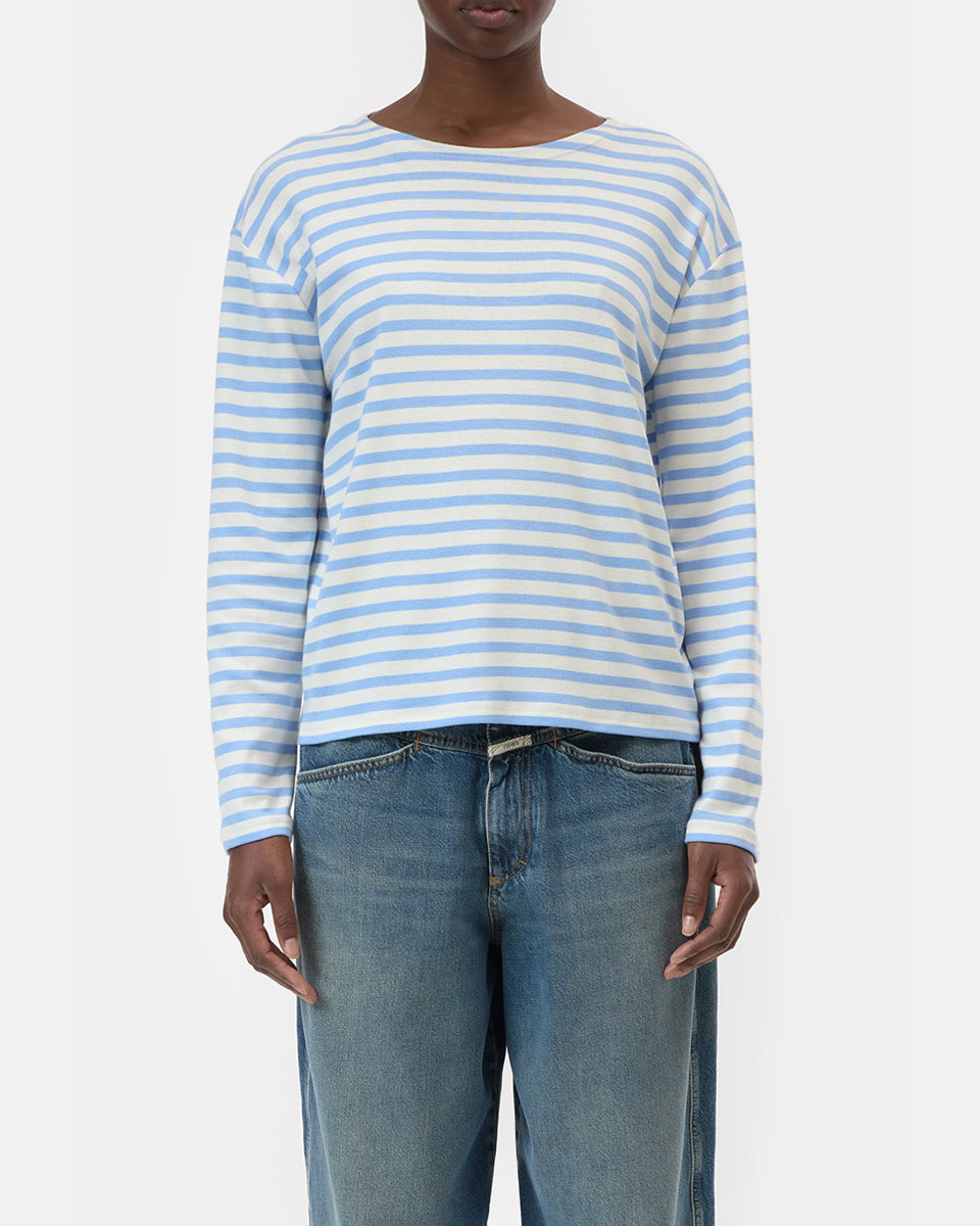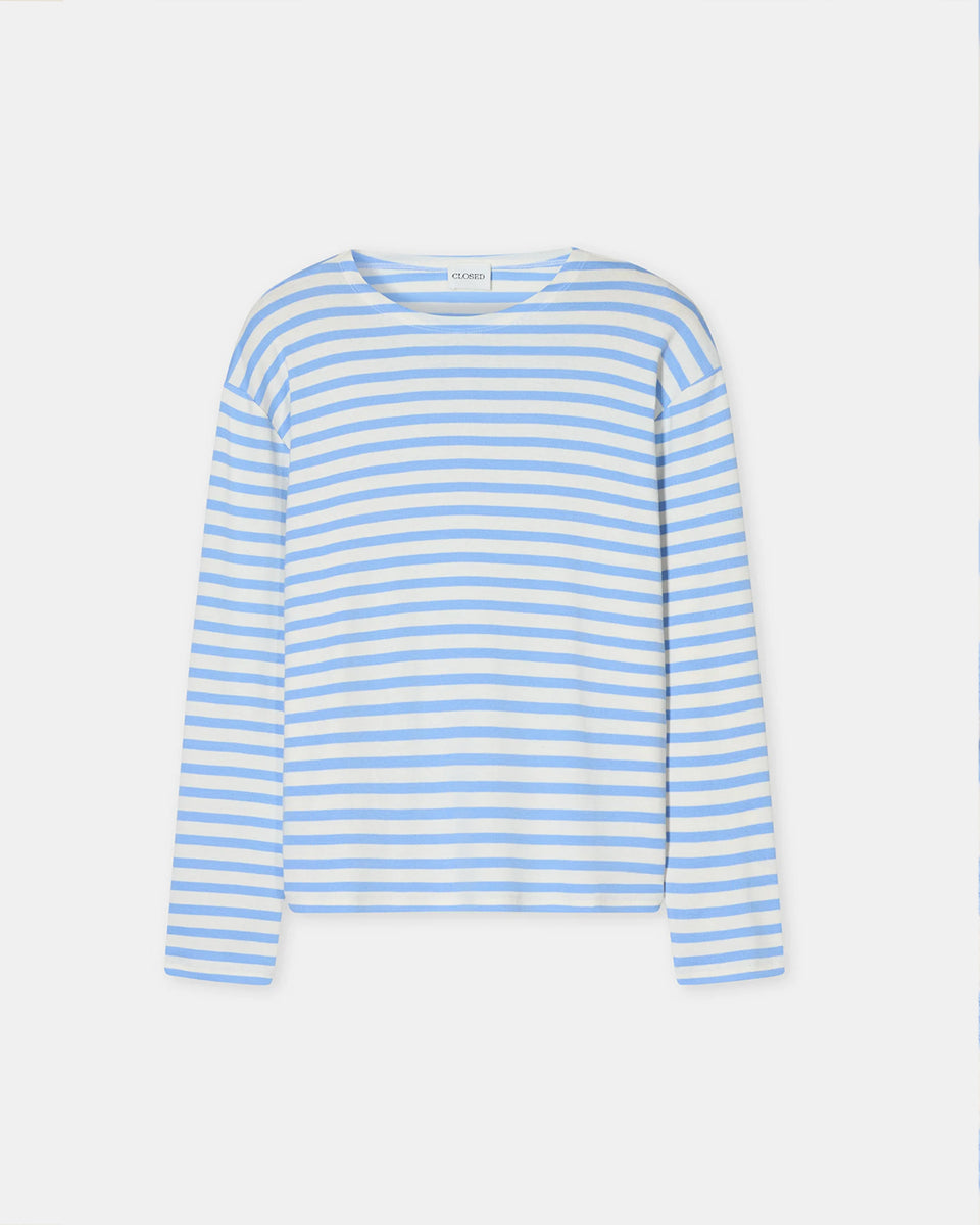 Luźny longsleeve Basic marki CLOSED w niebiesko-białe paski. Bluzka ma okrągły dekolt, długie rękawy i opadające ramiona. Wykonana z bardzo miękkiej i przyjemnej dla skóry tkaniny z bawełną i modalem. Załóż longsleeve do jeansów, lnianych spodni czy ulubionych szortów.