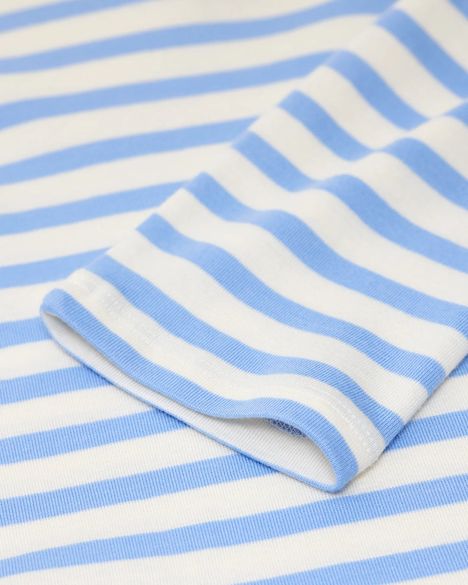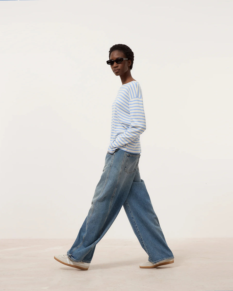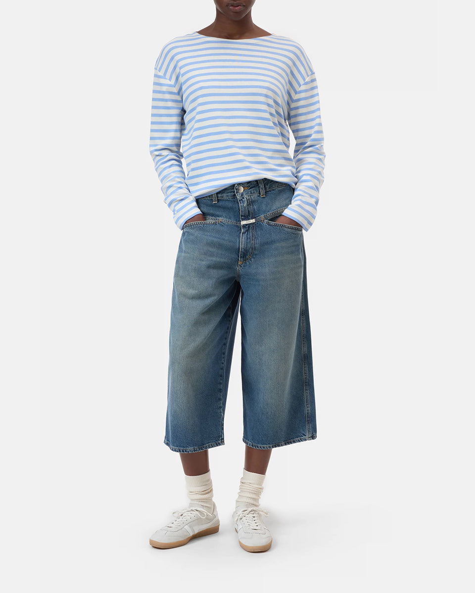 Luźny longsleeve Basic marki CLOSED w niebiesko-białe paski. Bluzka ma okrągły dekolt, długie rękawy i opadające ramiona. Wykonana z bardzo miękkiej i przyjemnej dla skóry tkaniny z bawełną i modalem. Załóż longsleeve do jeansów, lnianych spodni czy ulubionych szortów.