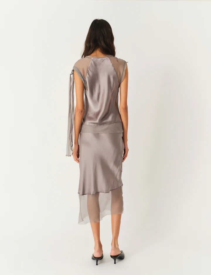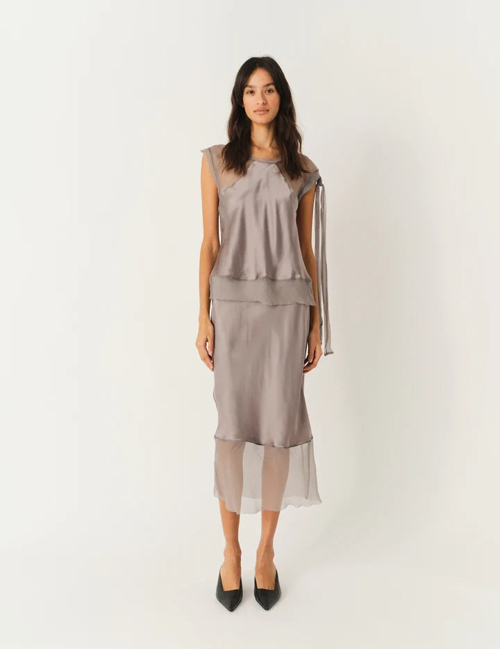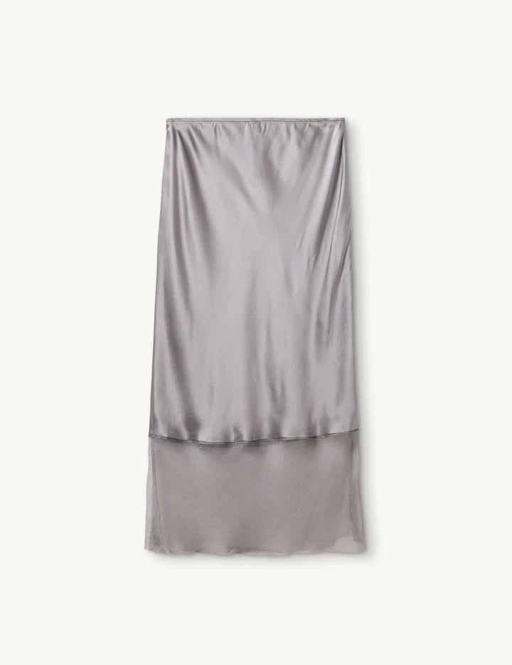 Luźna, jedwabna spódnica midi Catania The Garment z wysokim stanem. Elastyczna w talii. U dołu wykończona kontrastową, lekko transparentną tkaniną. Połącz ją z oversizowym swetrem, luźną koszulą i baletkami.