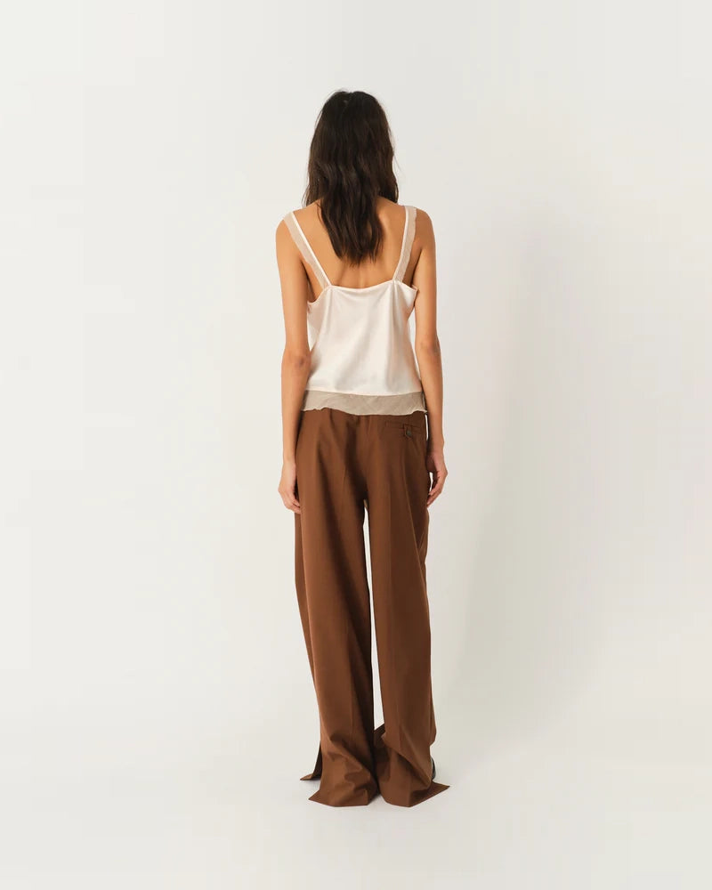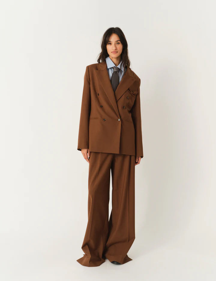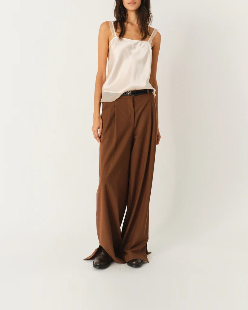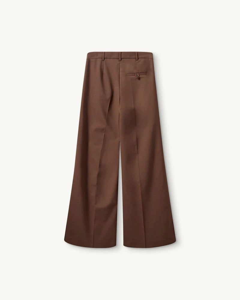 Brązowe spodnie garniturowe Grand The Garment z wysokim stanem, i prostą, długą nogawką z zakładkami i rozcięciami u dołu. Spodnie mają dwie boczne kieszenie i jedną tylną. To ponadczasowy, klasyczny fason idealny zarówno do t-shirtu i sneakersów jak i koszuli i mokasynów. Wykonane z tkaniny z wełną.