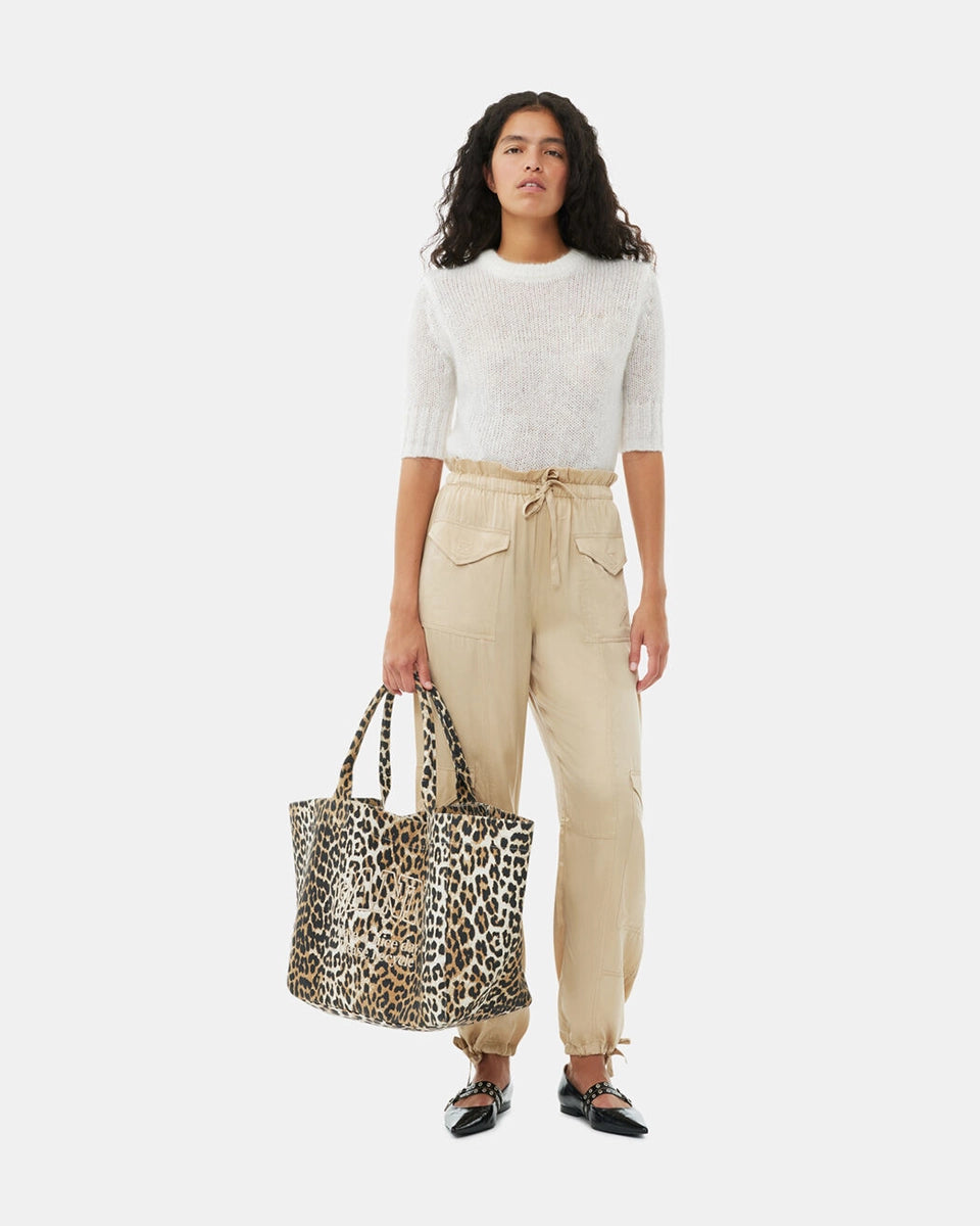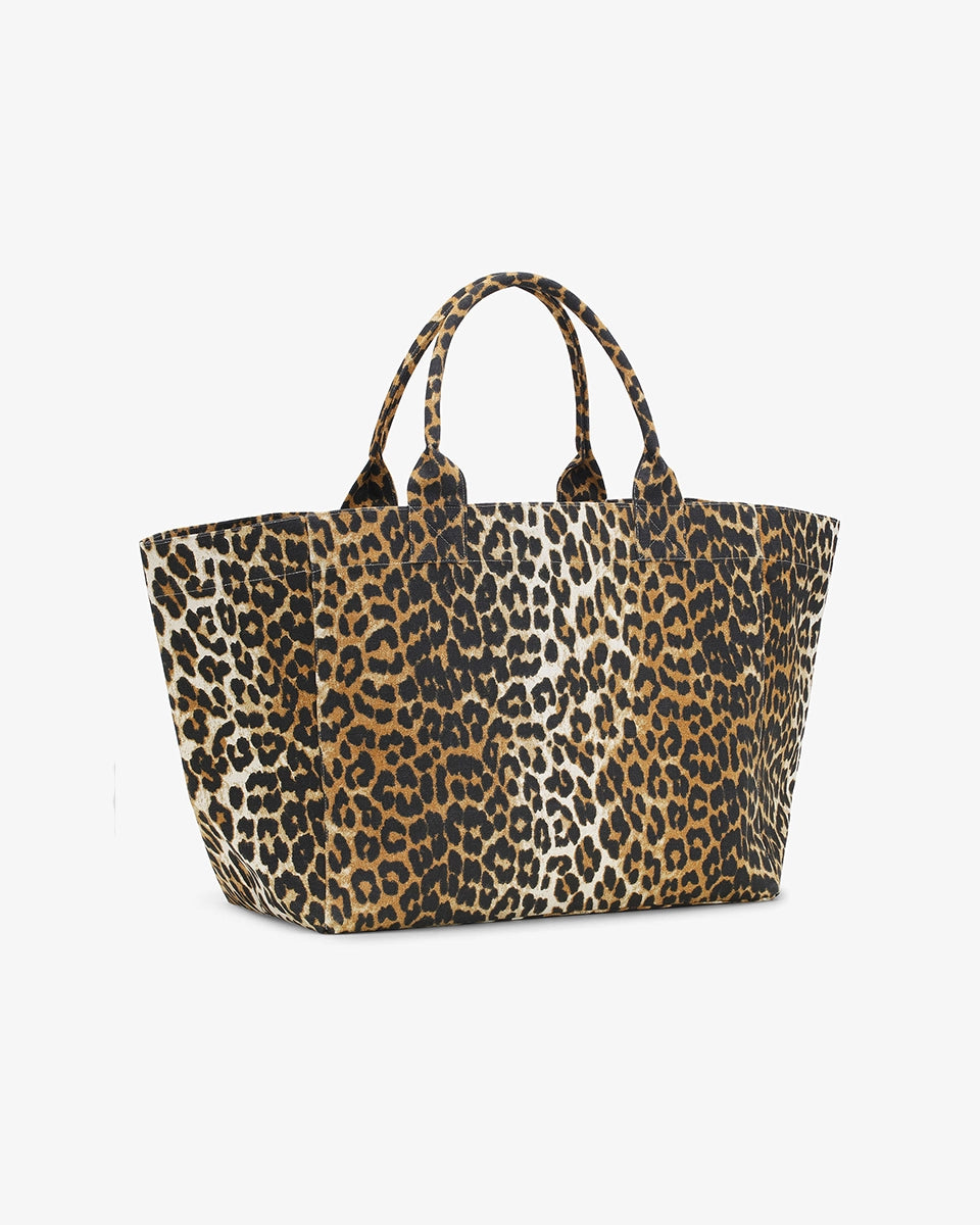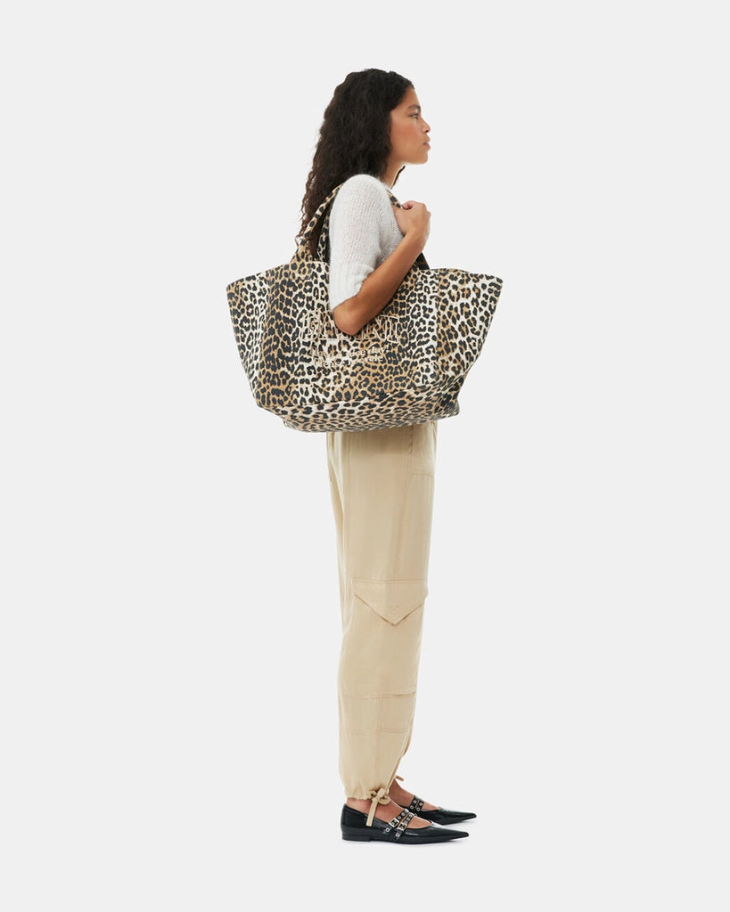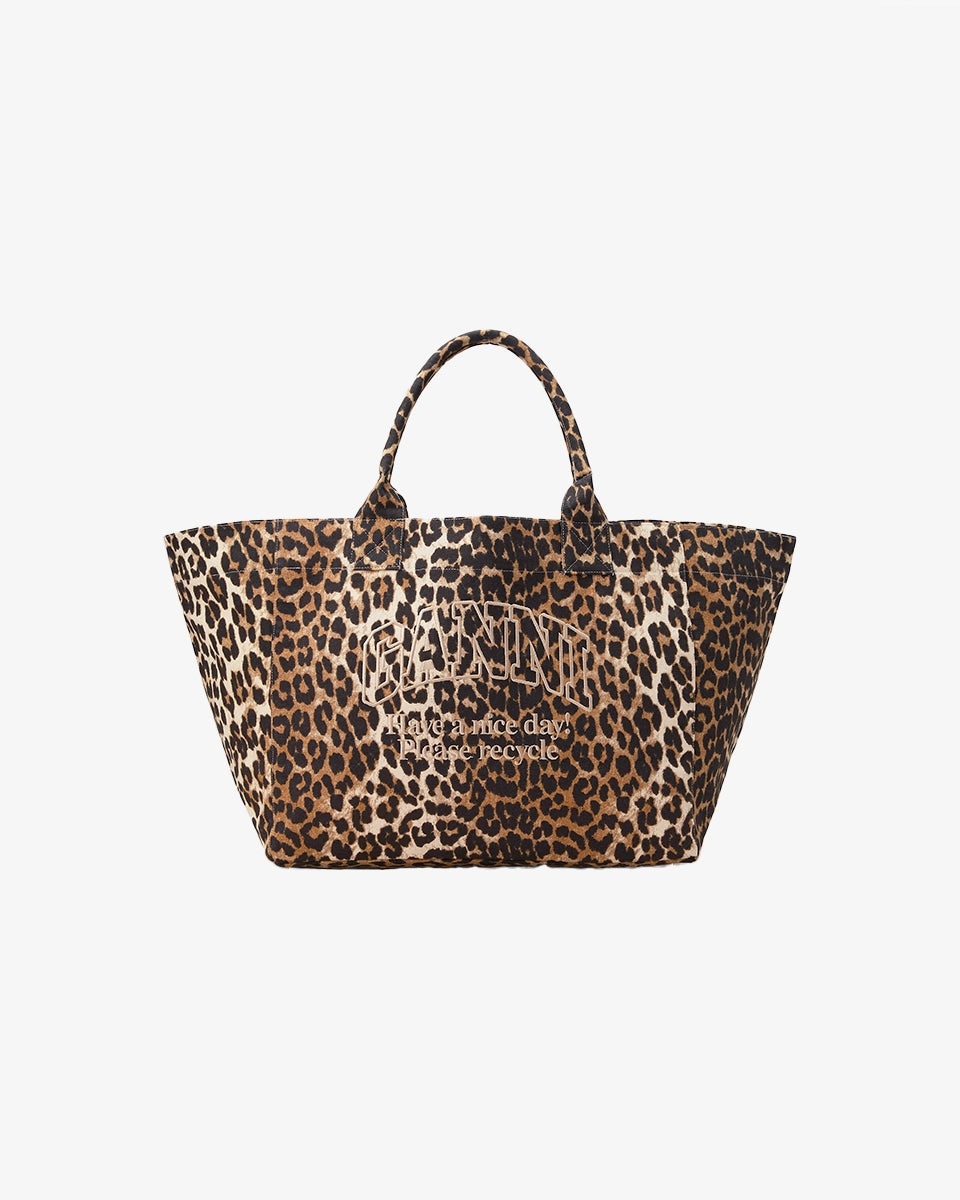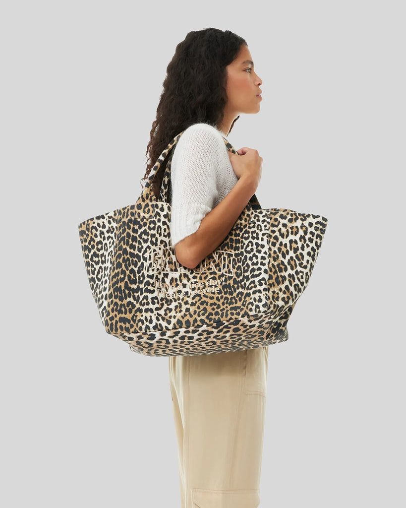 Duża, płócienna torba shopper 5822 XXL GANNI w print w panterę. Z przodu posiada haftowane logo marki i napis "Have a nice day? Please recycle". Torba ma dwie rączki do wygodnego trzymania w dłoni i na ramieniu. Wykonana z grubej, sztywnej, bawełnianej tkaniny. Idealna na zakupy, do pracy, a nawet na siłownię czy weekendowy wypad za miasto.