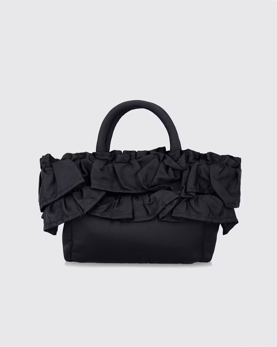 Torba typu tote 7187 Mini Shopper Black marki GANNI z uchwytami i paskiem na ramię. Posiada jedną dużą komorę z wewnętrzną kieszenią zapinaną na zamek. U dołu znajduje się niewielkie logo marki. Wyjątkowości dodaje zdobienie w postaci falbanek. Zaprojektowana, aby pomieścić najpotrzebniejsze drobiazgi.