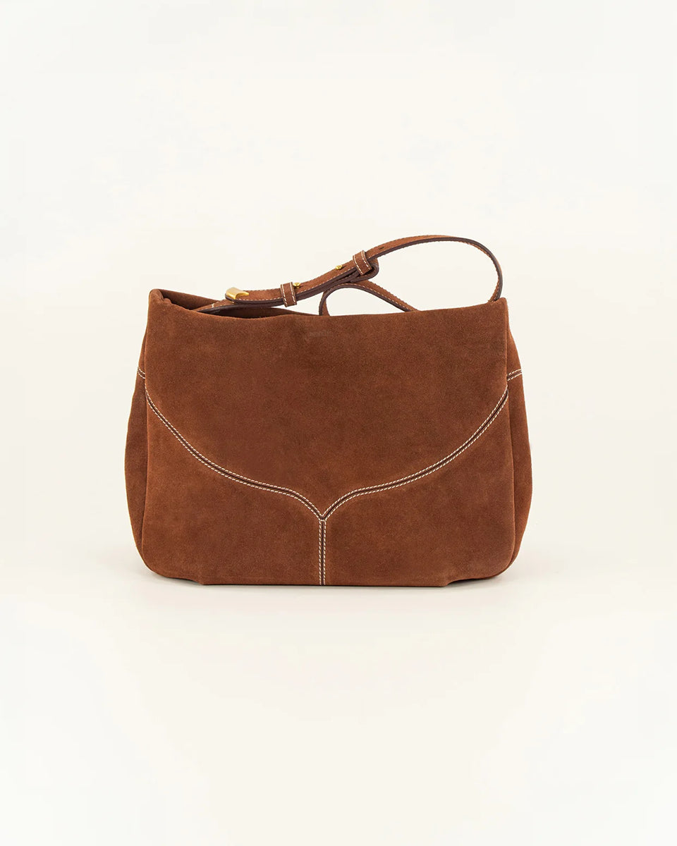 Miękka, brązowa torba DIVILIO Mahogany typu hobo z zamszu bydlęcego z ozdobnymi przeszyciami. Posiada dużą kieszeń centralną z jedną kieszenią naszywaną. Torba zapinana jest na metalowy zamek błyskawiczny.