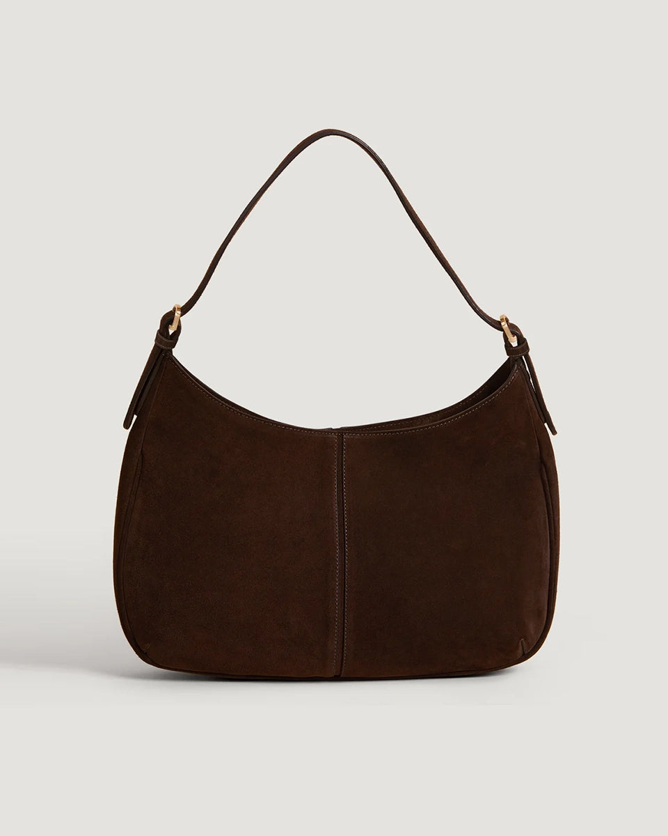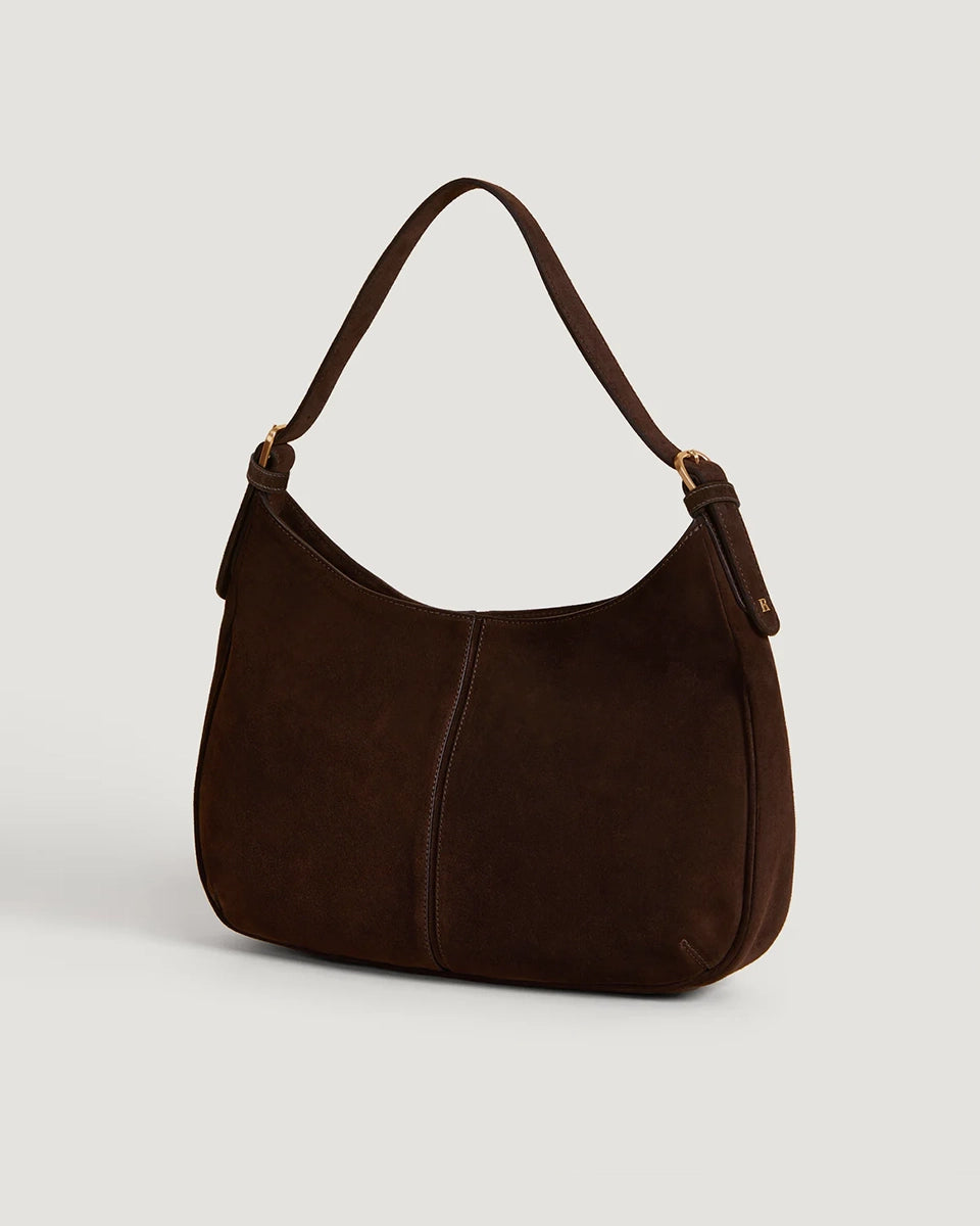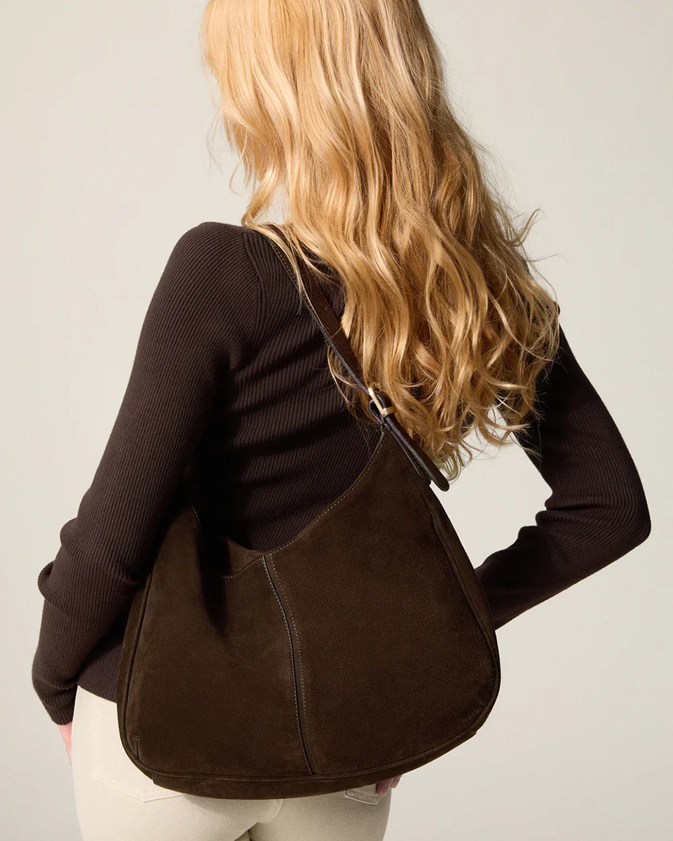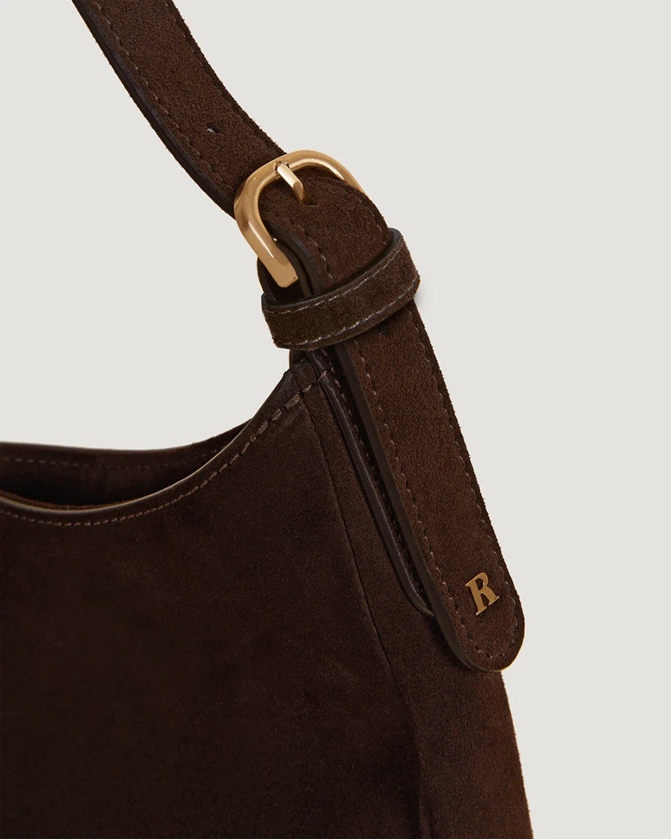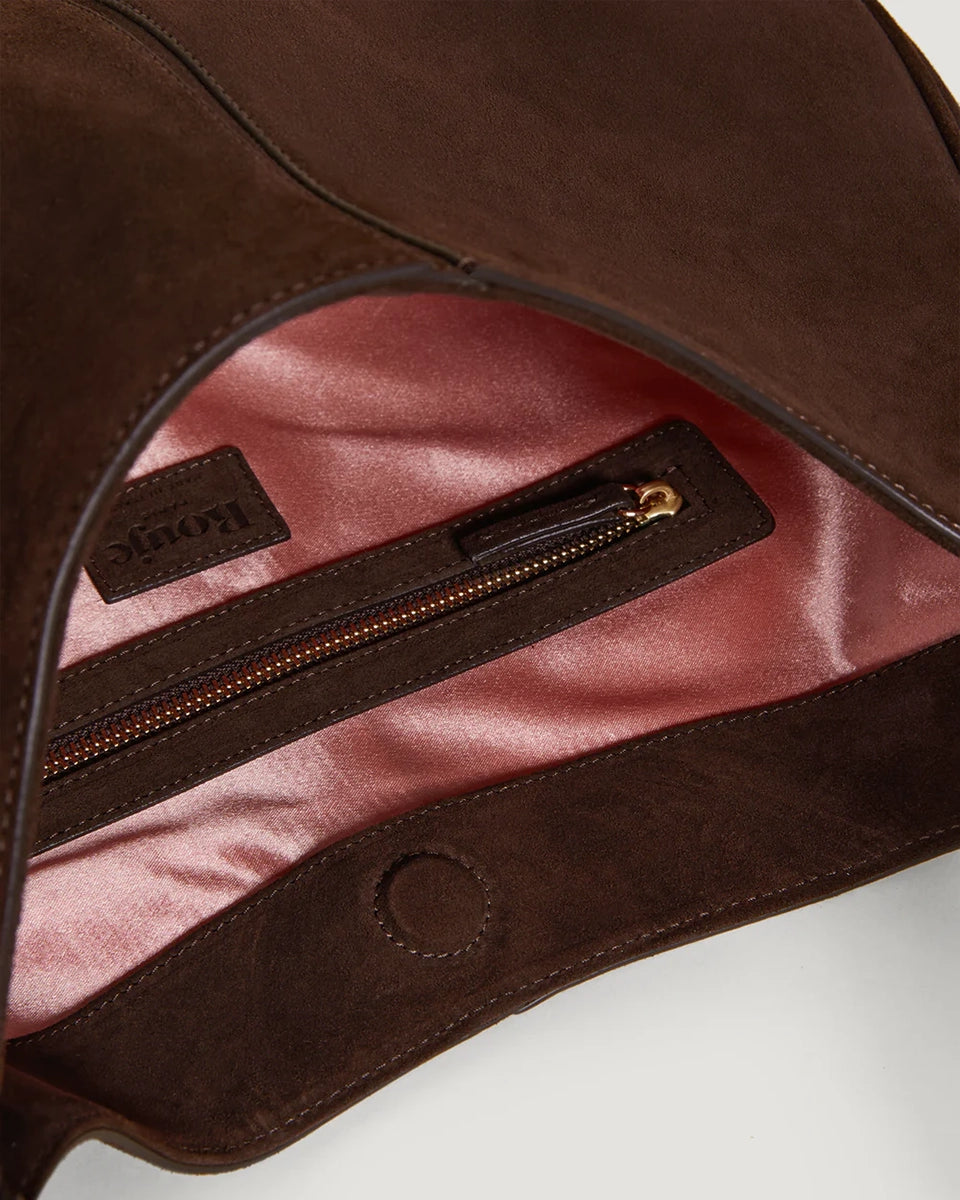 Zamszowa, brązowa torebka o średniej wielkości Big Rouje z zaokrąglonymi kątami i krótkim, regulowanym paskiem do wygodnego trzymania w dłoni i zawieszenia na ramieniu. Zapinana za pomocą magnesu. Wewnątrz obszyta różową, satynową podszewką. W środku posiada niewielką, zapinaną na zamek błyskawiczny kieszonkę na najważniejsze drobiazgi. Wykonana we Włoszech.