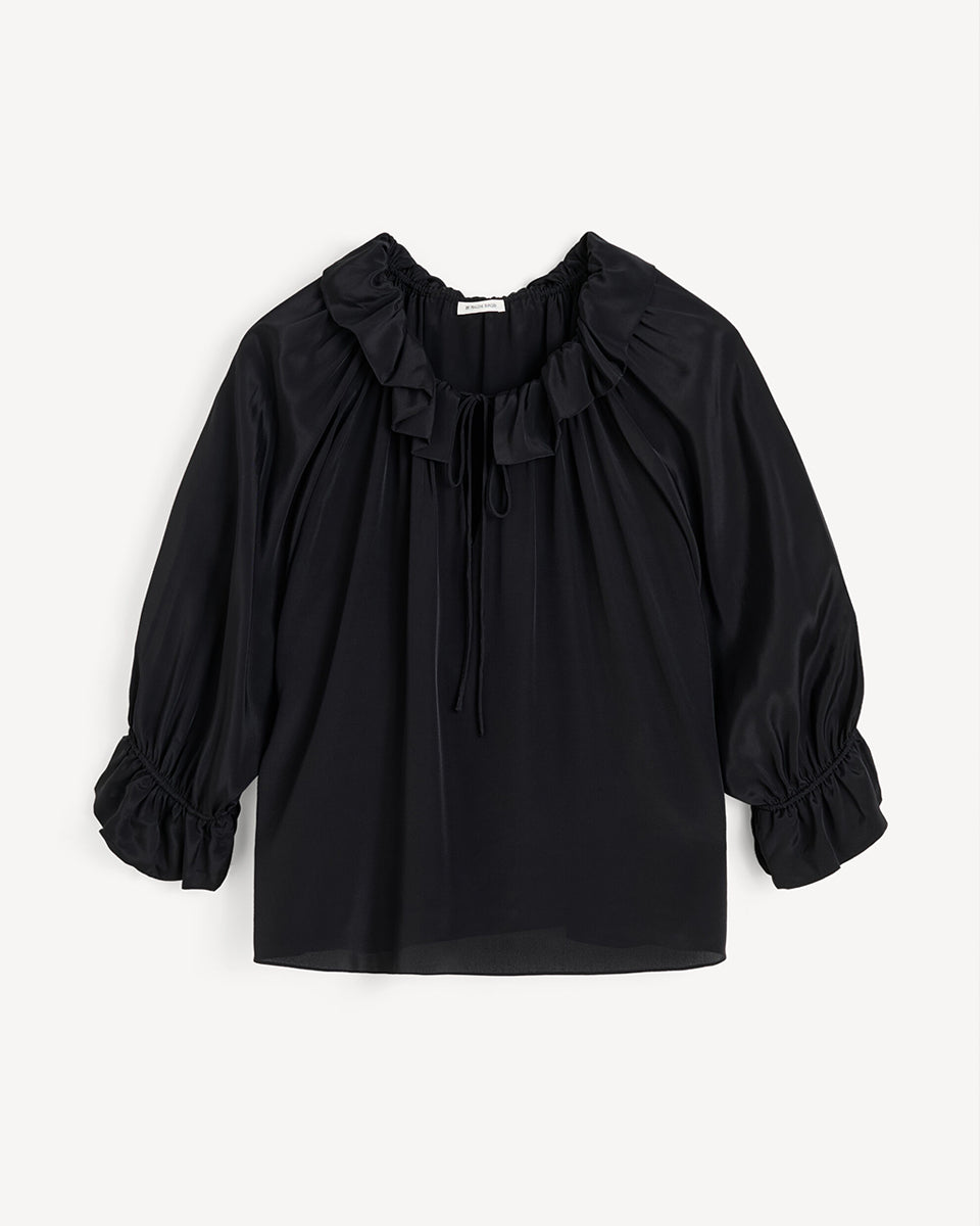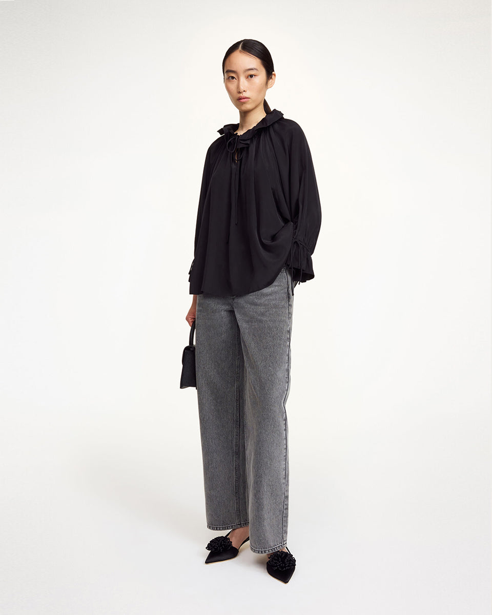 Oversizowa, lekka bluzka Dicte Black By Malene Birger z szerokimi rękawami 7/8, które zakończone są efektowną falbaną oraz ściągaczem, co tworzy delikatny efekt "bombki". Posiada kołnierz ze stójką z gęstym marszczeniem i falbaną. Dekolt jest rozcięty i posiada troczki, które można związać lub pozostawić luźno. Dół wykończony na prosto pozwala nosić bluzkę zarówno wypuszczoną, jak i luźno wpuszczoną w spodnie.