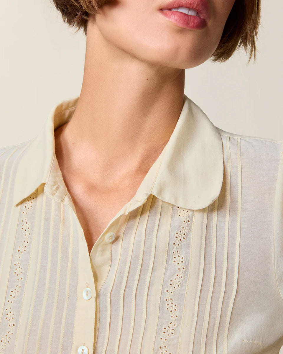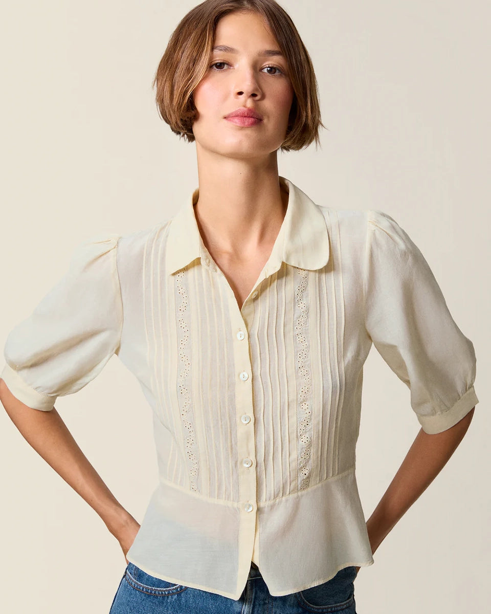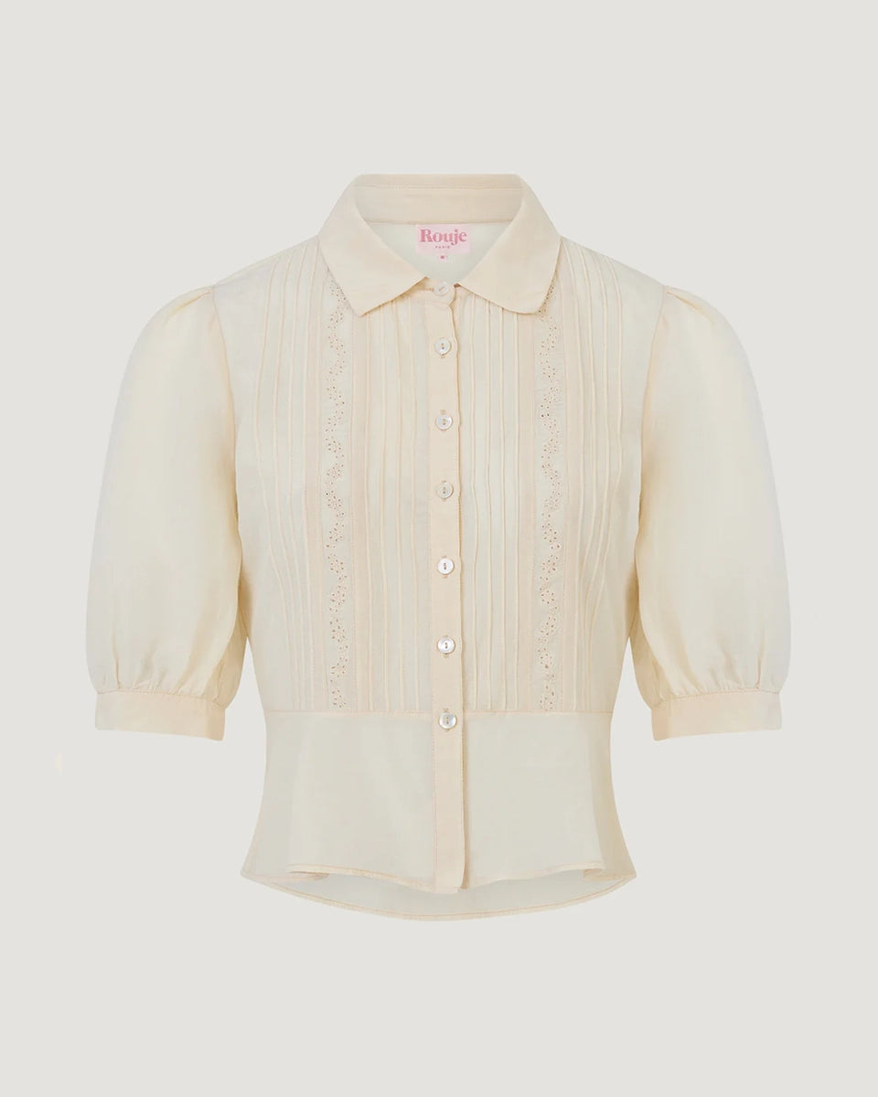 Luźna, kremowa bluzka Dorothea Rouje z krótkim, bufiastym rękawem i kołnierzykiem. Plisowana i haftowana na dekolcie. Zapinana na guziki z masy perłowej. Lekko wcięta w talii. Wykonana z cienkiej i zwiewnej tkaniny z bawełny i wiskozy.