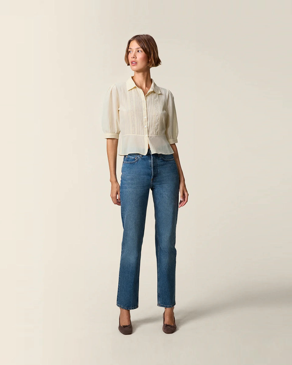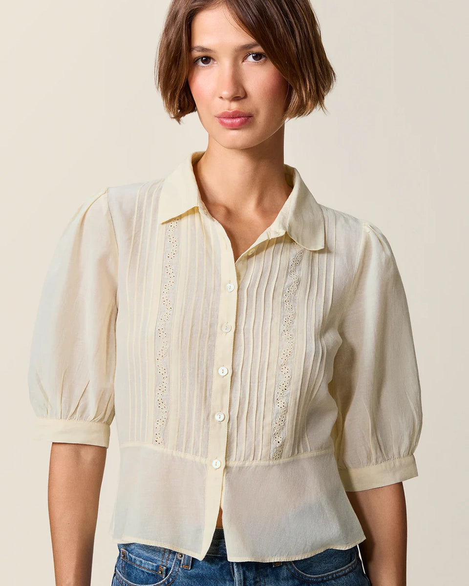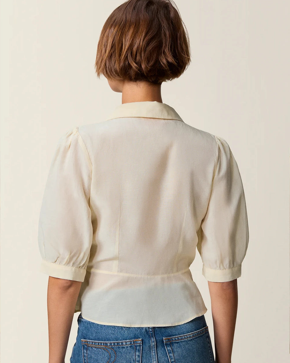 Luźna, kremowa bluzka Dorothea Rouje z krótkim, bufiastym rękawem i kołnierzykiem. Plisowana i haftowana na dekolcie. Zapinana na guziki z masy perłowej. Lekko wcięta w talii. Wykonana z cienkiej i zwiewnej tkaniny z bawełny i wiskozy.