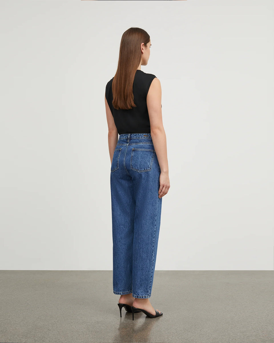 Luźne, niebieskie jeansy Allison SKALL ze średnim stanem i prostą, luźną, lekko skróconą nogawką. Spodnie mają pięć kieszeni i szlufki na pasek. Zapinane są na guzik i zamek błyskawiczny. Wykonane z organicznej, certyfikowanej bawełny. Z tyłu spodnie mają niewielkie, haftowane logo marki.