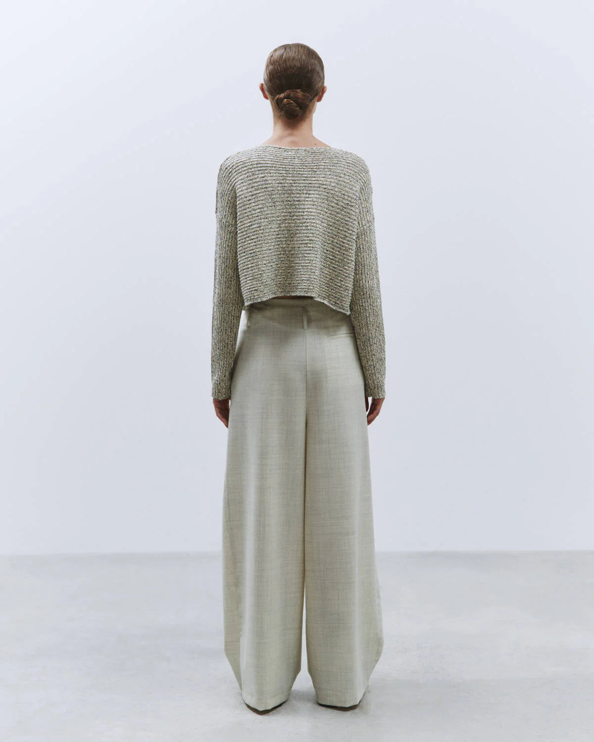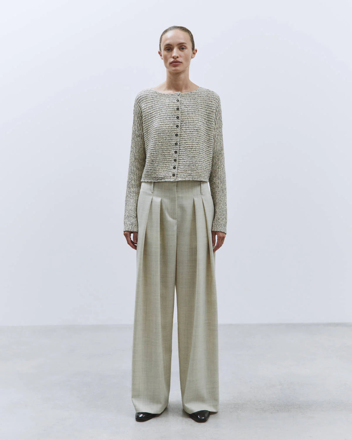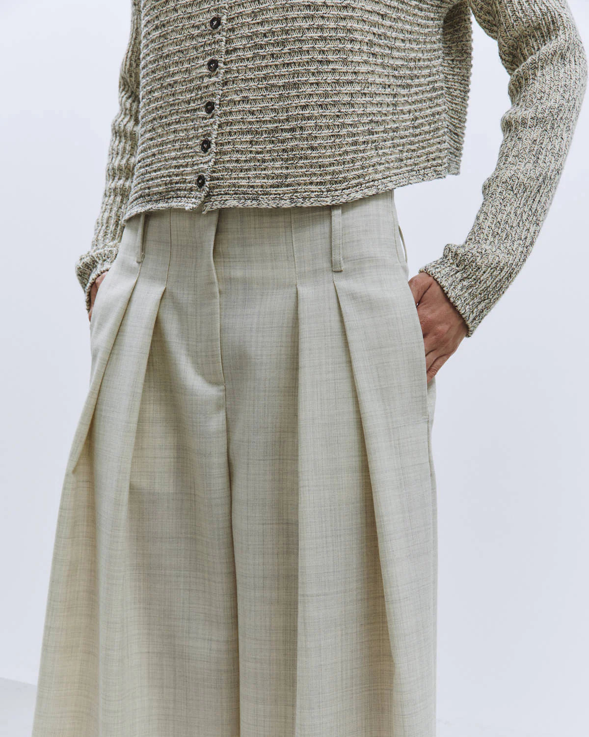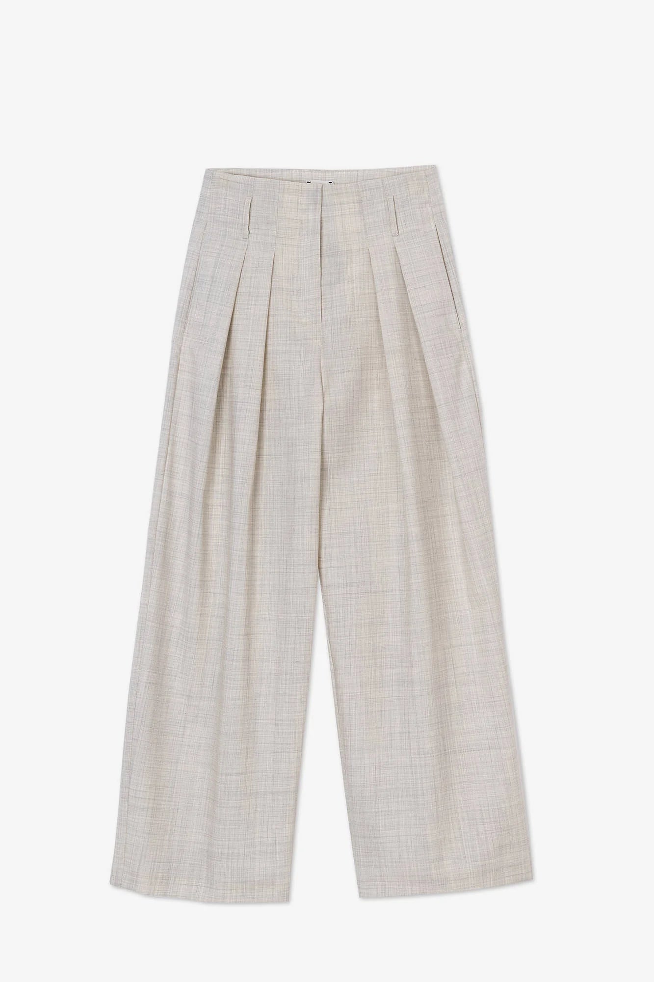 Cienkie, wełniane spodnie garniturowe z zakładkami. Posiadają wysoki stan i szeroką, prostą nogawkę. Spodnie mają dwie, boczne kieszenie. To ponadczasowy i ponadsezonowy klasyk. Połącz je z białą koszulą, krótkim kardiganem czy topem na ramiączkach. Idealne do pracy.