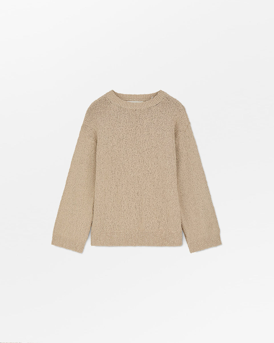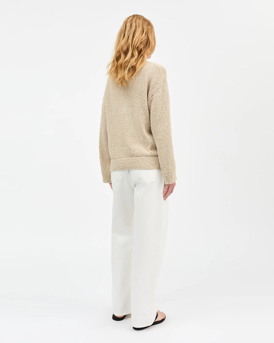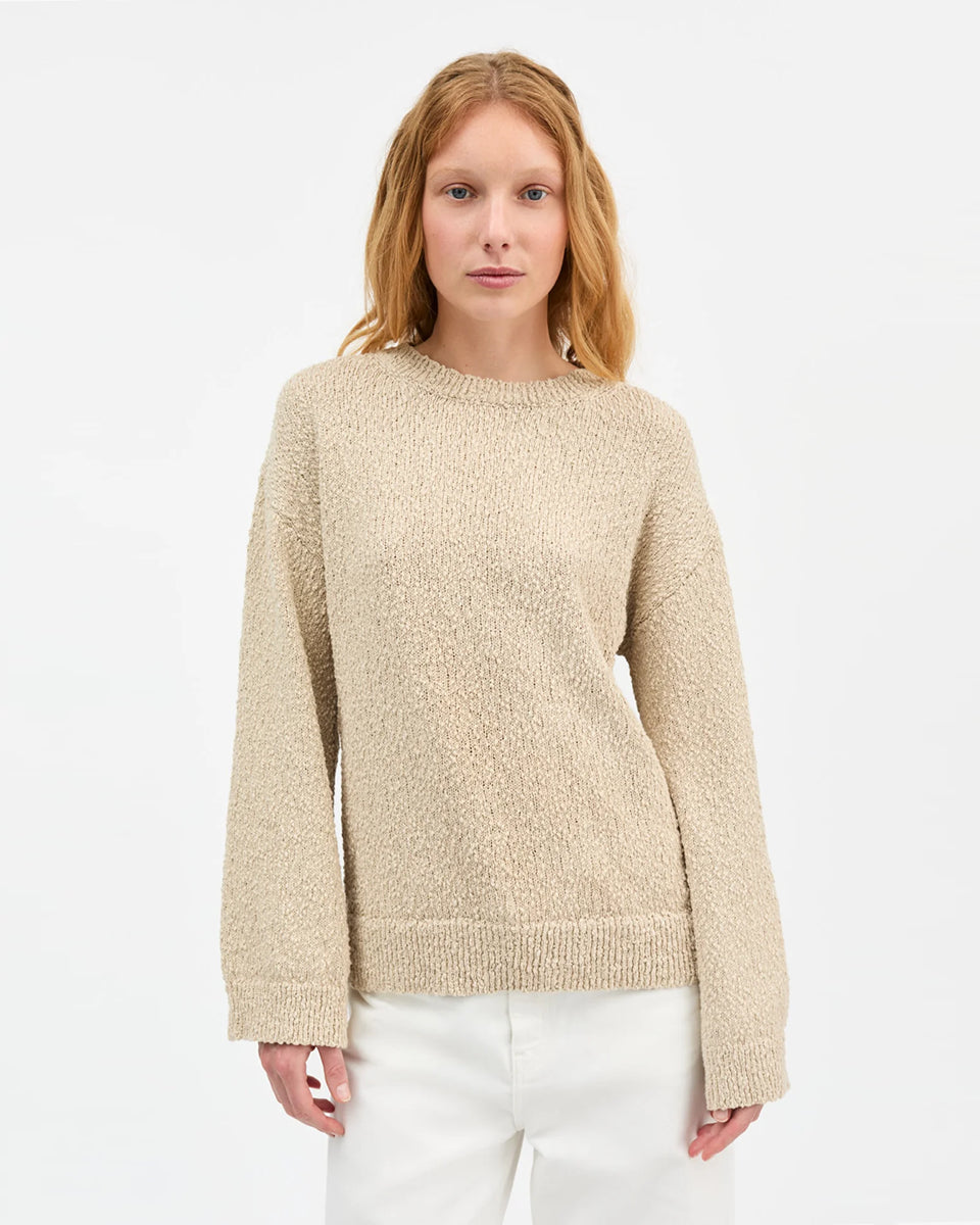 Lekko oversizowy, dzianinowy sweter Knightley Light Sand SKALL z okrągłym dekoltem i obniżonymi ramionami. Posiada ściągacz przy kołnierzu, makietach i u dołu. Wykonany ze strukturalnej bawełny organicznej. Idealnie sprawdzi się do ulubionych jeansów na codzień.