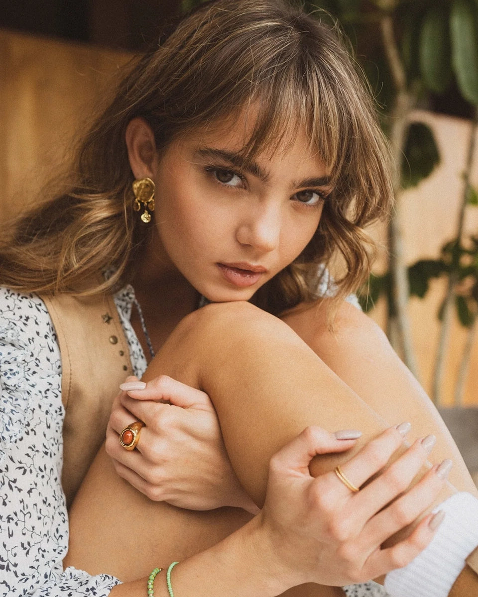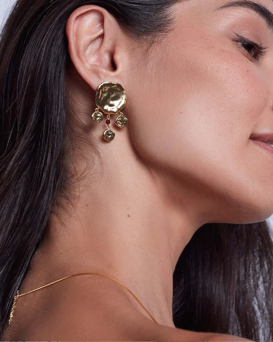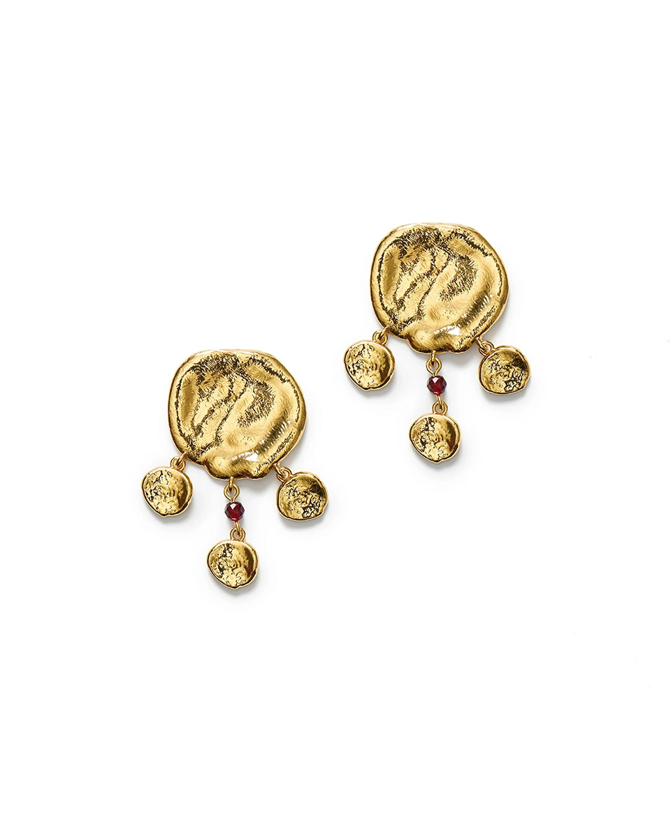 Eye-catching, large, gold-plated, boho-style Dream Catcher earrings with an irregular texture. They fasten with a stud.