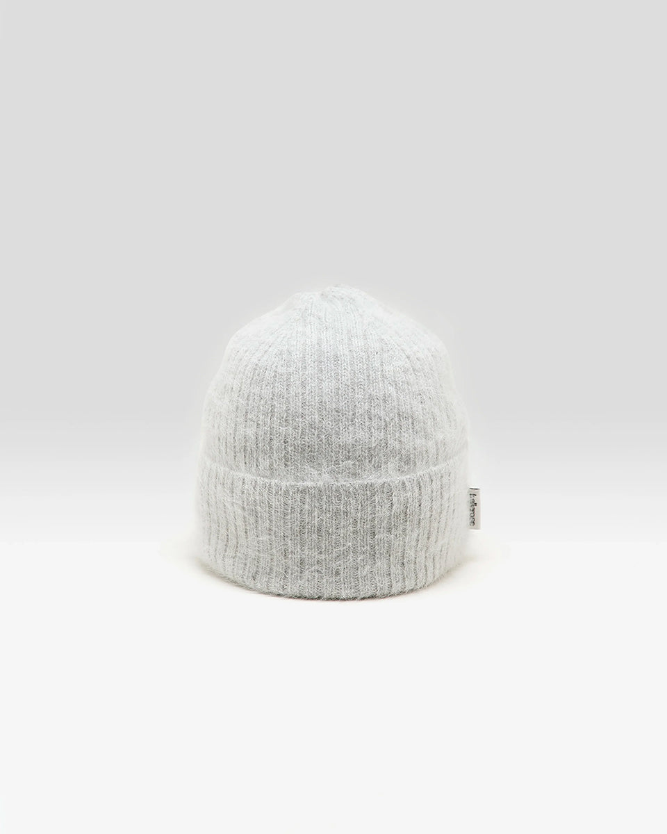 The classic, gray Datiz Bellerose fold-over angora beanie features a ribbed texture and a small brand logo tag.
