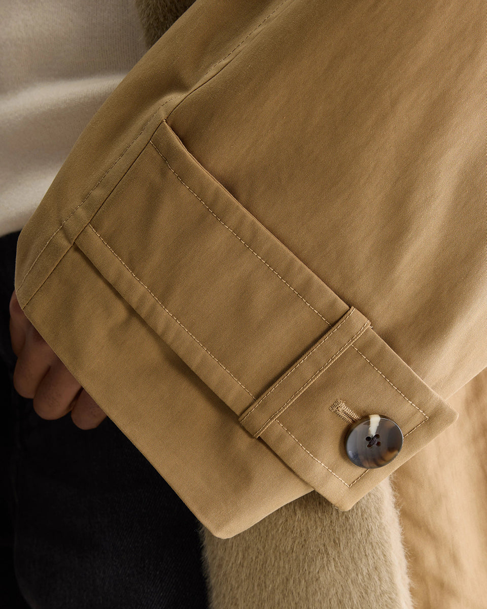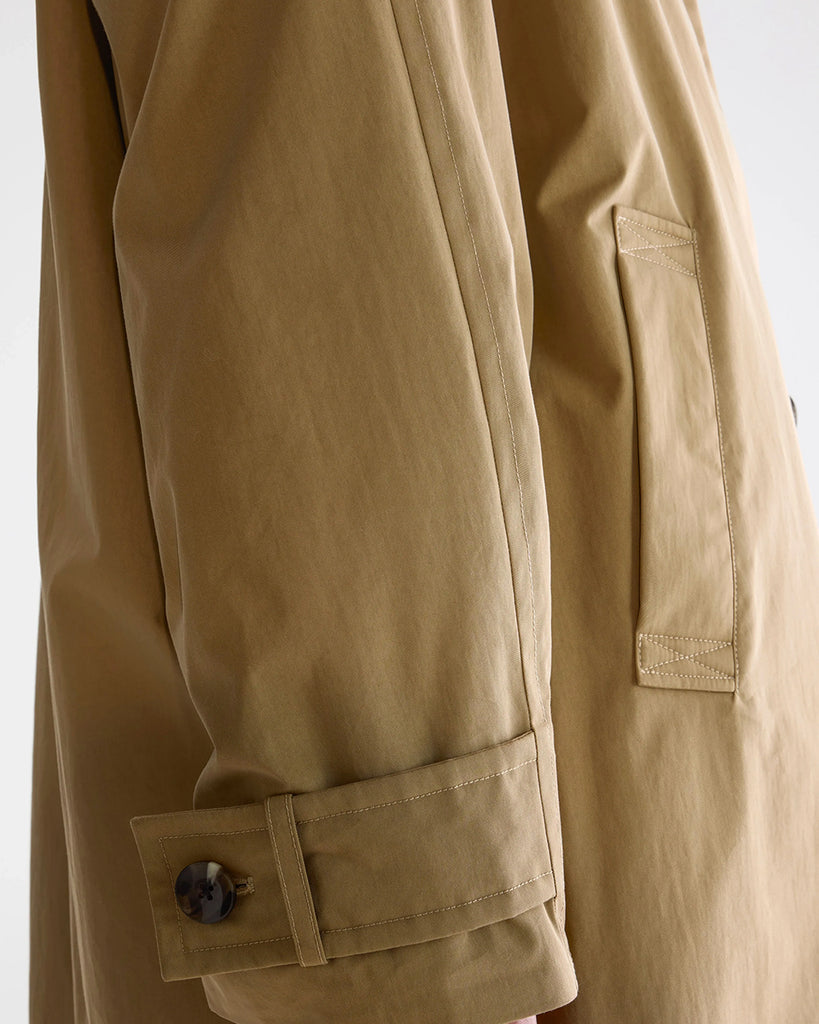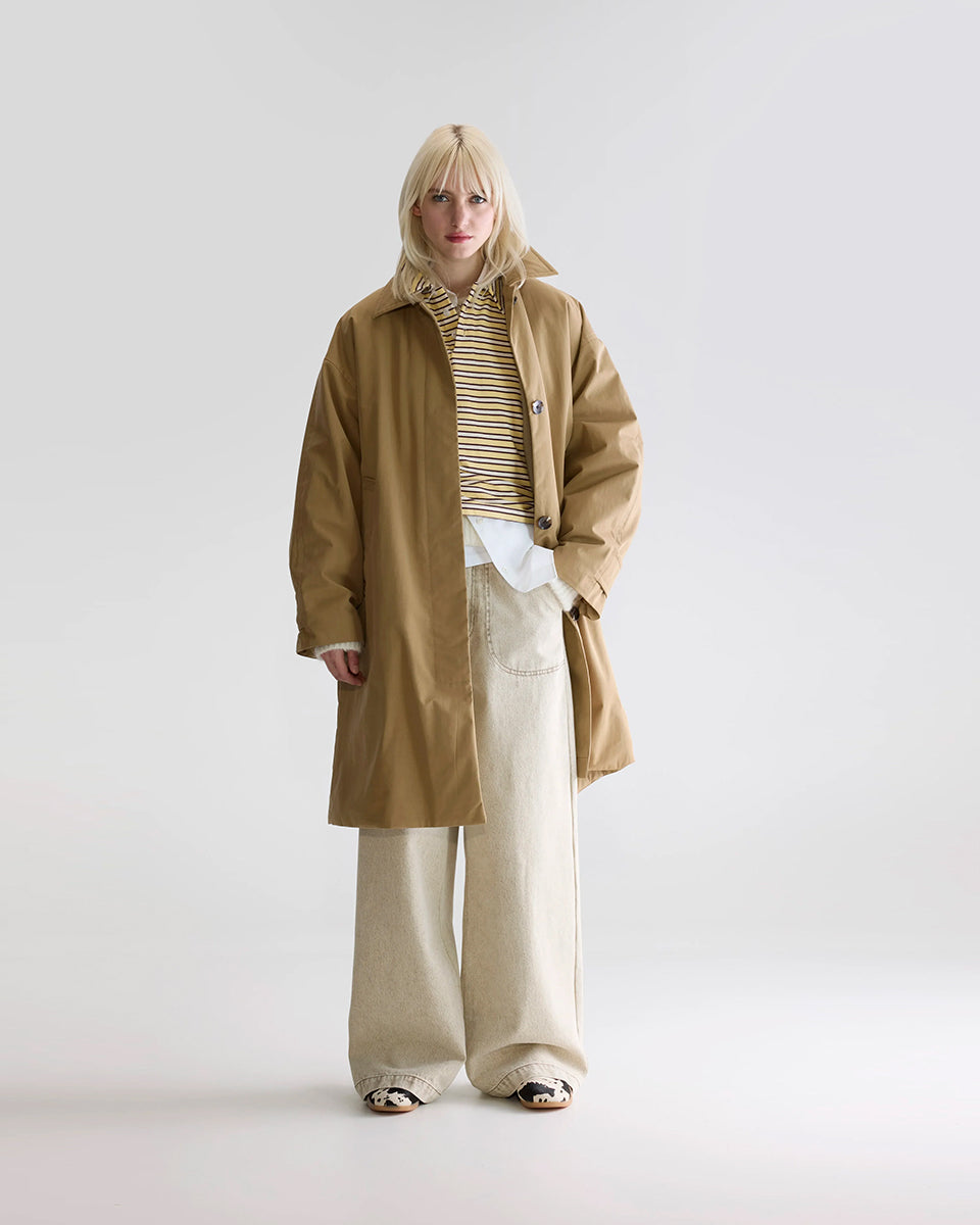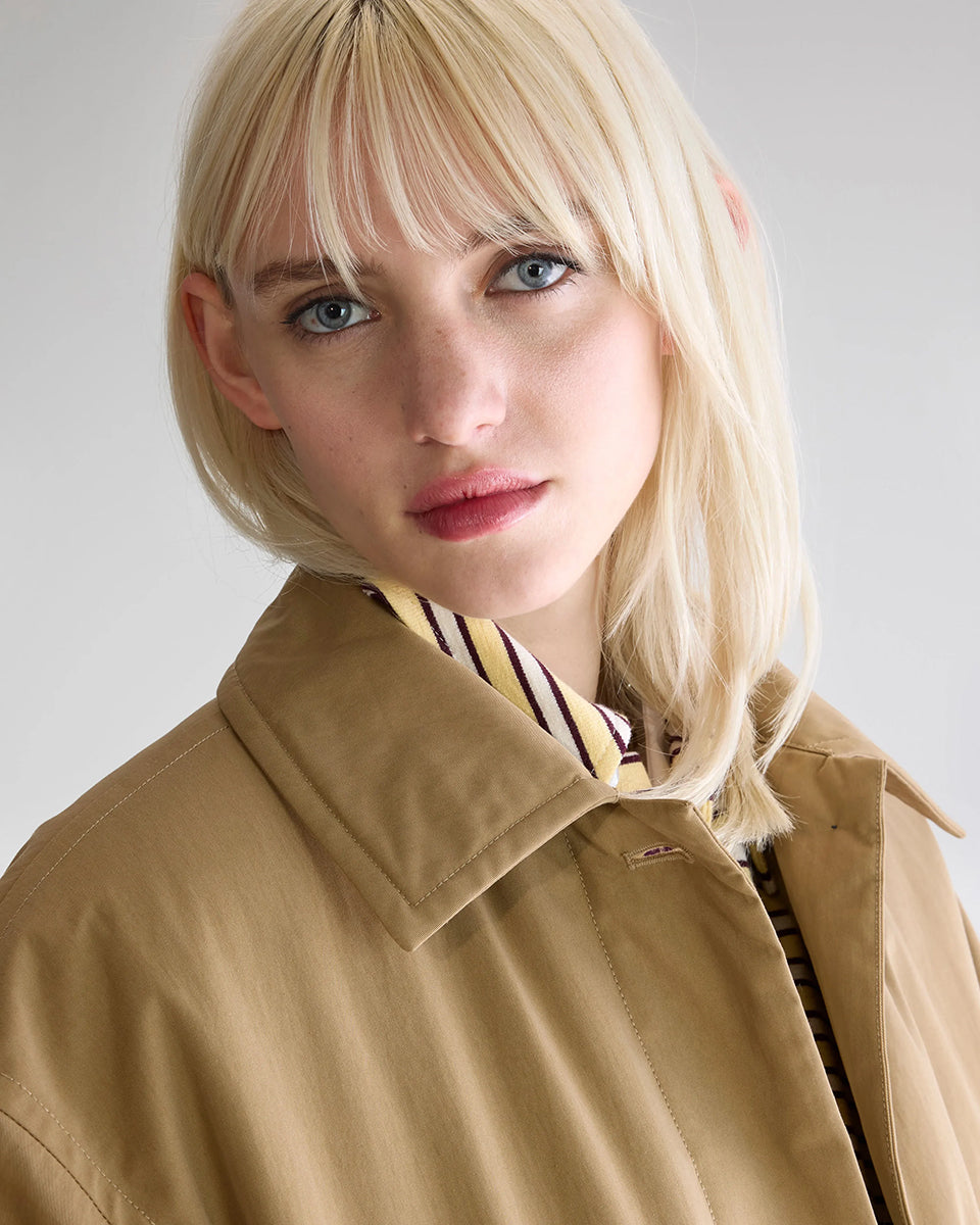 The long, oversized, thick Hestia Bellerose trench coat features a collar, dropped shoulders, and loose sleeves with strappy cuffs. It fastens with a single row of large buttons. The coat has a straight cut and two side pockets. It features a warm, thick lining made of soft, faux fur and a knee-length cut. Perfect for cold, winter days.