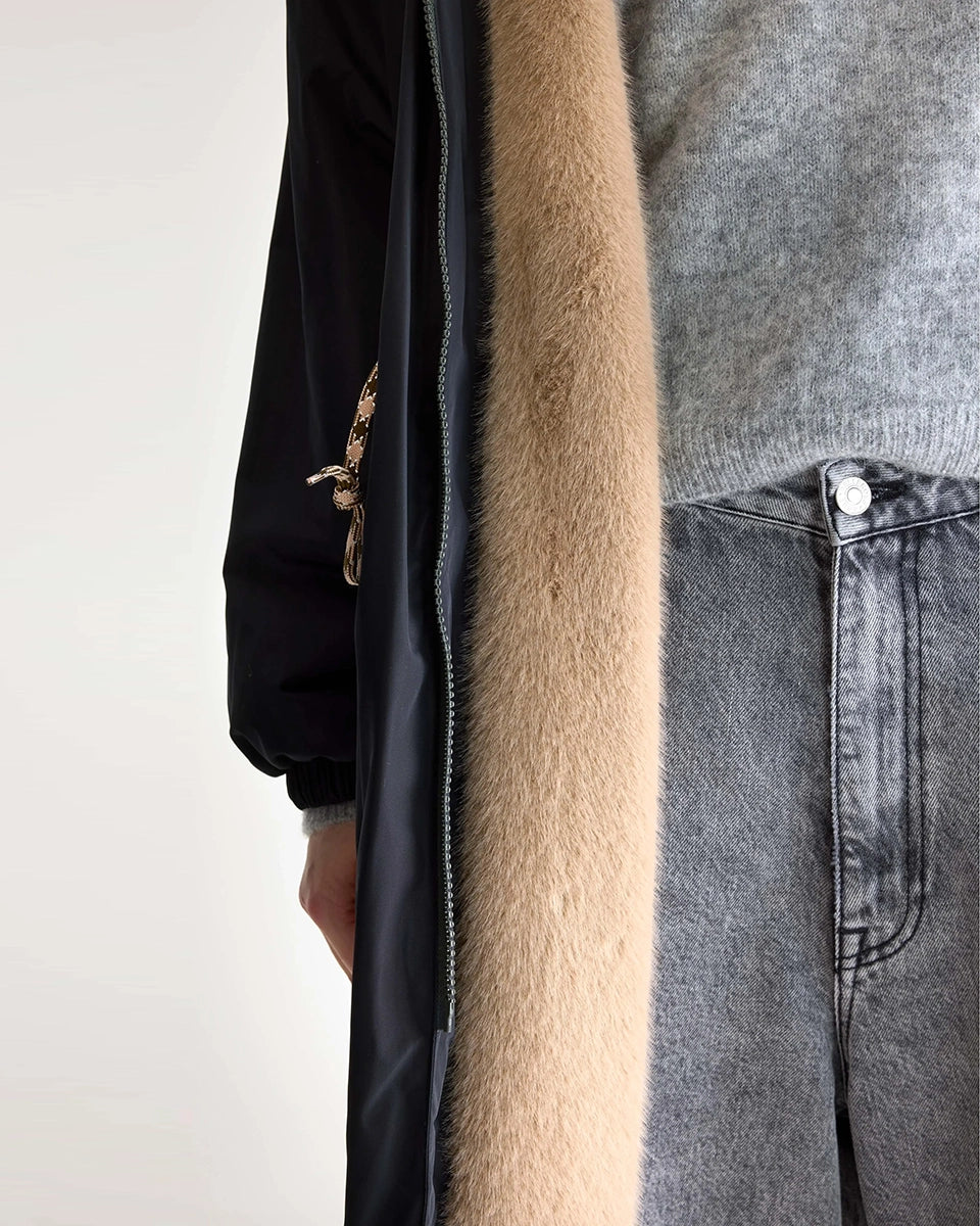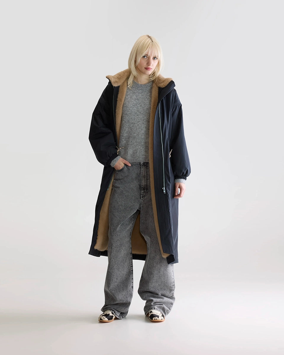 The long, navy blue Hosfo Bellerose coat features a hood, a high collar, and contrasting faux fur trim. It's both feminine and practical. It's tapered and ties at the waist. Made from a water-repellent fabric, the coat features two side pockets, ribbed cuffs, and a knee-length cut. It's the perfect choice for fall and winter.
